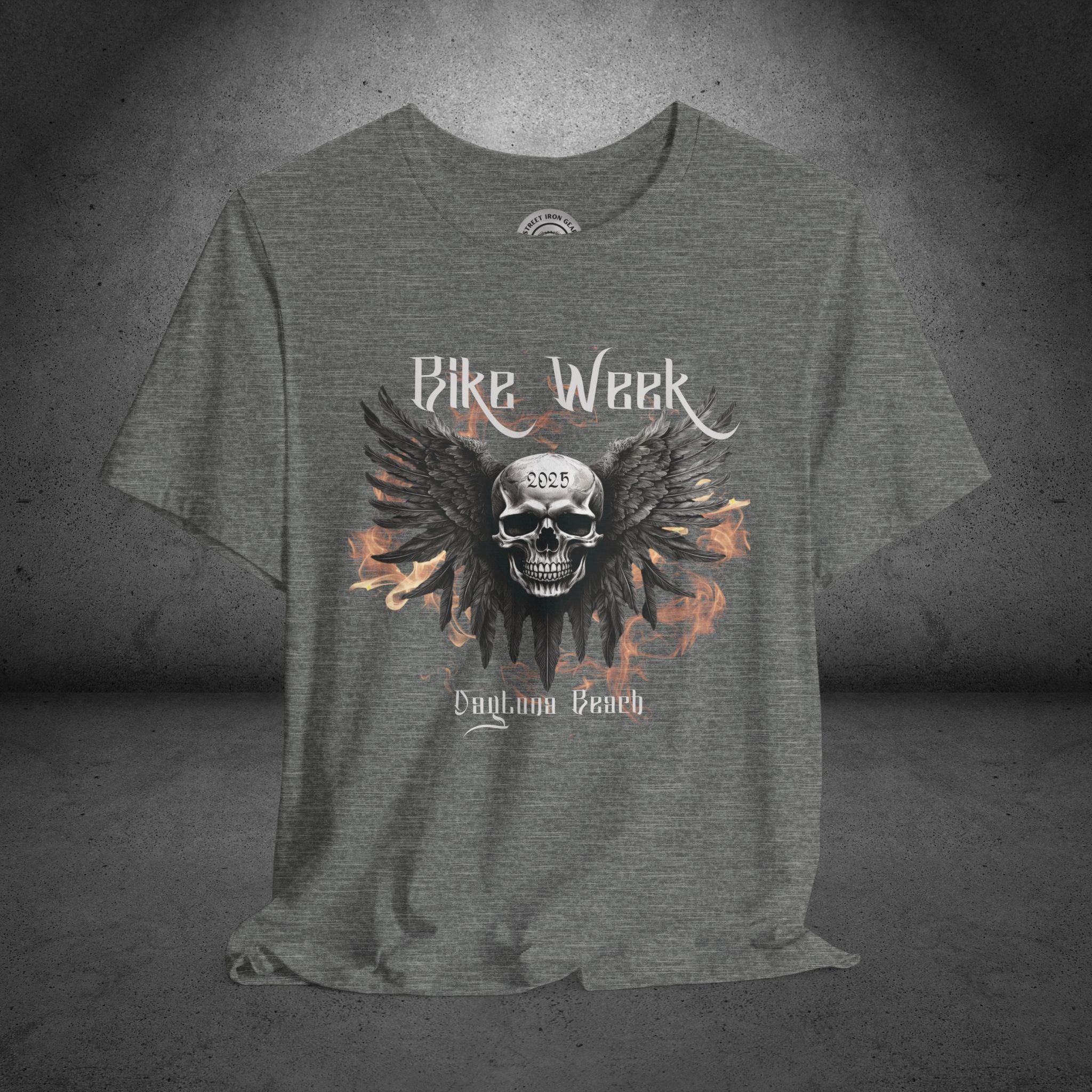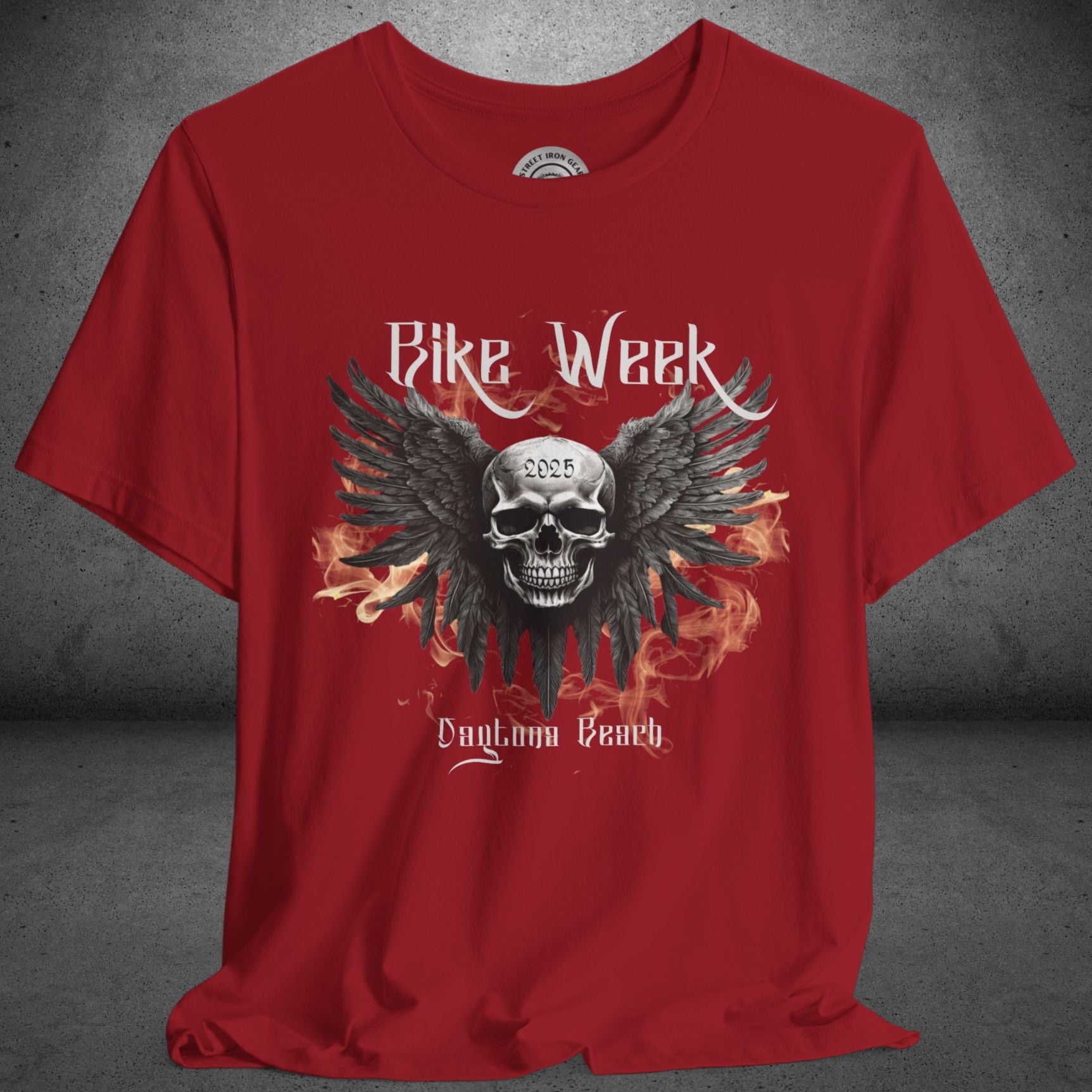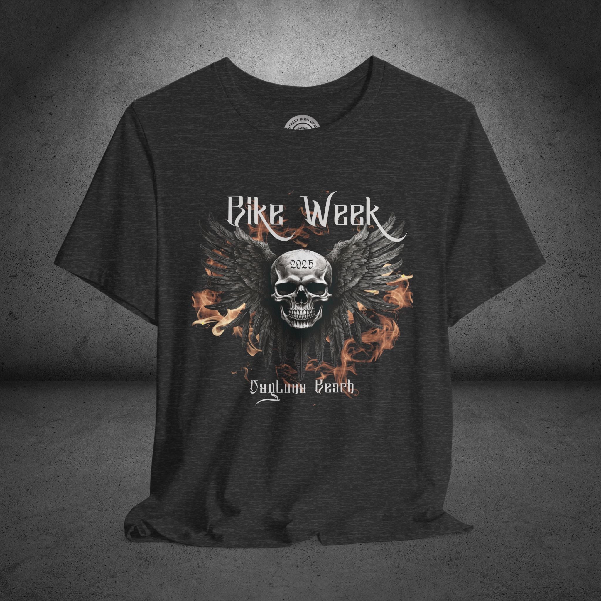 Hit the road in style with our Men's Daytona Beach Bike Week 2025 T-Shirt, featuring a striking gothic winged skull graphic with fiery background flames. The bold design includes "Bike Week 2025 Daytona Beach" text, making it the perfect keepsake for this iconic event. Available in a variety of colors and sizes up to 5XL, this comfortable and durable tee is a must-have for bikers and motorcycle enthusiasts alike.