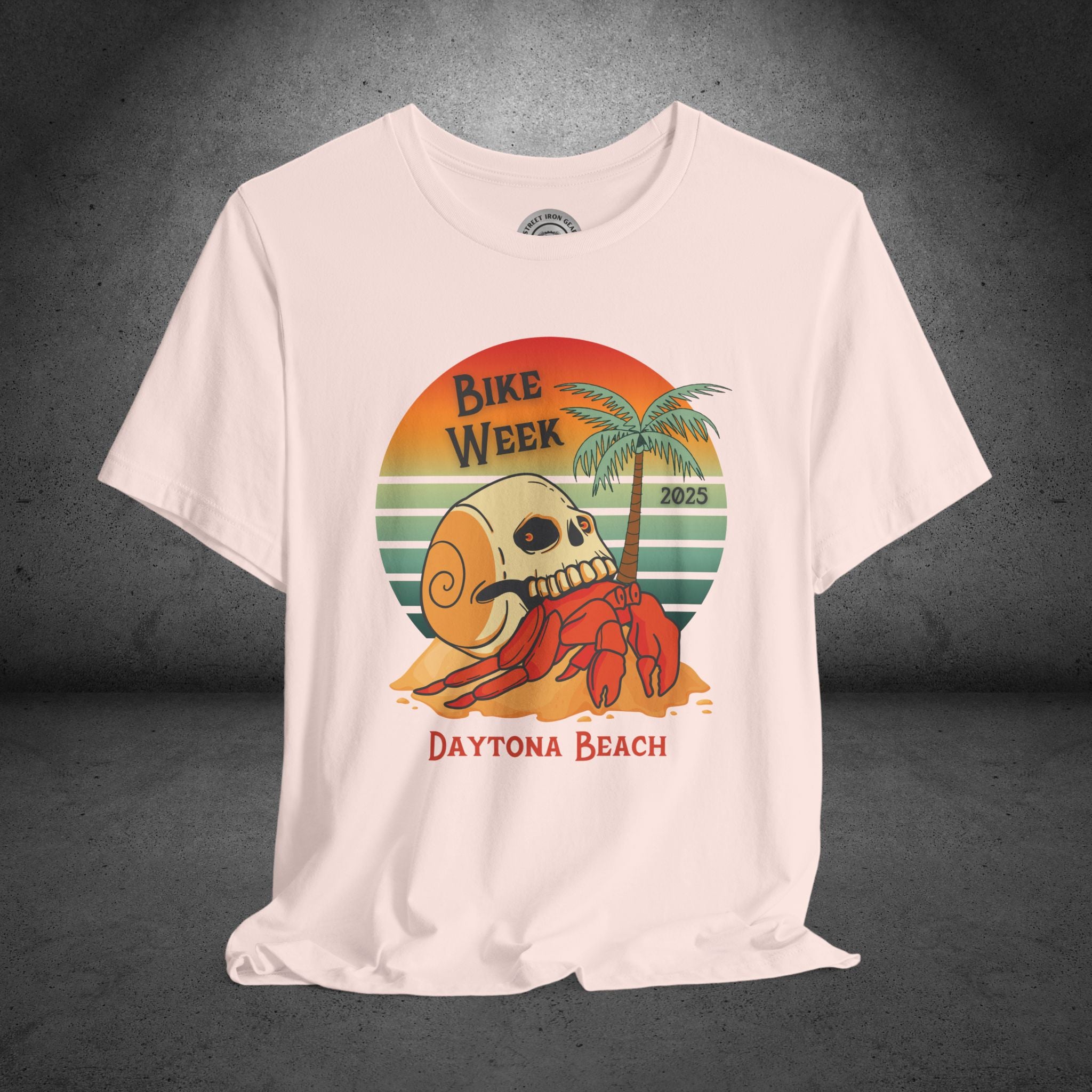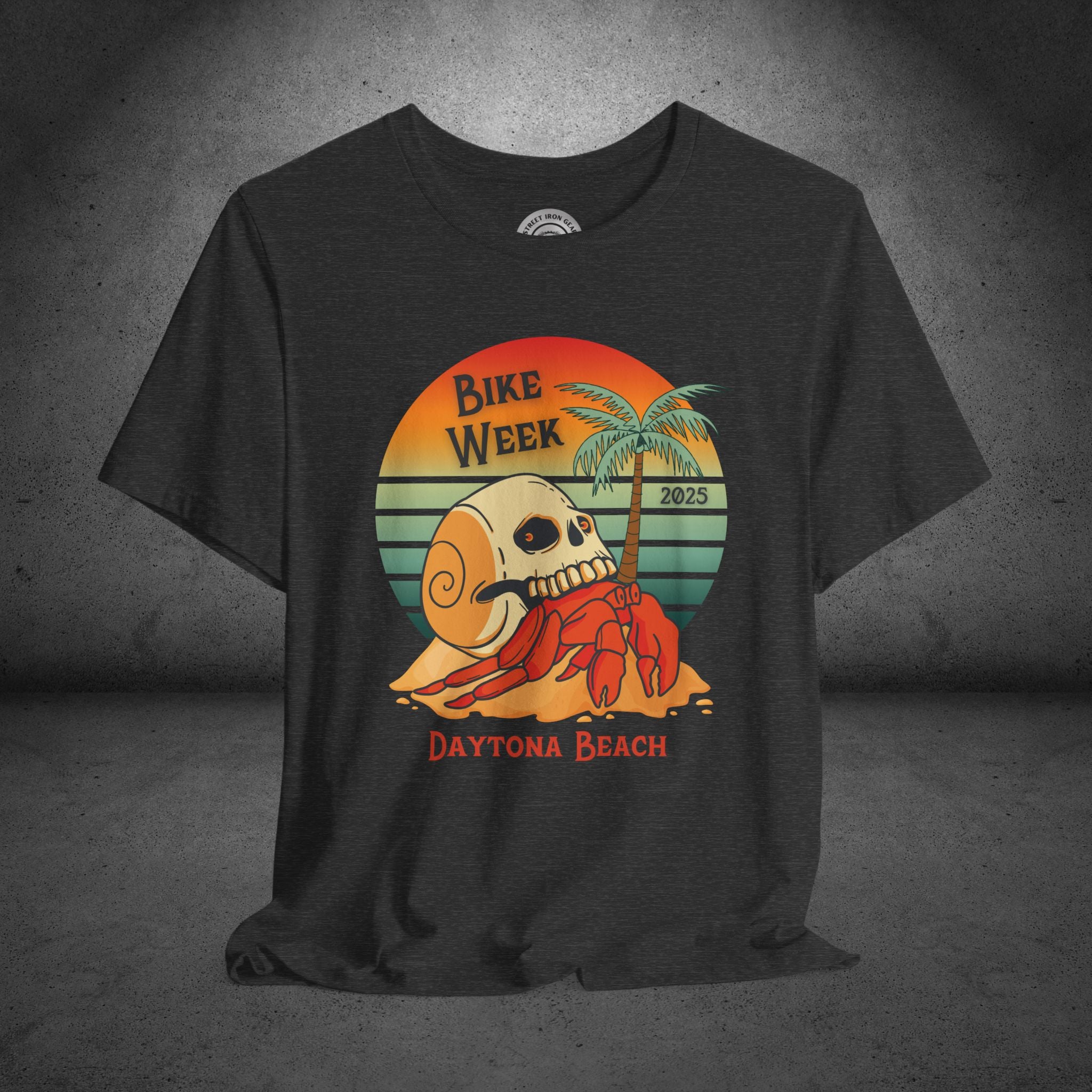 Celebrate the spirit of Daytona Beach Bike Week 2025 with this bold and unique T-shirt! Featuring a striking graphic of a skull on a beach eating a crab, set against a retro sunset with palm trees, this design perfectly captures the iconic vibe of Bike Week. Available in a variety of colors and sizes up to 5XL, this comfortable, high-quality tee is perfect for motorcycle enthusiasts and event attendees alike.