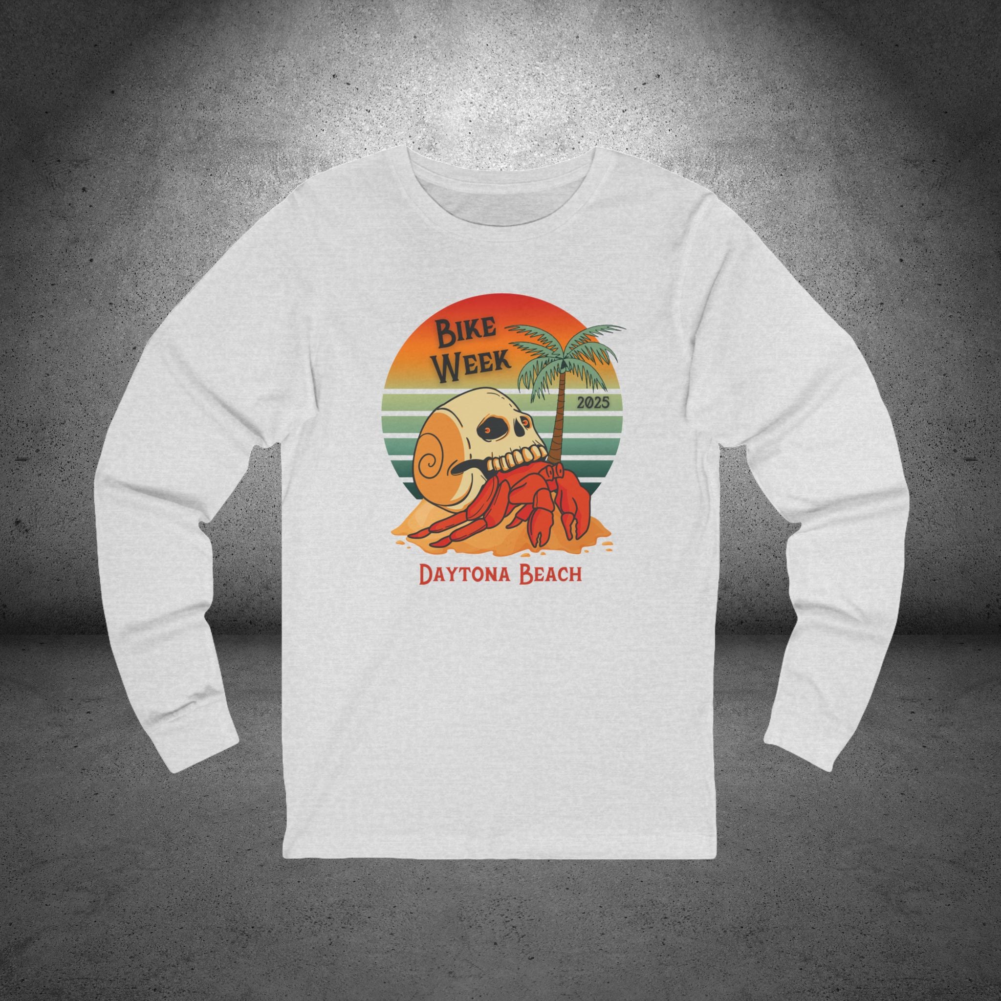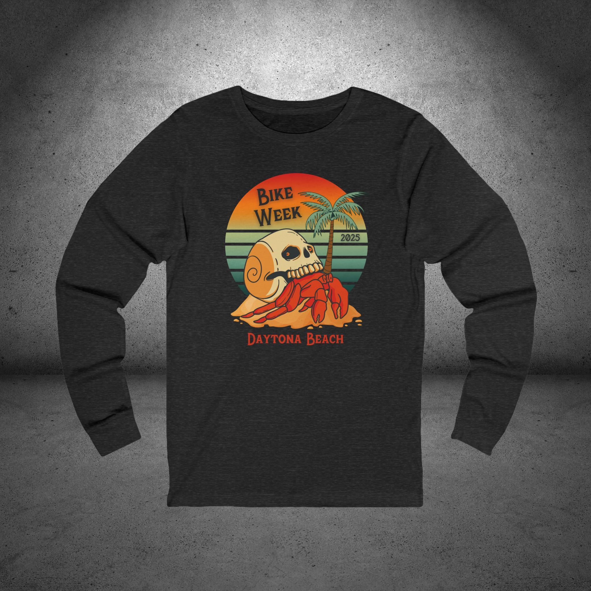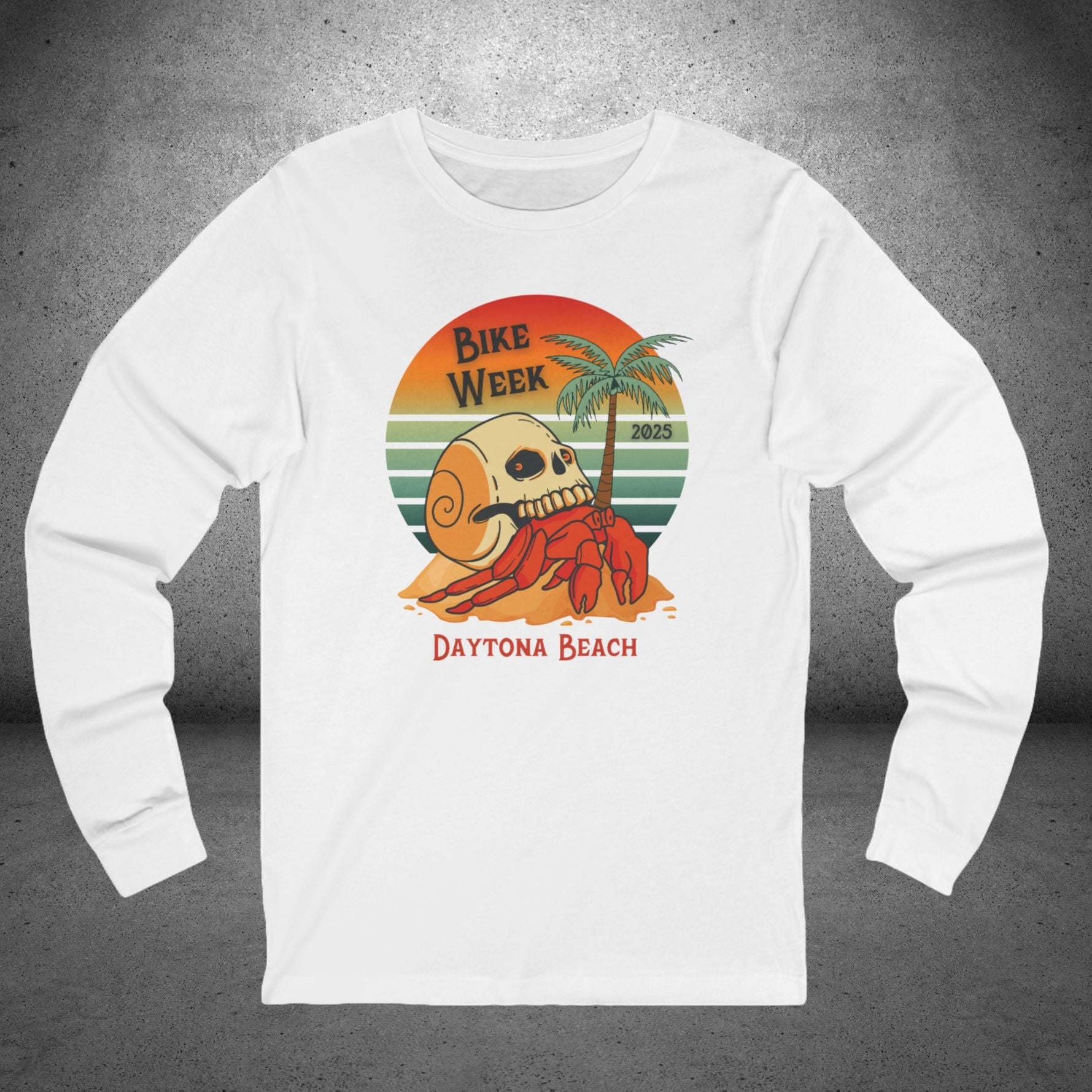 Celebrate the spirit of Daytona Beach Bike Week 2025 with this bold and unique T-shirt! Featuring a striking graphic of a skull on a beach eating a crab, set against a retro sunset with palm trees, this design perfectly captures the iconic vibe of Bike Week. Available in a variety of colors and sizes up to 2XL, this comfortable, high-quality tee is perfect for motorcycle enthusiasts and event attendees alike.s.