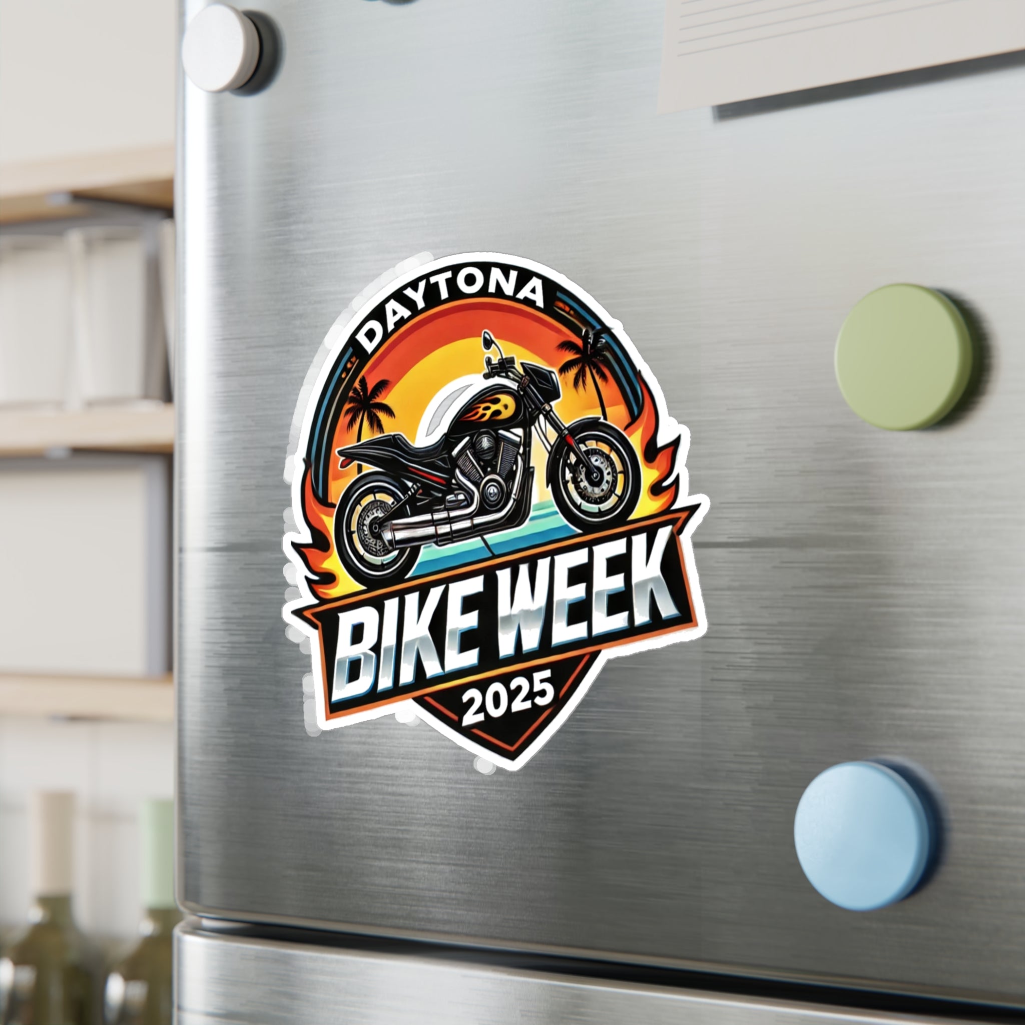 Commemorate the ultimate motorcycle event with our Daytona Beach Bike Week 2025 Kiss Cut Decal! Featuring a sleek cruiser with fiery flames and bold text reading "Daytona Bike Week 2025," this high-quality vinyl decal is perfect for helmets, motorcycle fenders, laptops, or car windows. Available in a variety of sizes from 3" to 8" square, it’s a must-have keepsake for every Bike Week enthusiast.