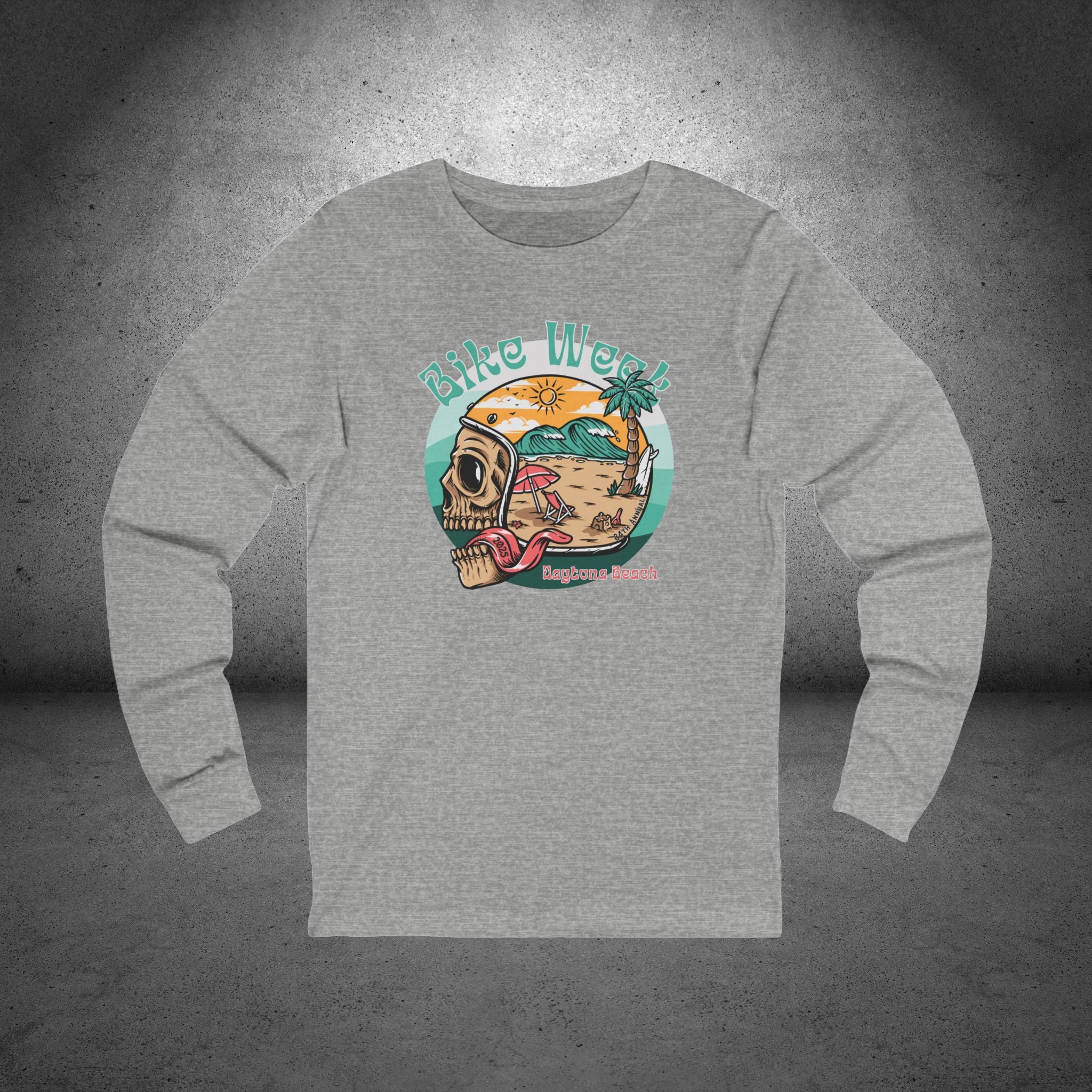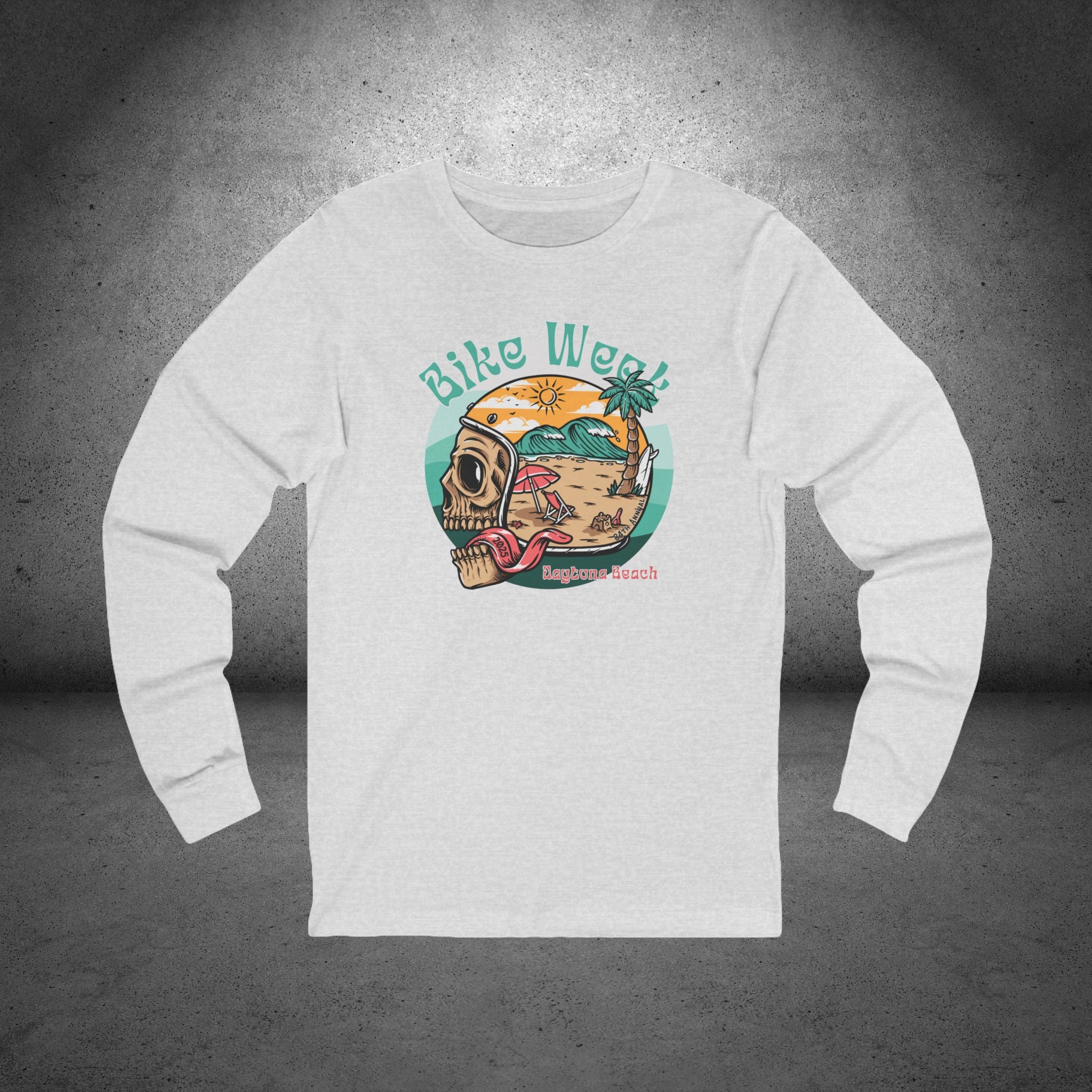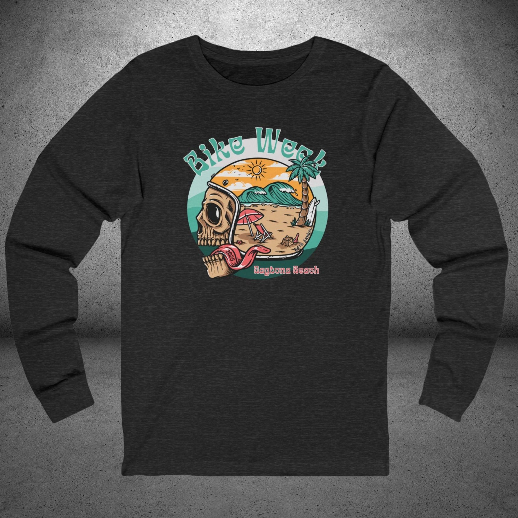 Gear up for the 84th Annual Daytona Beach Bike Week with this bold and stylish T-shirt! Featuring a striking graphic of a skull wearing a motorcycle helmet with a beach scene, retro sunset, and palm trees in the background, this design captures the spirit of the iconic event. The text "Bike Week Daytona Beach 2025" adds a commemorative touch, making it a perfect keepsake for attendees and motorcycle enthusiasts alike. Available in a variety of colors and sizes up to 2XL, this high-quality T-shirt ensures comfort and style for riders and fans.
