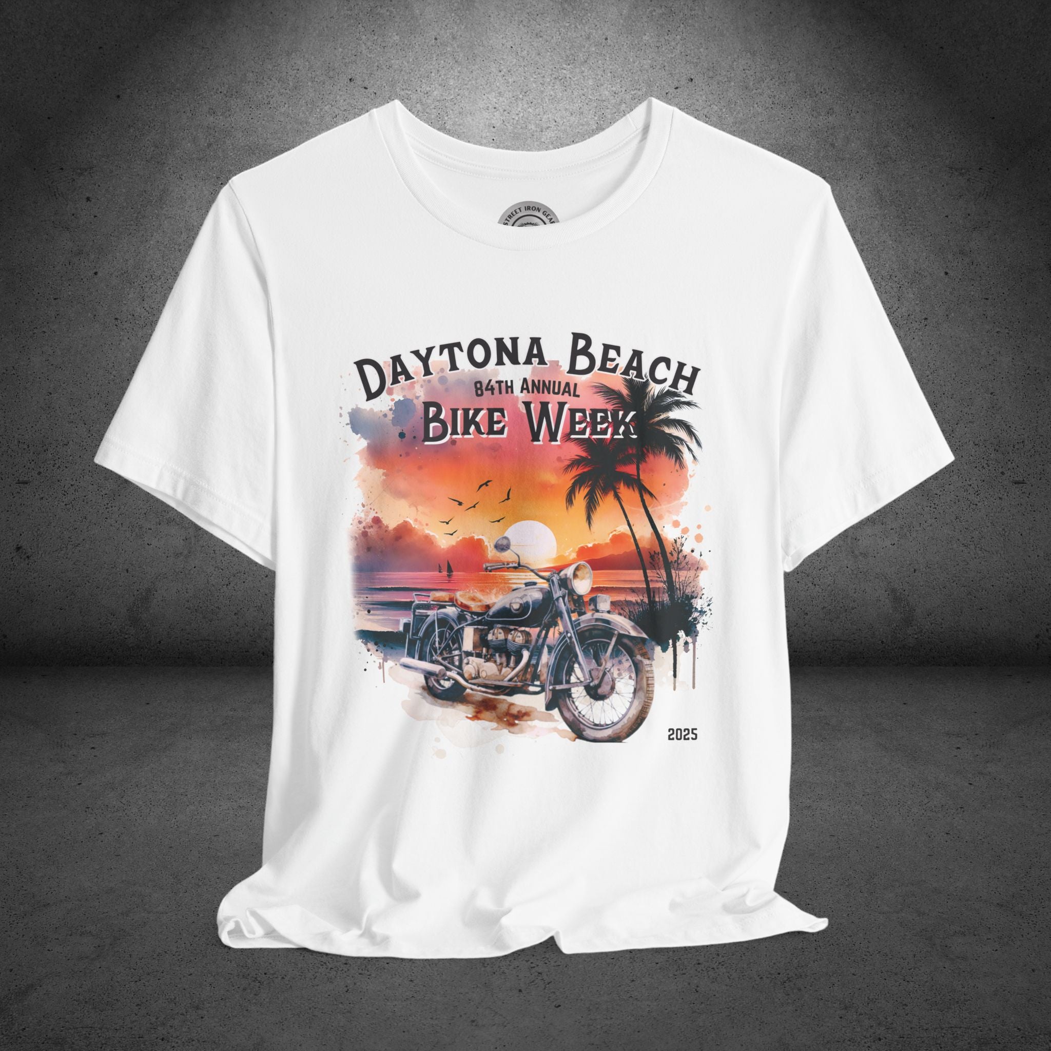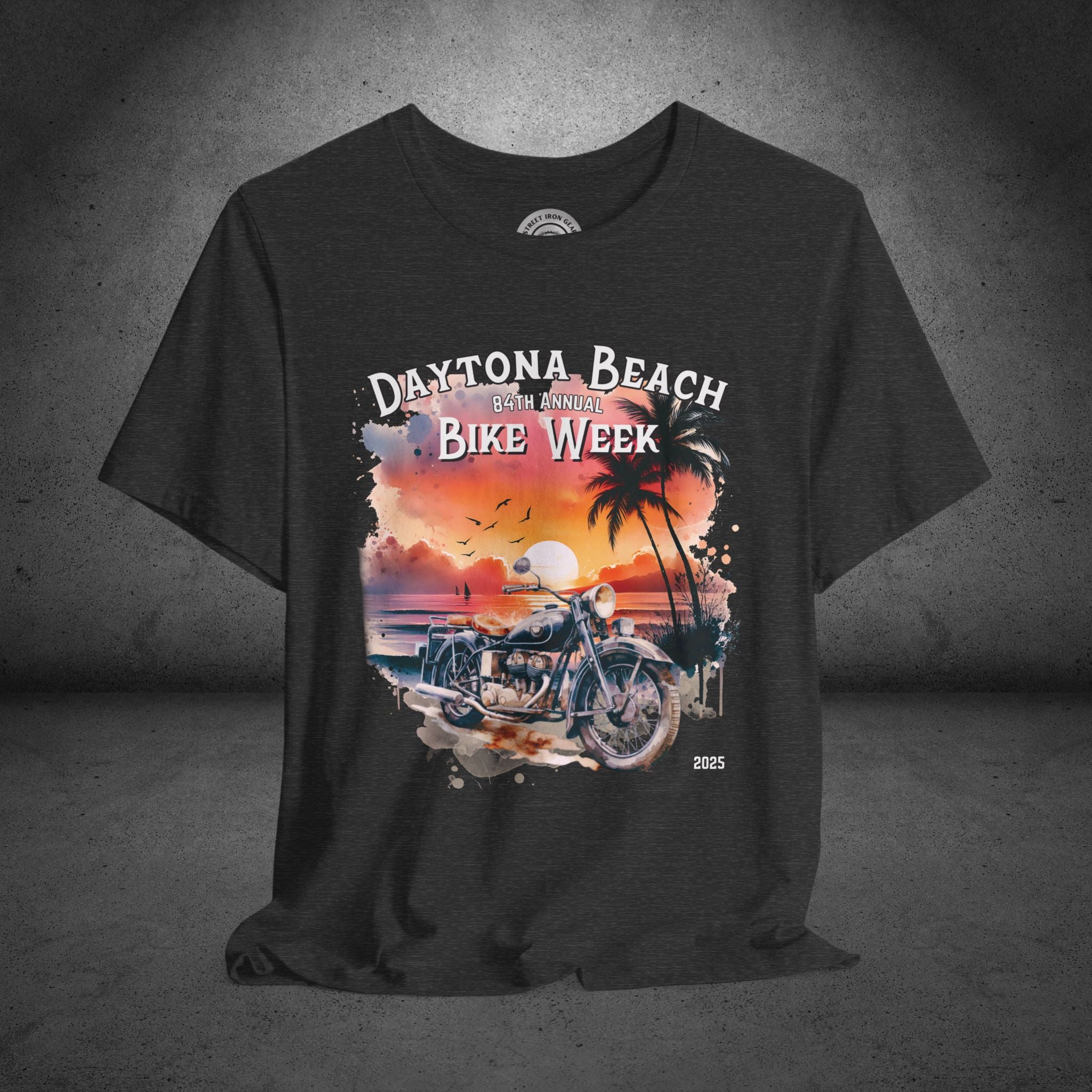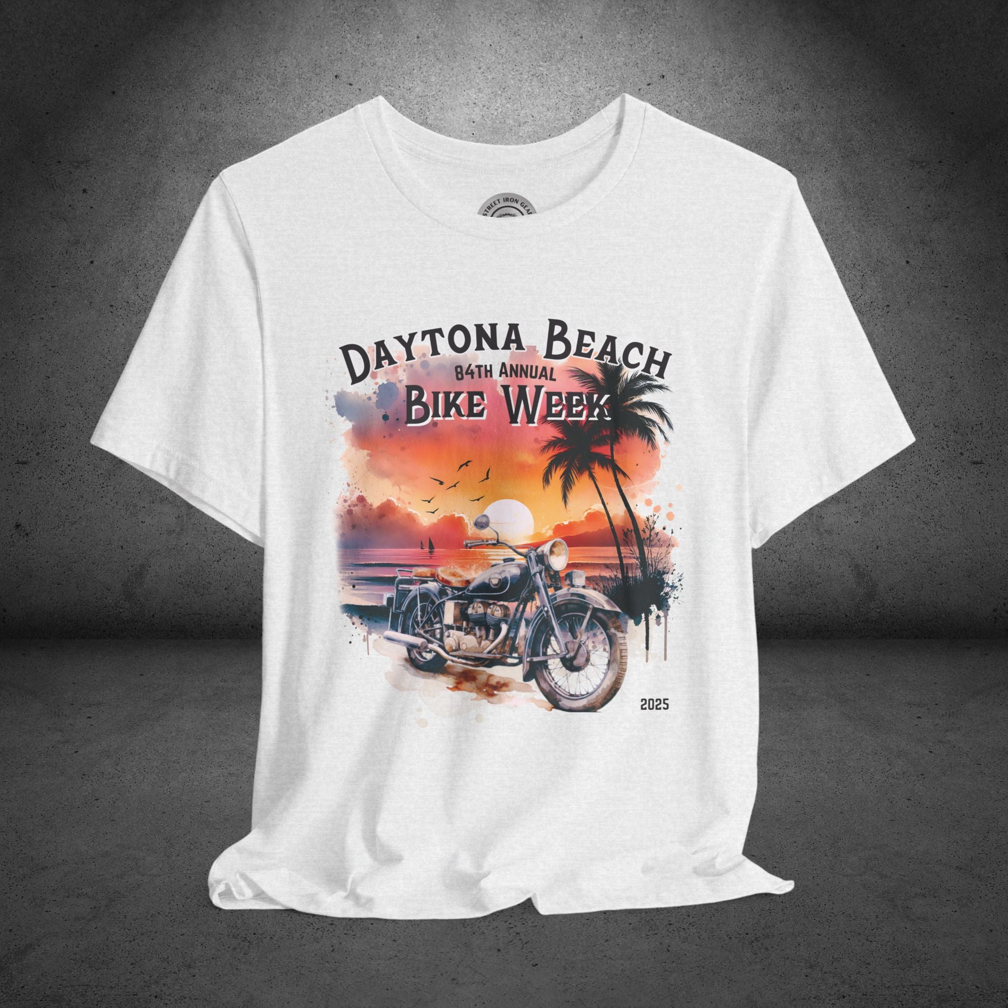 Celebrate the 84th Annual Daytona Beach Bike Week in style with our stunning T-shirt featuring a vibrant watercolor-painted graphic of a beachy sunset and a vintage motorcycle in the foreground. The design proudly reads "Daytona Beach 84th Annual Bike Week 2025," making it the perfect keepsake or gift for motorcycle enthusiasts. Available in a variety of colors and sizes up to 5XL, this high-quality T-shirt combines comfort and timeless style, ideal for showcasing your love for bikes and beach vibes.