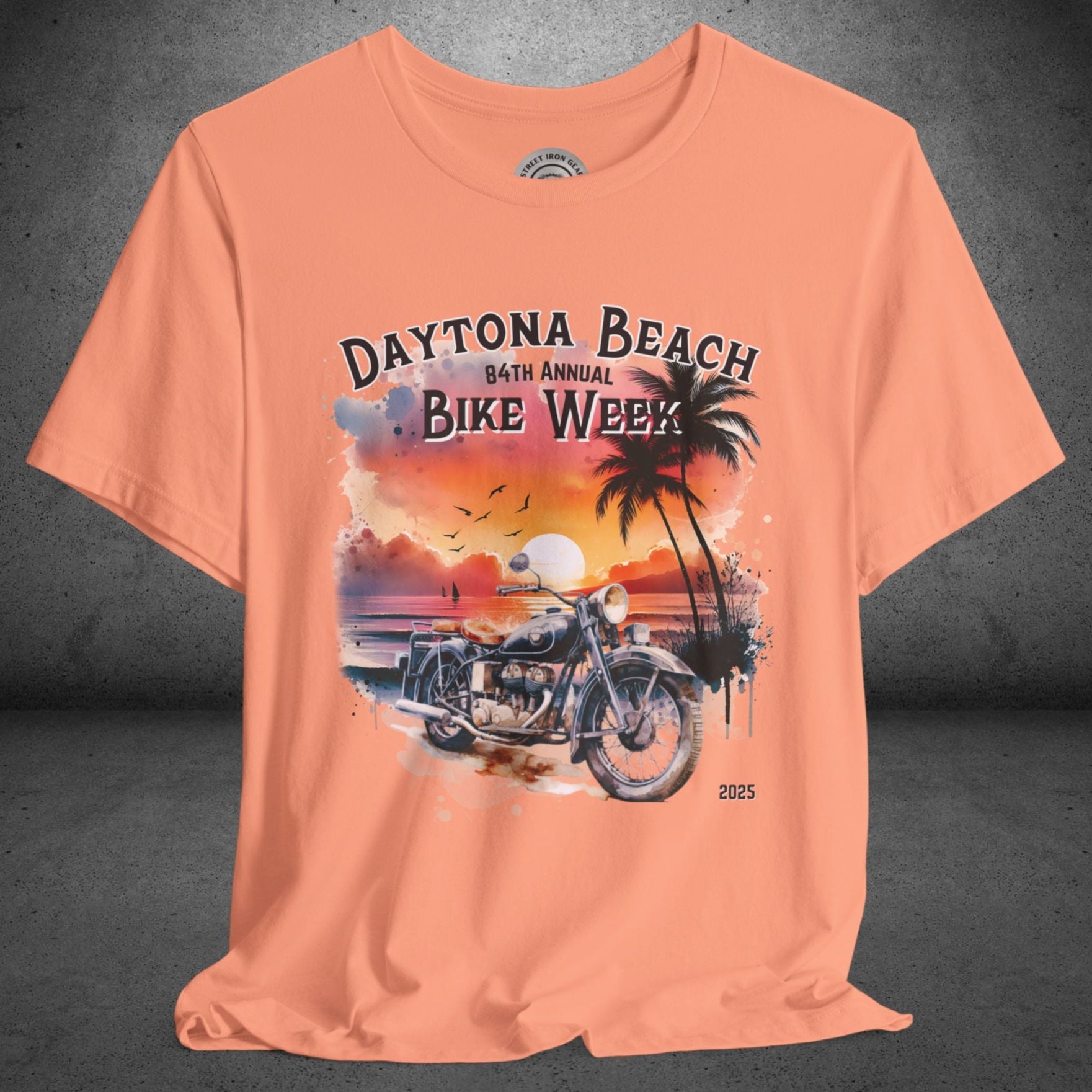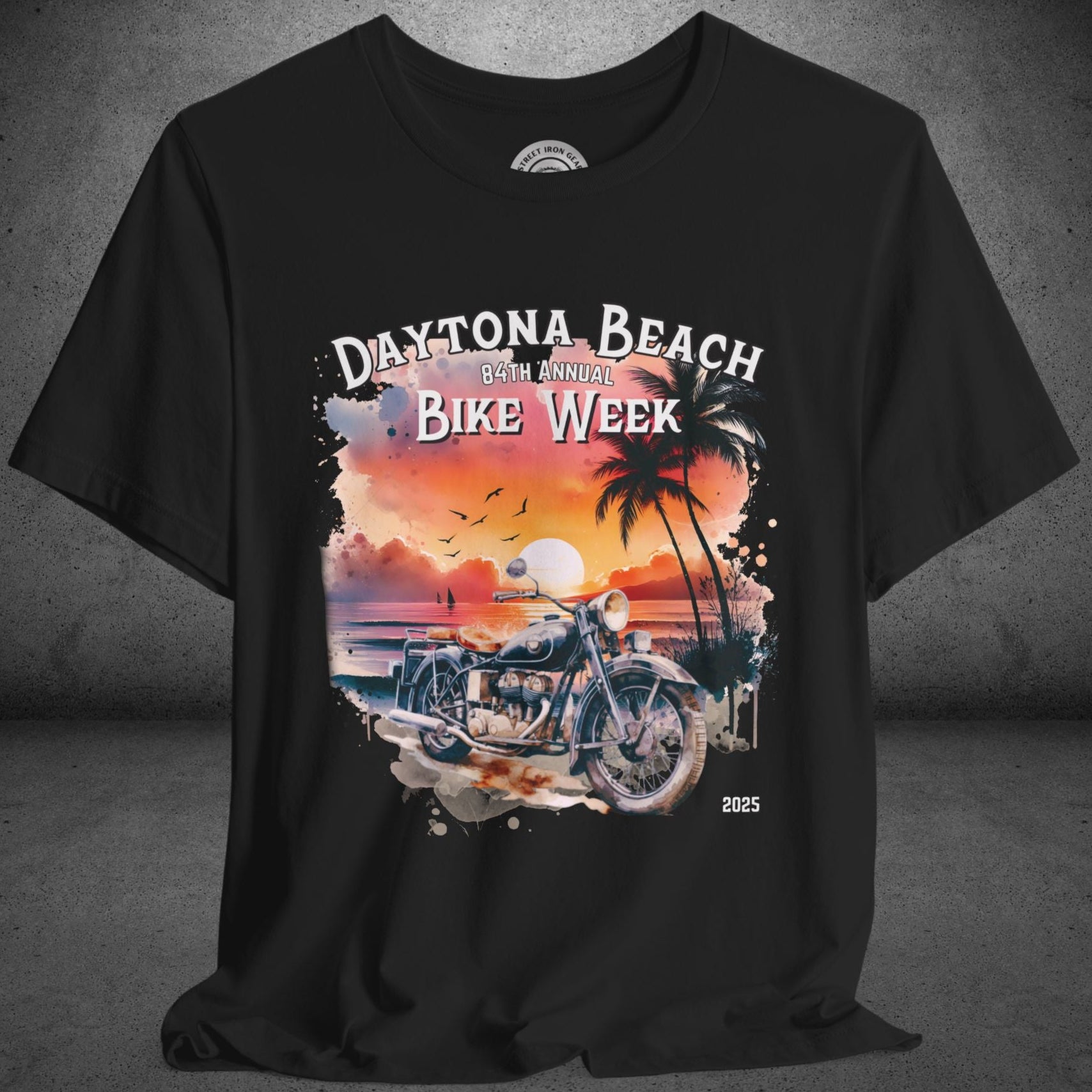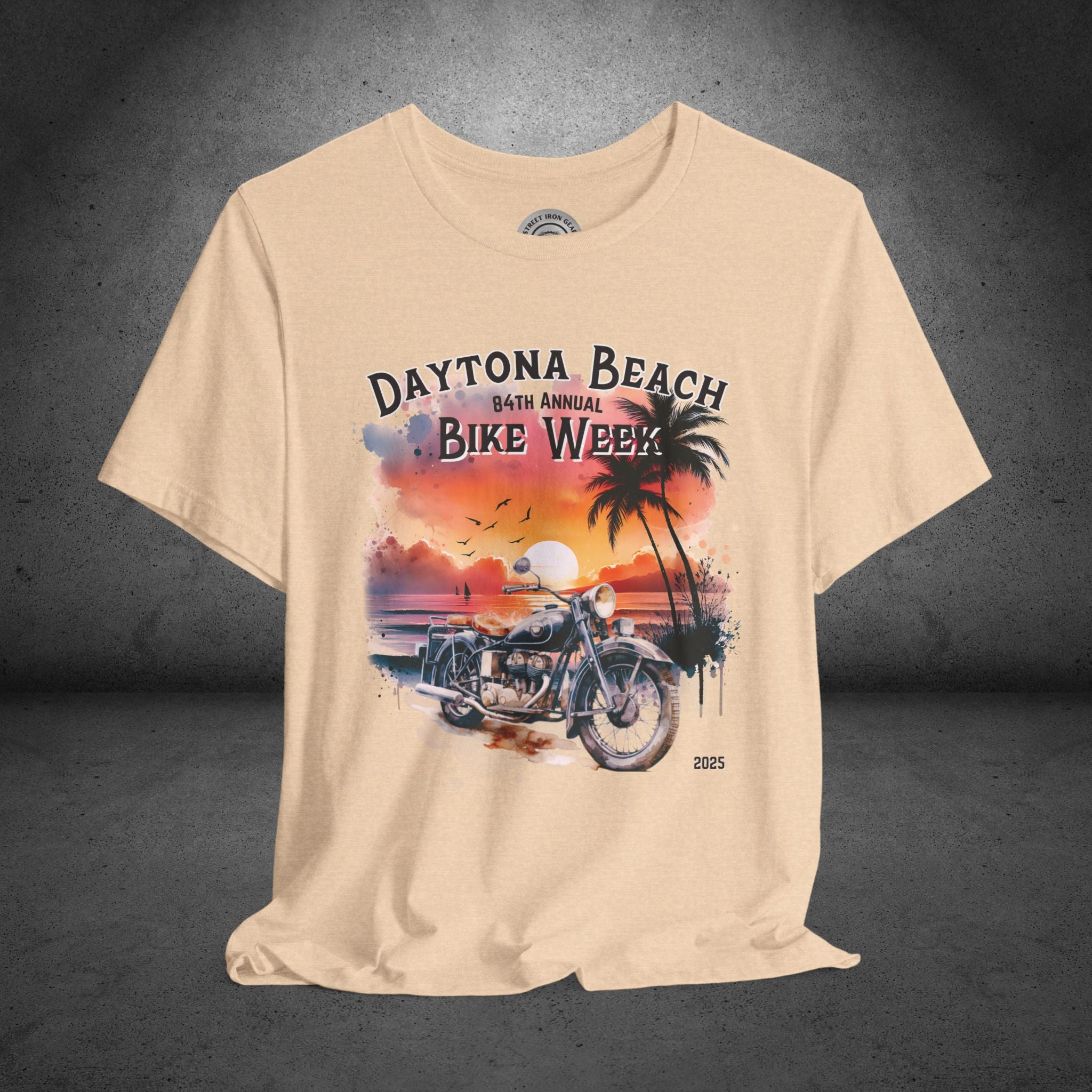 Celebrate the 84th Annual Daytona Beach Bike Week in style with our stunning T-shirt featuring a vibrant watercolor-painted graphic of a beachy sunset and a vintage motorcycle in the foreground. The design proudly reads "Daytona Beach 84th Annual Bike Week 2025," making it the perfect keepsake or gift for motorcycle enthusiasts. Available in a variety of colors and sizes up to 5XL, this high-quality T-shirt combines comfort and timeless style, ideal for showcasing your love for bikes and beach vibes.