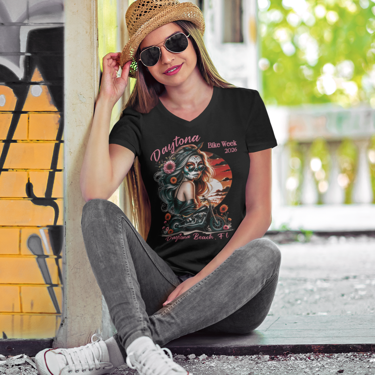 Prepare for the sun and surf of the legendary Florida rally with this stunning Daytona Bike Week 2026 v-neck t-shirt, a perfect blend of bohemian flair and classic biker spirit. The detailed design showcases a Day of the Dead inspired female rider with long flowing hair alongside a timeless cruiser motorcycle, all framed by vibrant sun motifs and artistic floral elements. Specifically crafted to commemorate the 2026 event in Daytona Beach, this high-quality shirt is made from soft, breathable fabric to keep you comfortable while cruising Main Street or enjoying the coastal breeze. While the design is tailored for lady riders and biker chicks, the unisex sizing offers a versatile and relaxed fit that works for all-day wear at the 85th annual rally. This artistic motorcycle themed top serves as an incredible souvenir or gift for any female enthusiast looking for a unique, non-corporate way to represent her love for the open road and the iconic Florida riding culture.