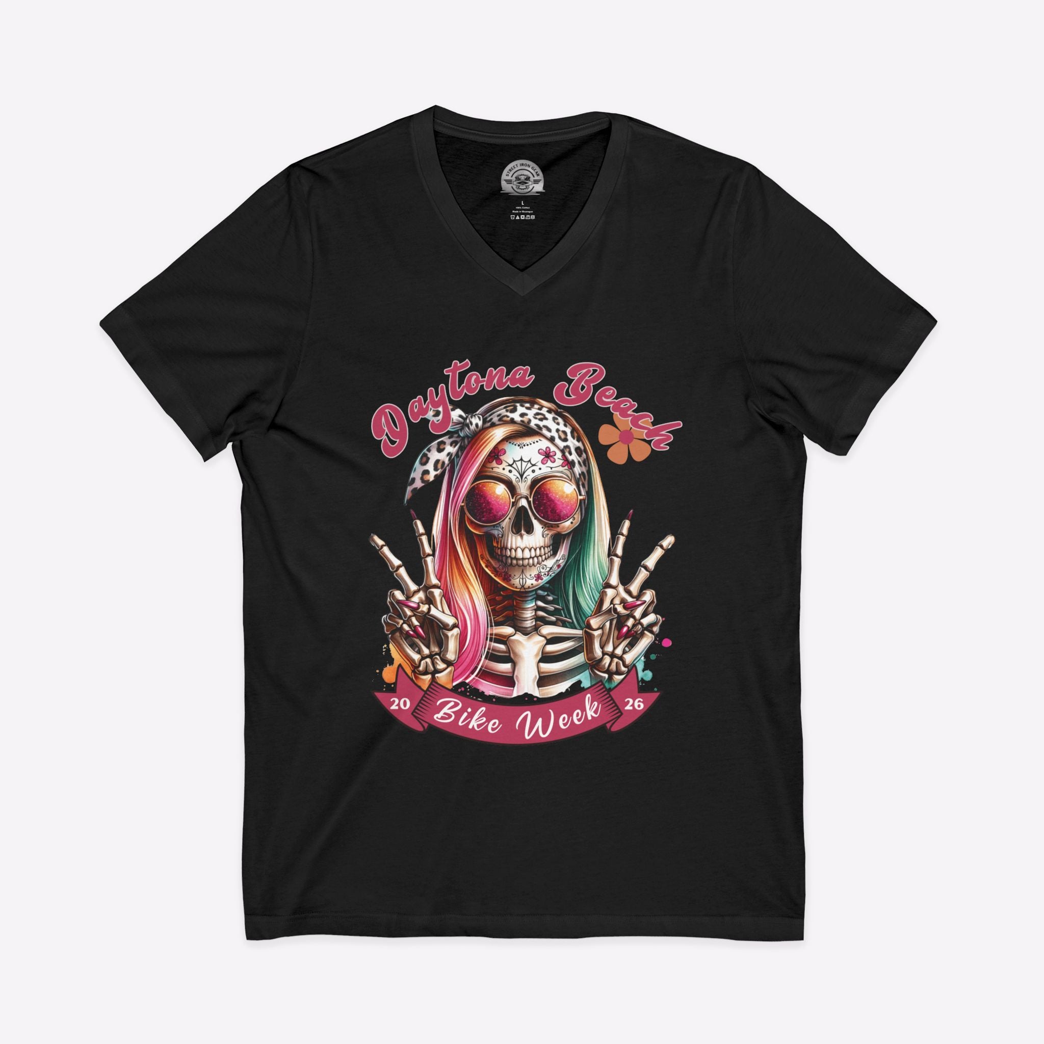 Get ready for the sun and the roar of the engines with this stylish Daytona Bike Week 2026 v-neck t-shirt, the perfect addition to your motorcycle rally wardrobe. This trendy top features a unique hipster-inspired graphic of a female skull with flowing long hair, chic sunglasses, and a bold animal print headband, playfully flashing a peace sign to celebrate the riding community spirit. Designed specifically for the 85th annual Florida event, this high-quality v-neck is crafted from soft, breathable fabric, making it ideal for staying cool while cruising the beach or navigating the crowds on Main Street. The versatile unisex sizing provides a comfortable and relaxed fit for lady riders and biker chicks looking for edgy, non-corporate motorcycle clothing. Whether you are attending the 2026 rally or searching for the perfect biker gift for a friend, this comfortable v-neck captures the modern, rebellious vibe of the world-famous Daytona motorcycle event and serves as a lasting souvenir of the open road.