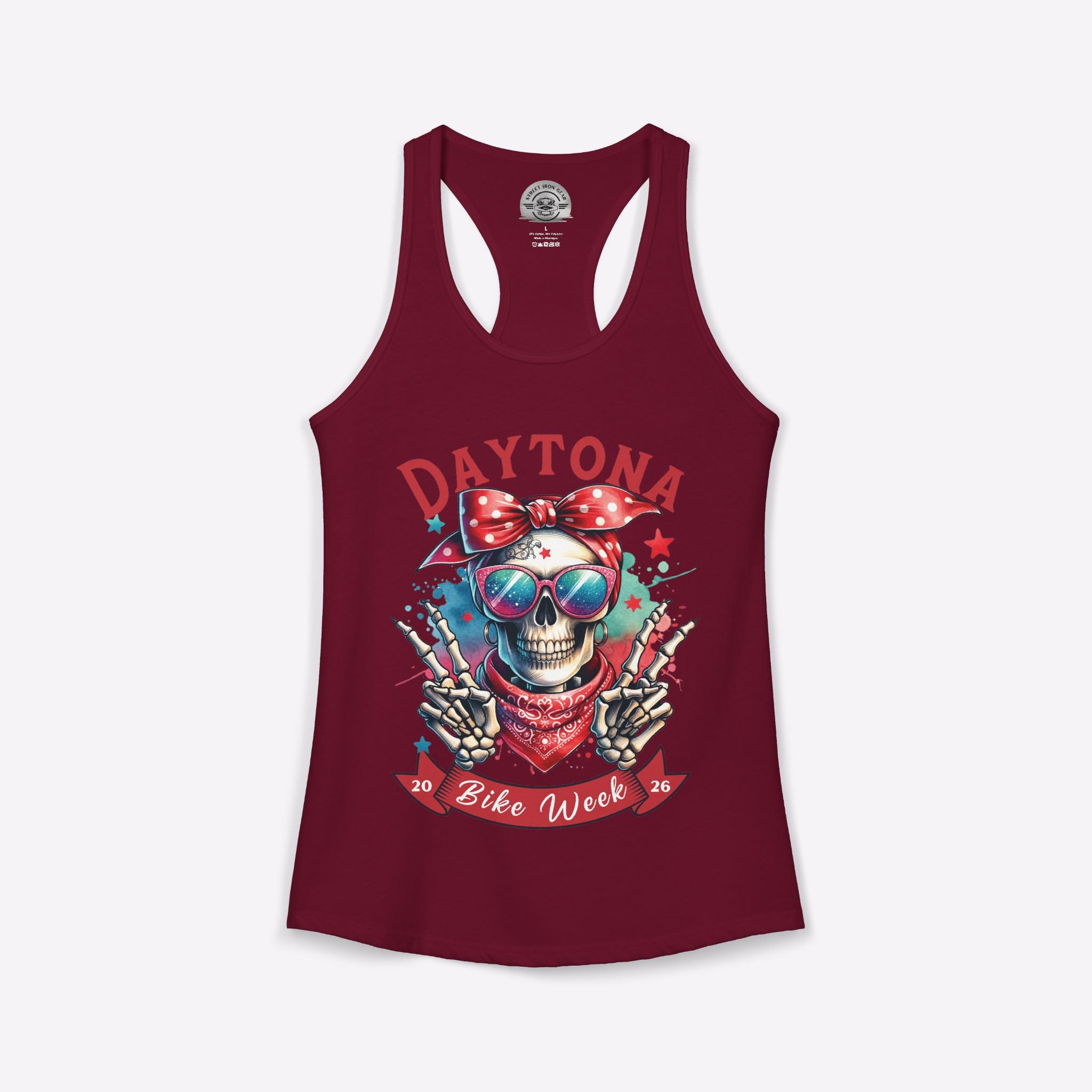 Get ready for the sunshine and coastal rides with this stylish women's racerback tank top, designed specifically for the Daytona Bike Week 2026 rally. This trendy piece of ladies' motorcycle apparel features a fun hipster-inspired skull graphic, complete with cool sunglasses, a vintage red and white polka dot bow, and a playful peace sign gesture that perfectly captures the laid-back Florida festival vibe. The lightweight, breathable fabric makes it an ideal choice for staying cool while cruising the beach or walking the boardwalk during one of the world's most iconic biker events. Whether you are a local rider or traveling from afar, this commemorative tank is a must-have souvenir for any female enthusiast looking to celebrate the 2026 motorcycle season in style. It serves as a fantastic gift for biker chicks, lady riders, and fans of unique, feminine motorcycle clothing who want to showcase their passion for the open road and the spirit of the Daytona rally.