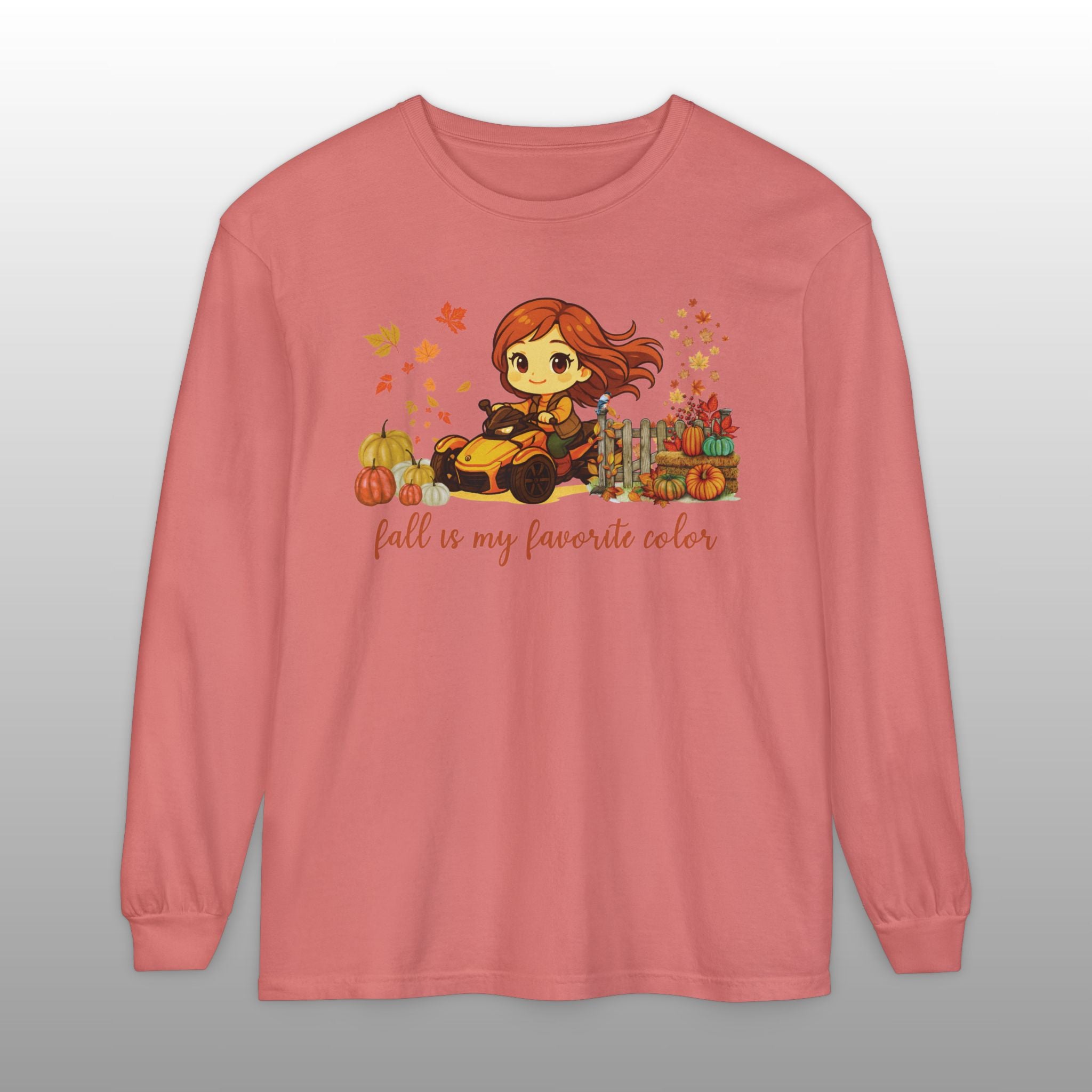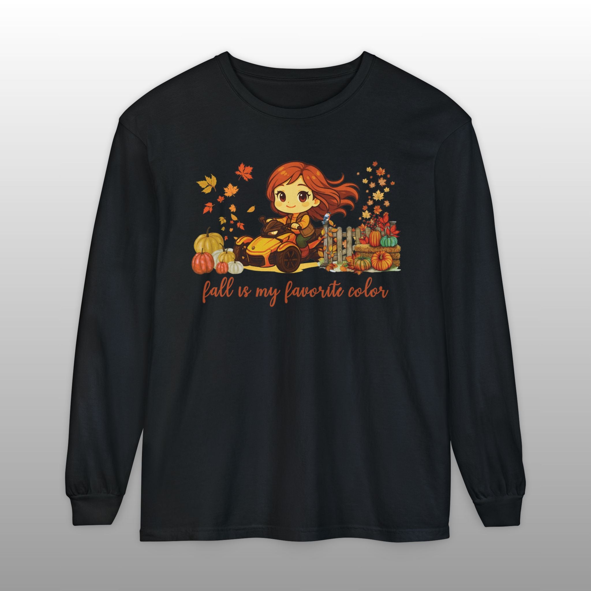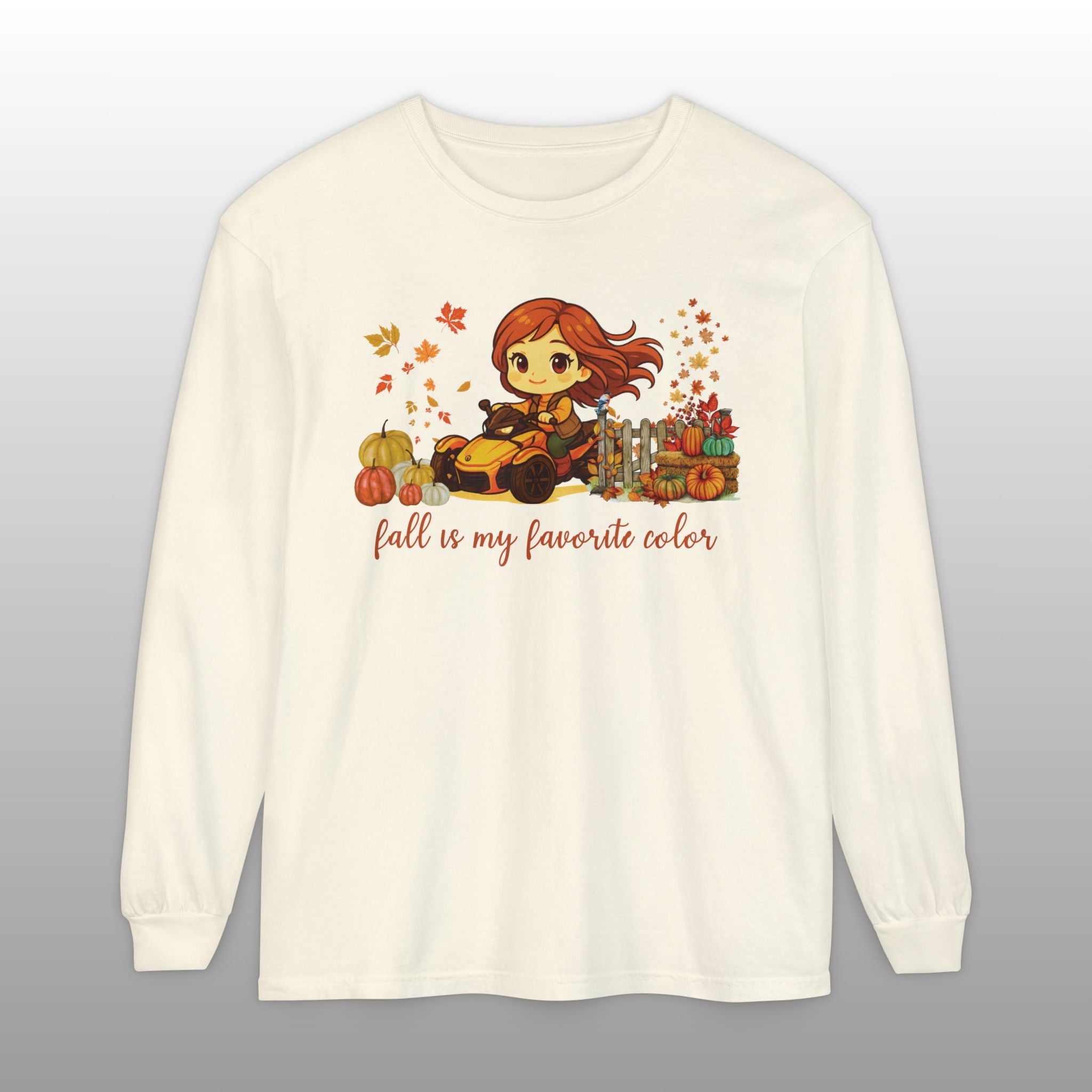 Celebrate the cozy season with this adorable Can-Am Spyder themed long sleeve fall T-shirt, featuring a playful chibi-style girl riding her Spyder surrounded by pumpkins, falling leaves, and crisp autumn vibes. Designed in a muted fall color palette, this shirt captures everything you love about riding in the fall—warm tones, seasonal charm, and the freedom of the open road. The phrase "Fall is my favorite color" ties the design together, making it the perfect blend of rider pride and seasonal spirit. Ideal for Can-Am Spyder owners, motorcycle-loving women, or anyone who lives for autumn rides, this comfy tee makes a great gift or addition to your own fall wardrobe.