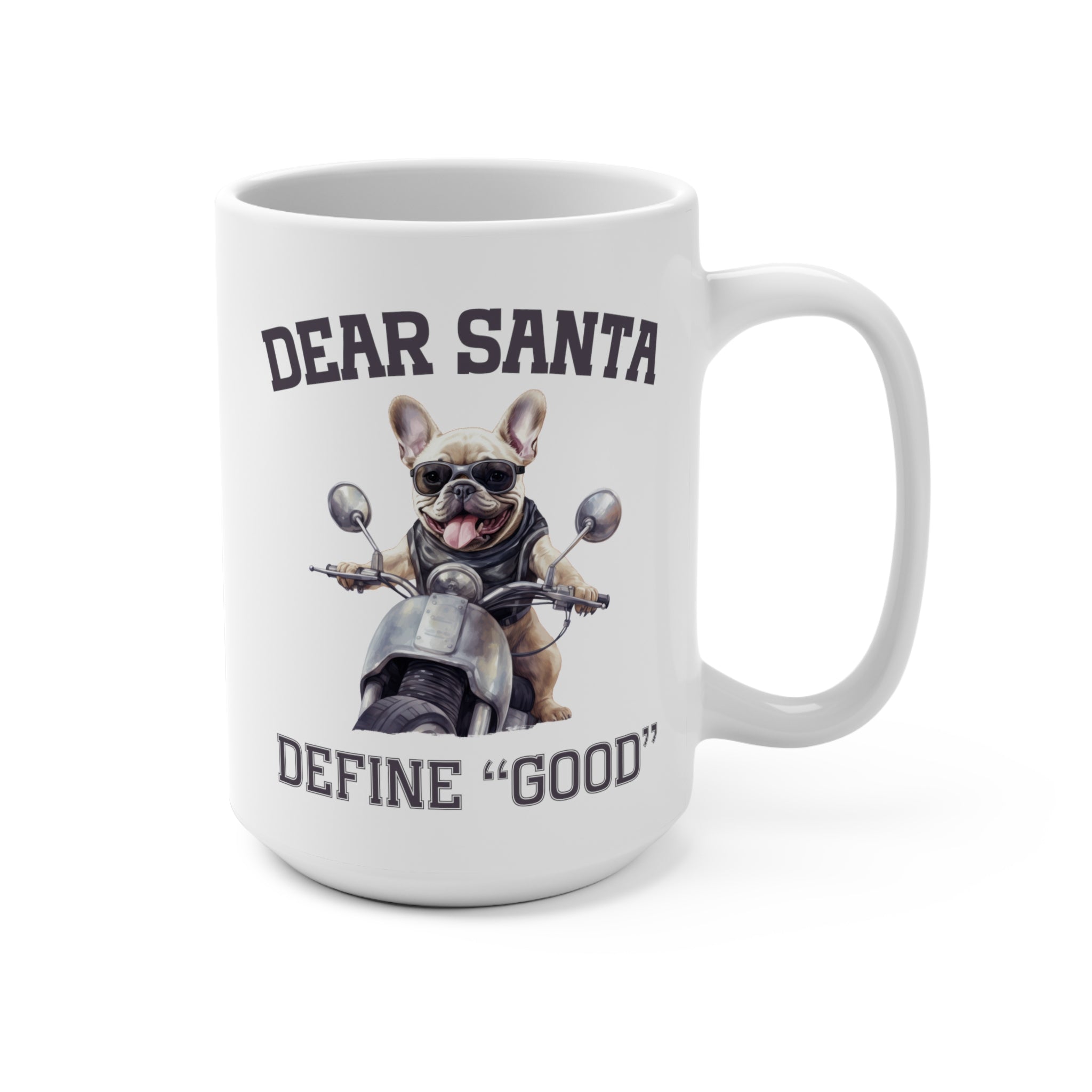 Start your mornings with a festive smile! Our "Dear Santa, Define Good" Christmas Coffee Mug features an adorable French Bulldog riding a vintage motorcycle, making your coffee breaks merry and bright. This whimsical design adds a dash of holiday cheer to your daily routine.