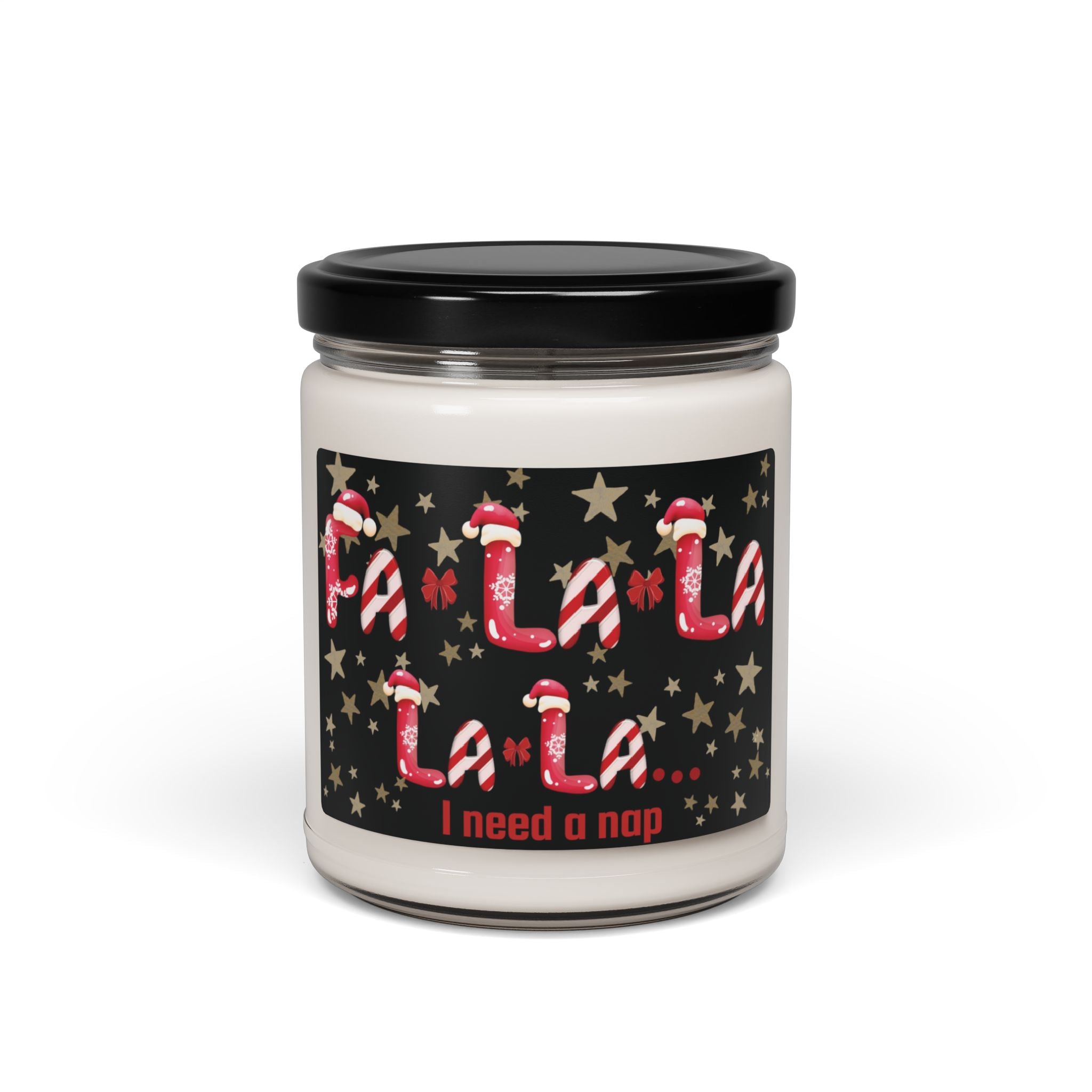 Add some holiday humor to your home with our funny Christmas-themed soy candle! Featuring a playful red, white, and gold design that reads "Fa La La La La. I need a nap." in a fun candy cane bubble font adorned with Santa hats and stars, this candle is sure to bring festive cheer to any room. Made with clean-burning soy wax, it's perfect for creating a cozy holiday atmosphere without the toxins found in petroleum-based candles. This is a great gift or stocking stuffer for anyone who loves Christmas and a good laugh.