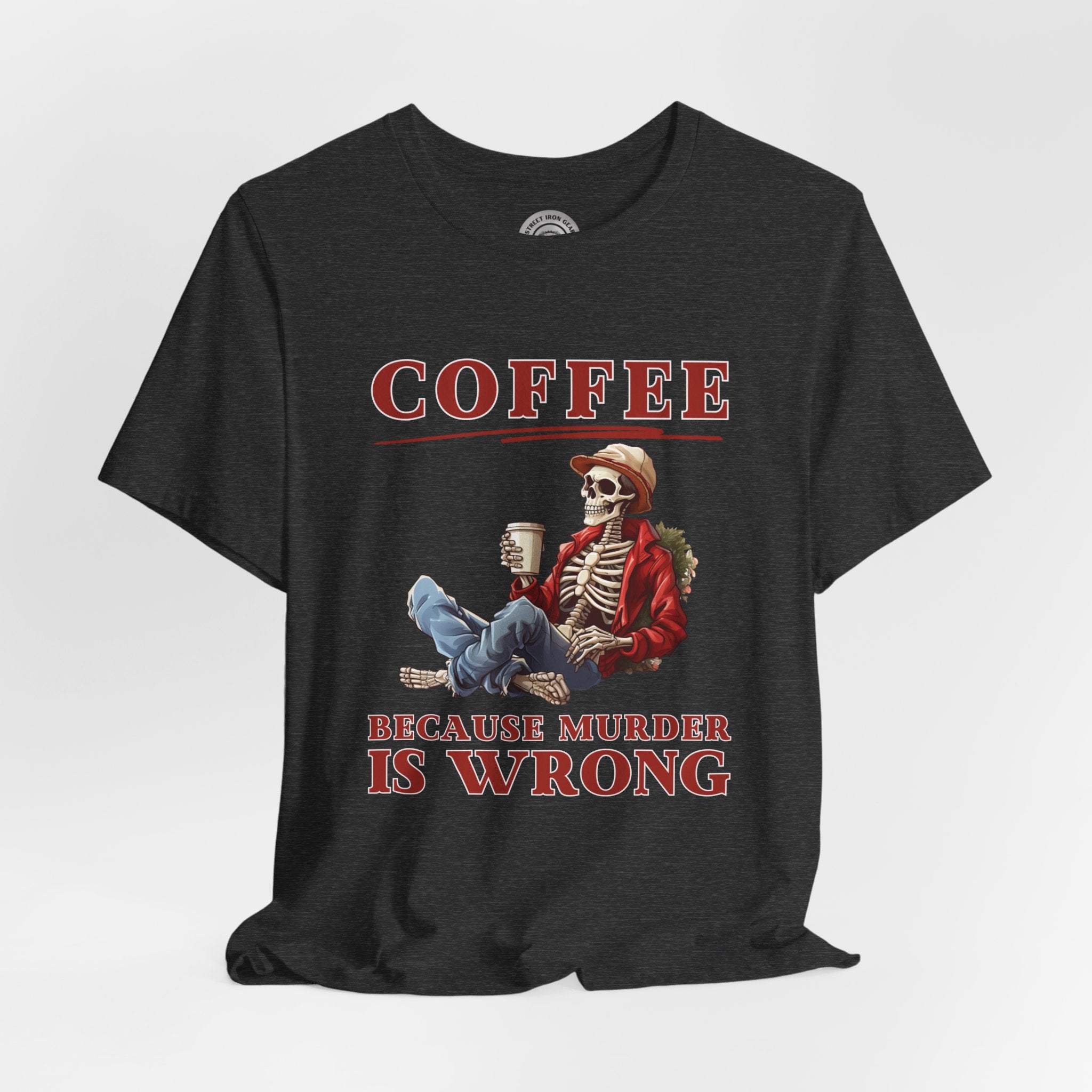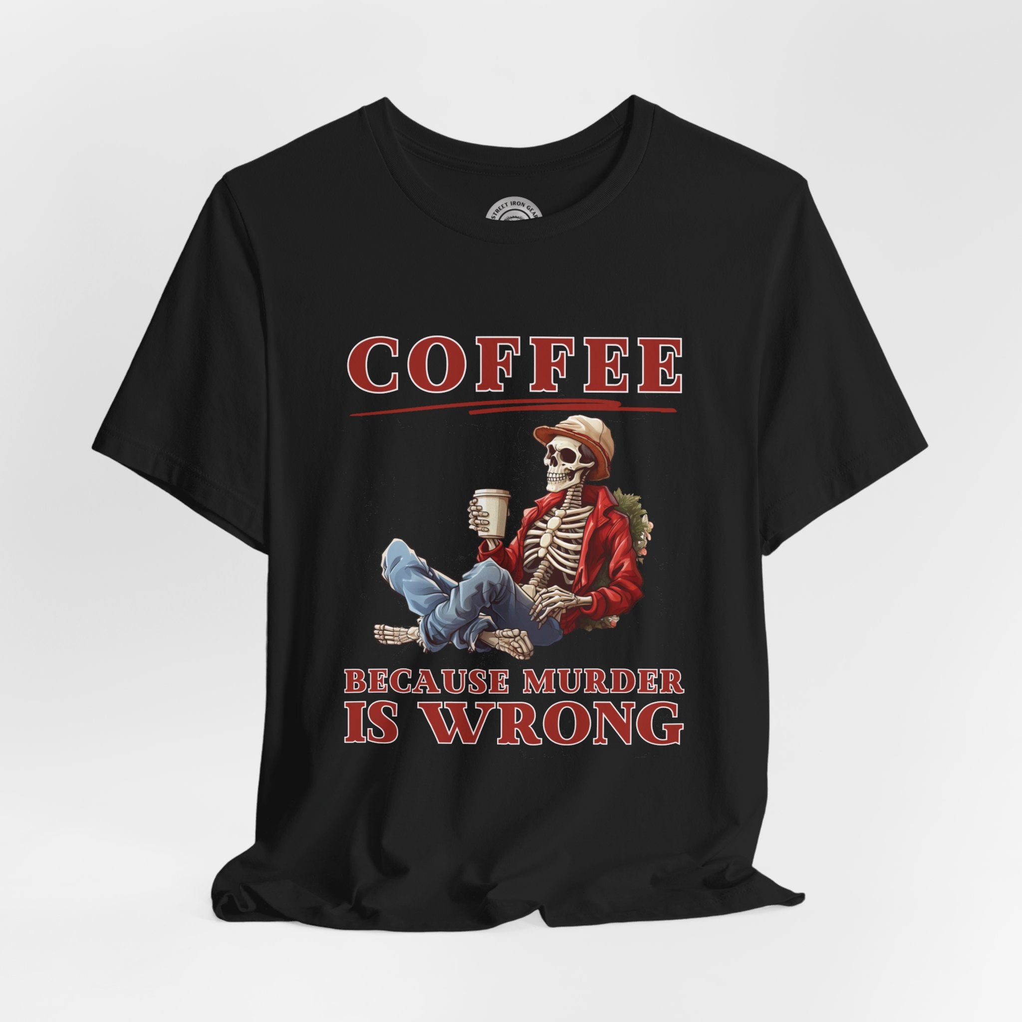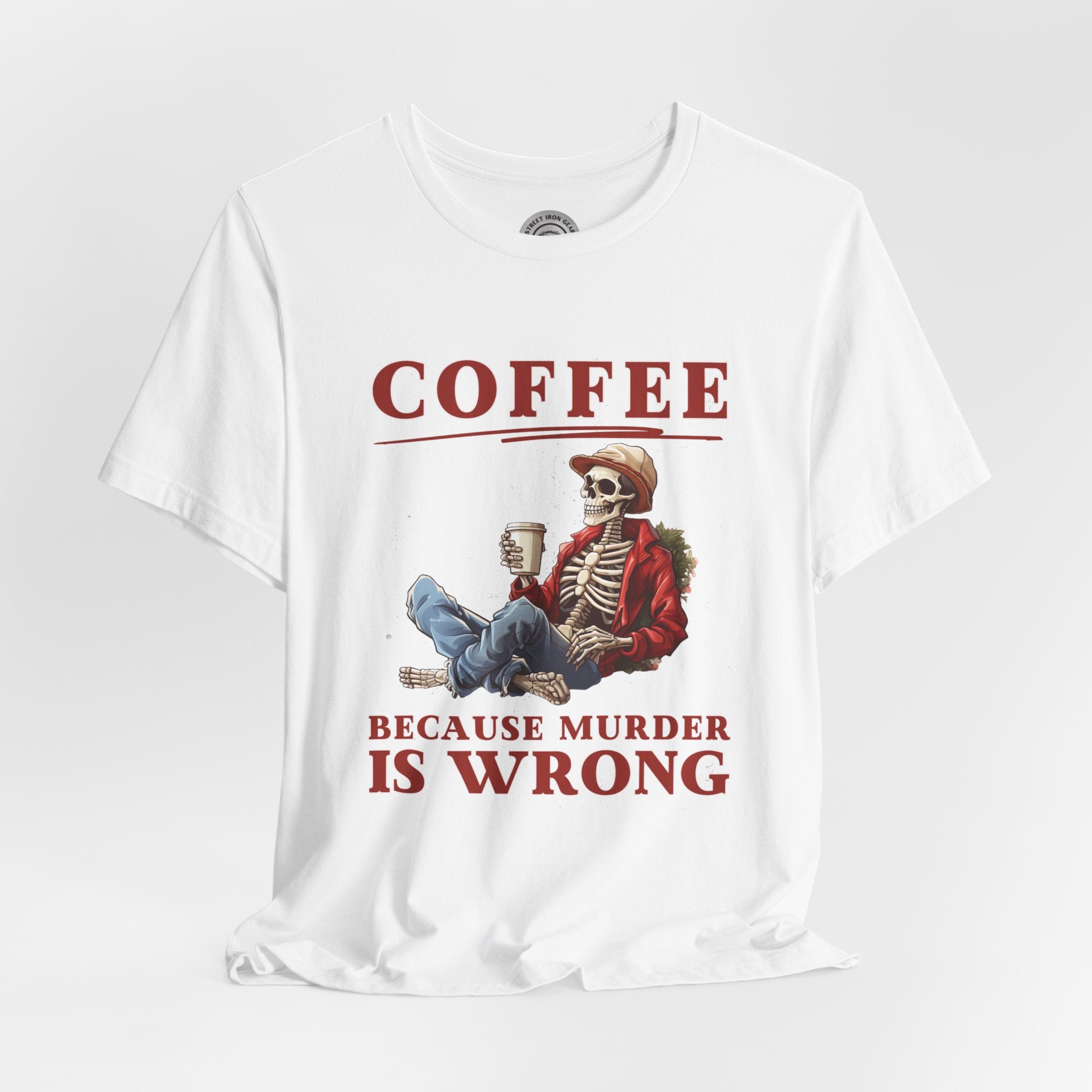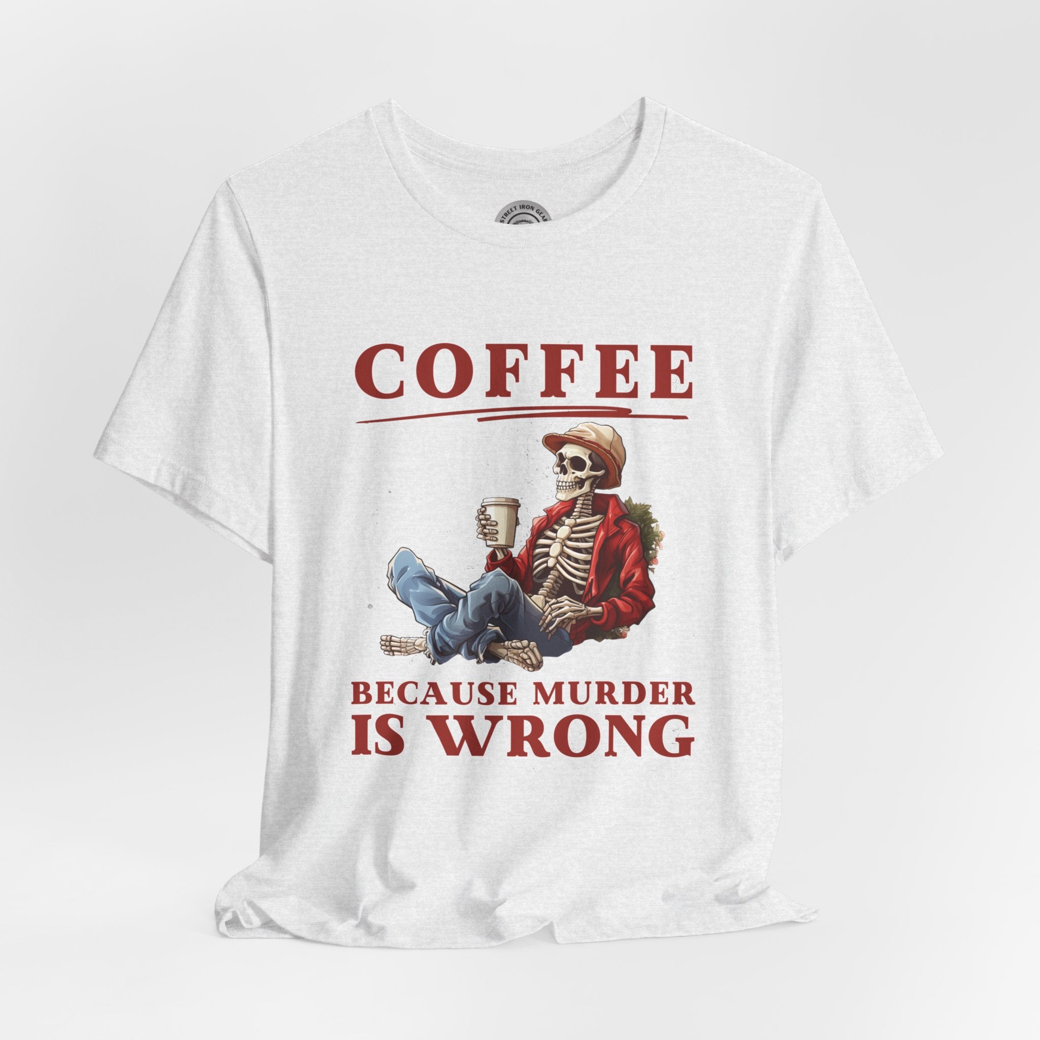 Add a dash of humor to your holiday wardrobe with our Christmas Skeleton shirt! This funny biker t-shirt features a skeleton holding coffee with the amusing message, "Coffee because murder is wrong."