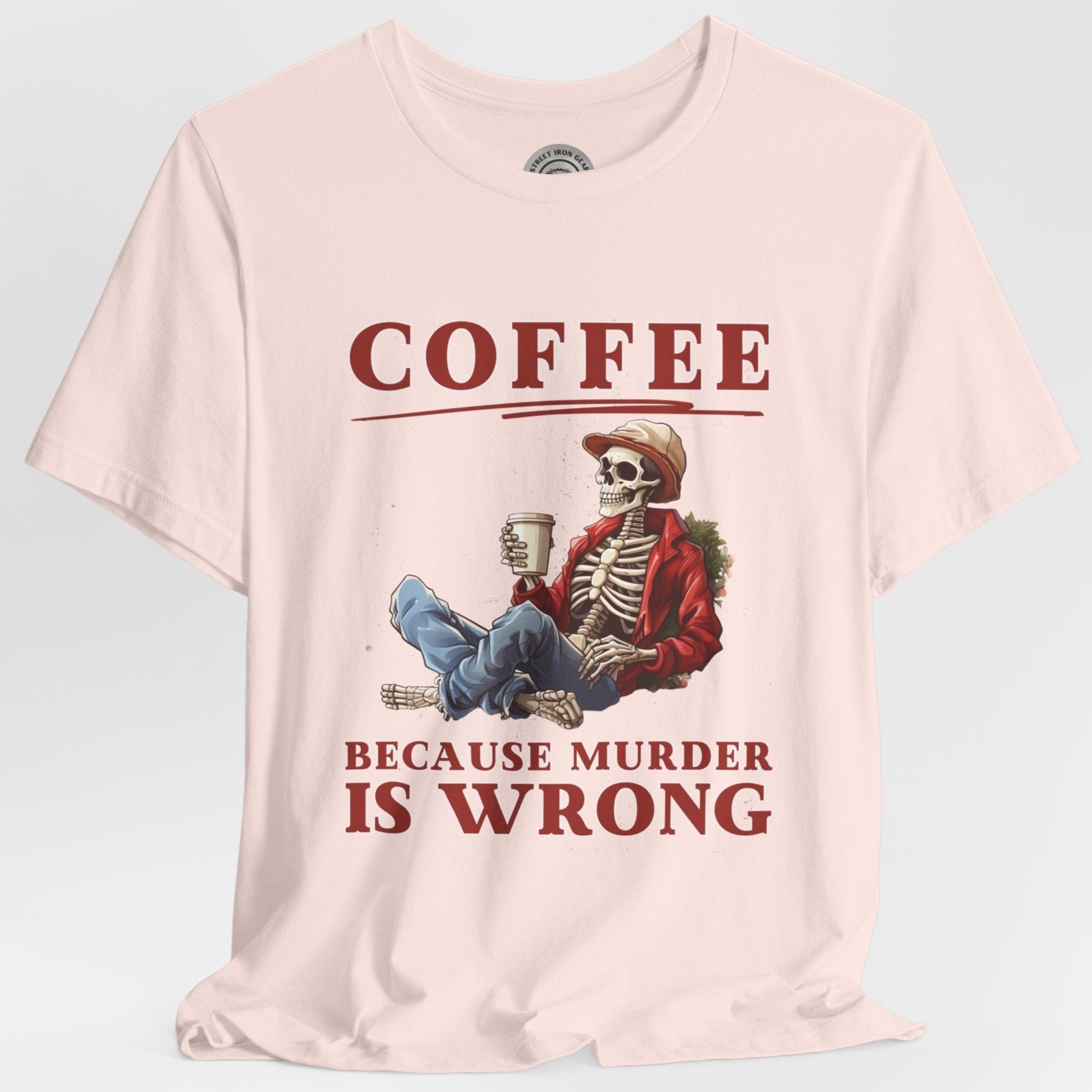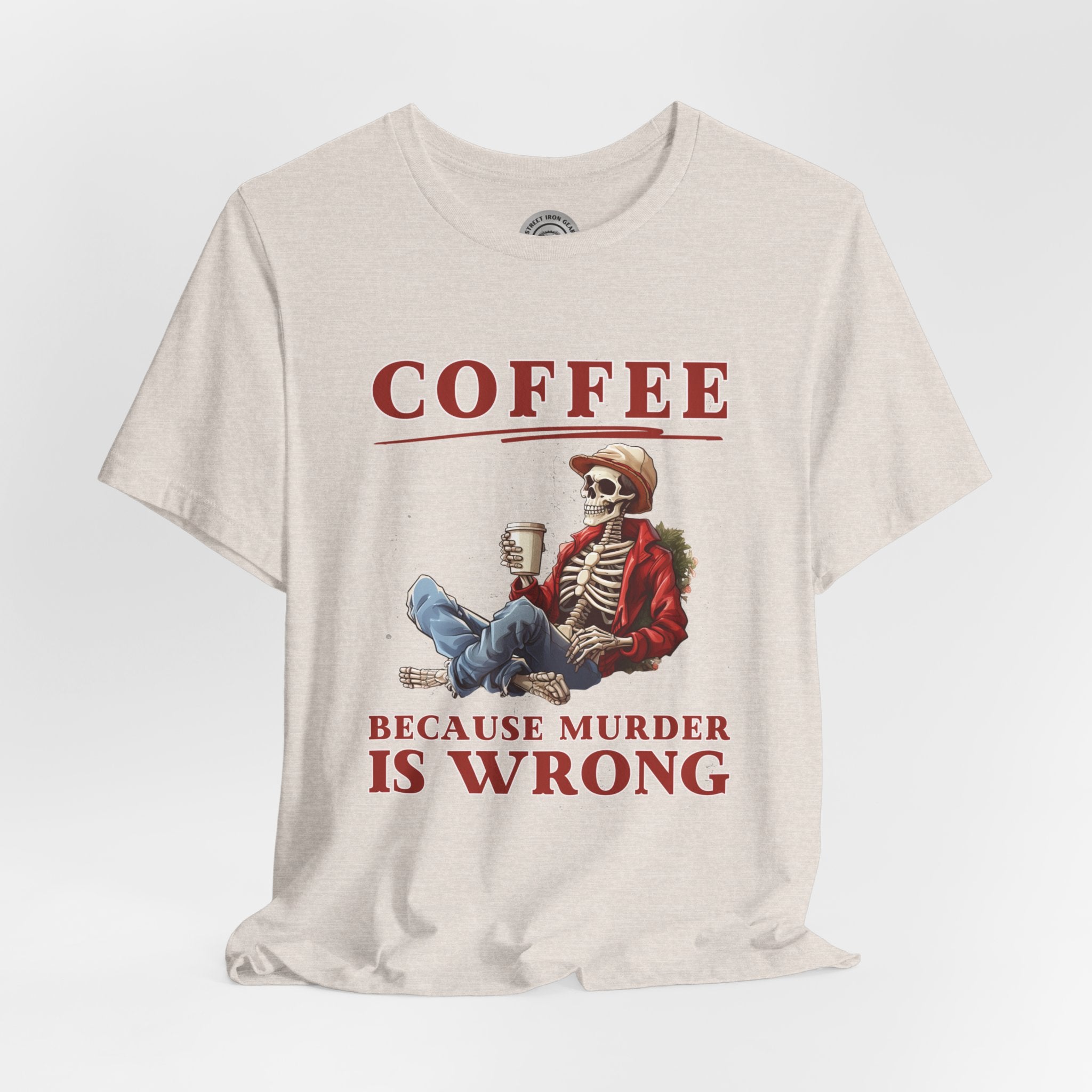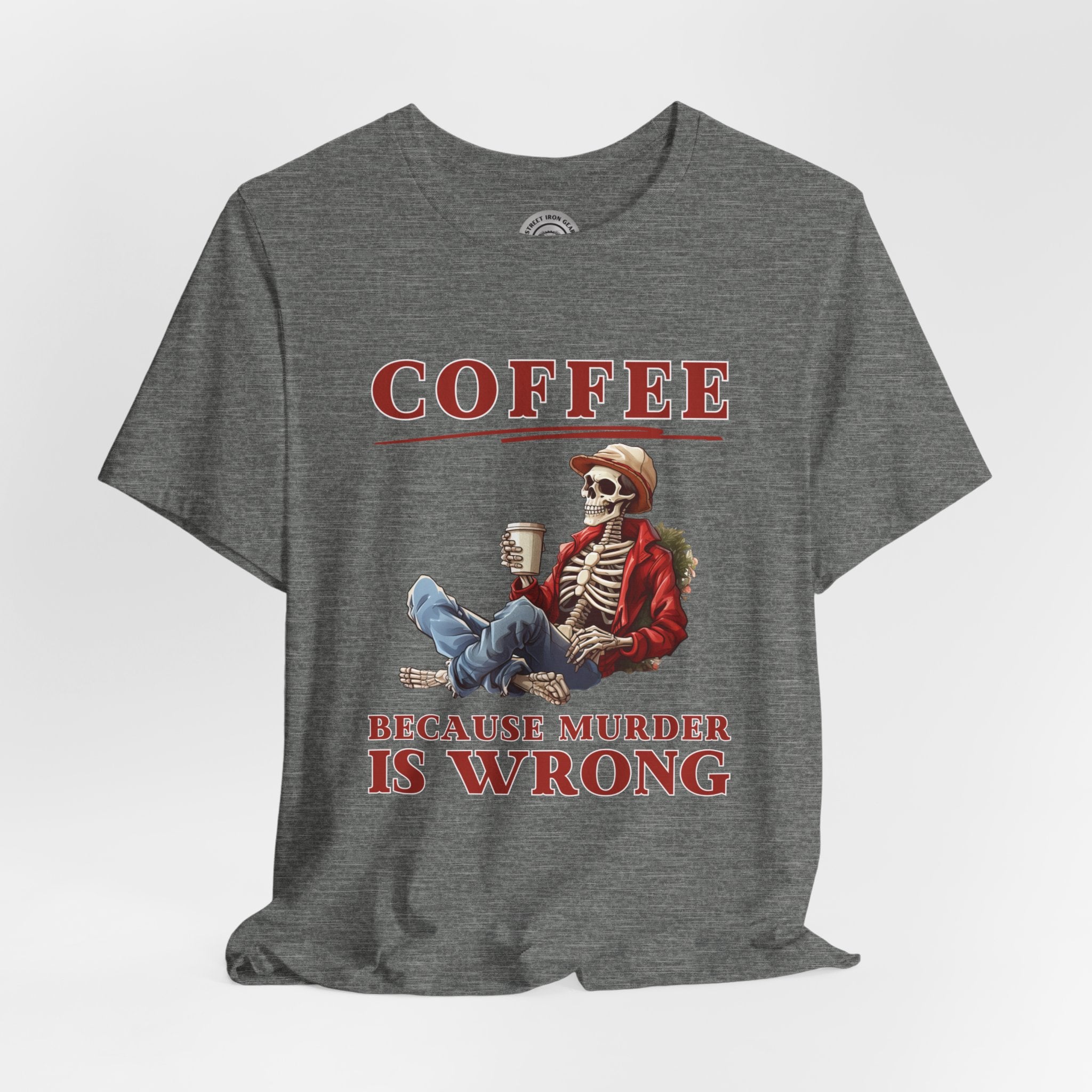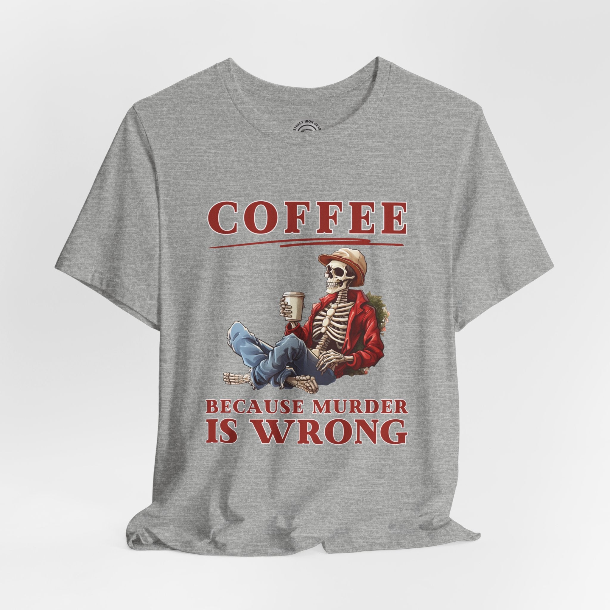 Add a dash of humor to your holiday wardrobe with our Christmas Skeleton shirt! This funny biker t-shirt features a skeleton holding coffee with the amusing message, "Coffee because murder is wrong."