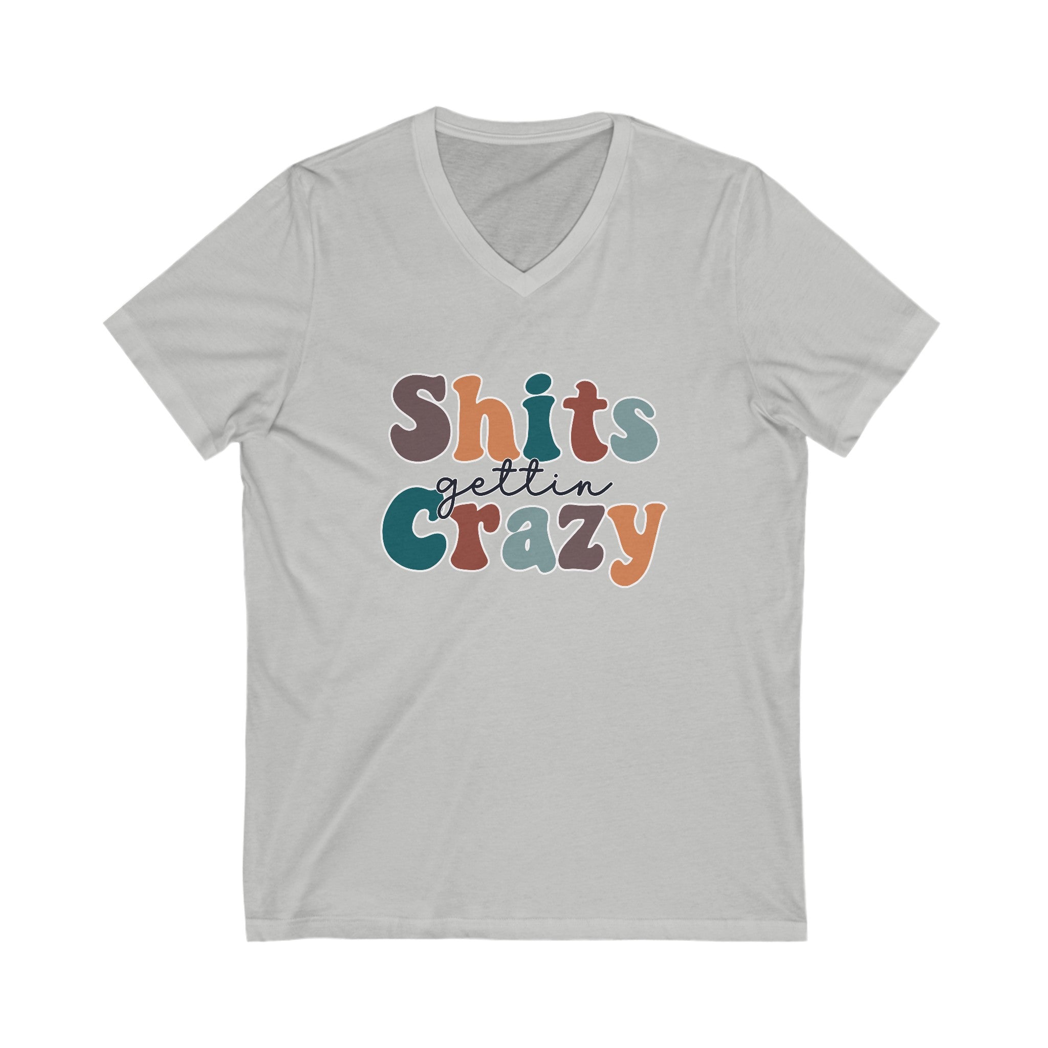 Make a bold statement with our 'Shit's Gettin' Crazy' V-neck shirt. In a colorful retro vibe font, this tee adds a playful edge to your style. Embrace the chaos with confidence!