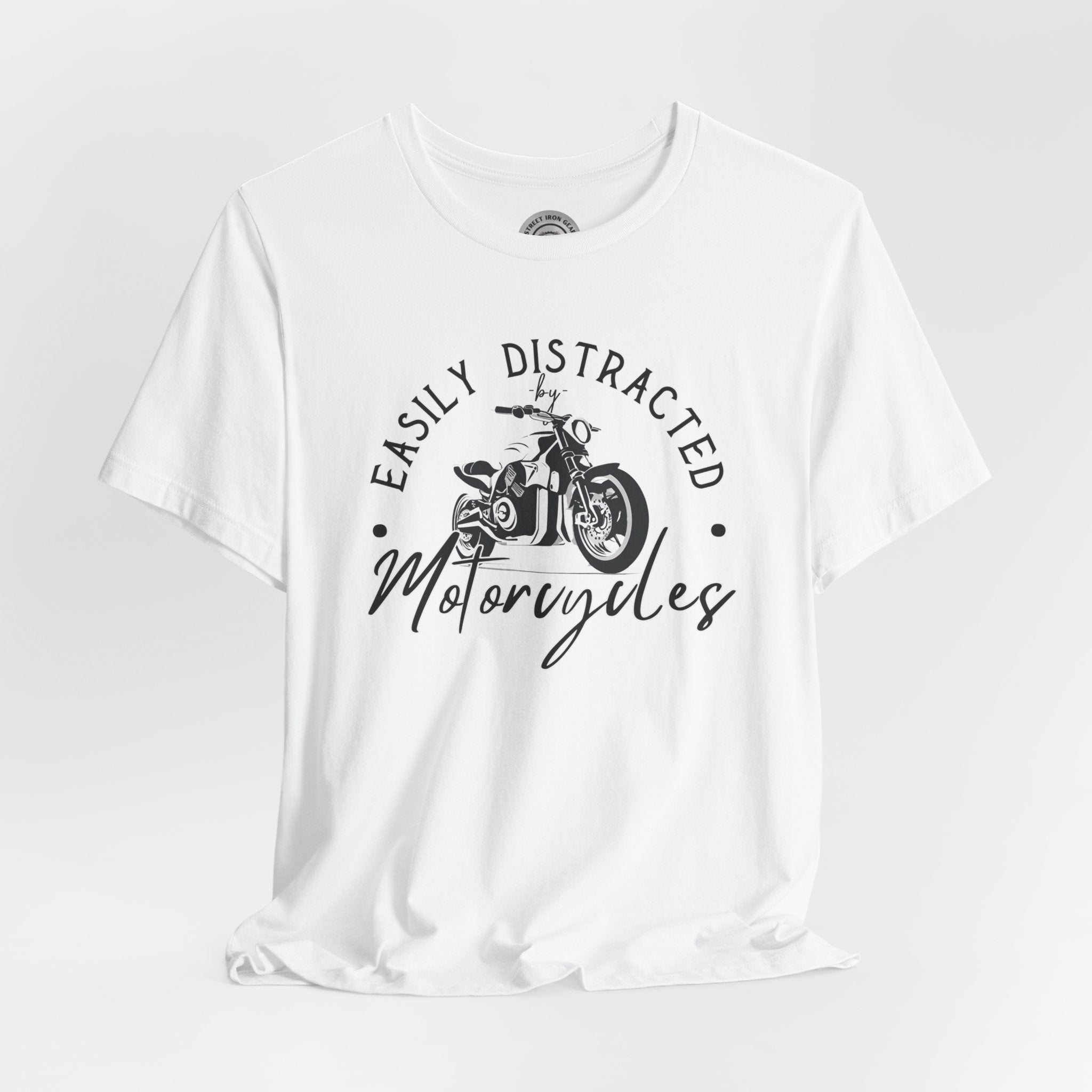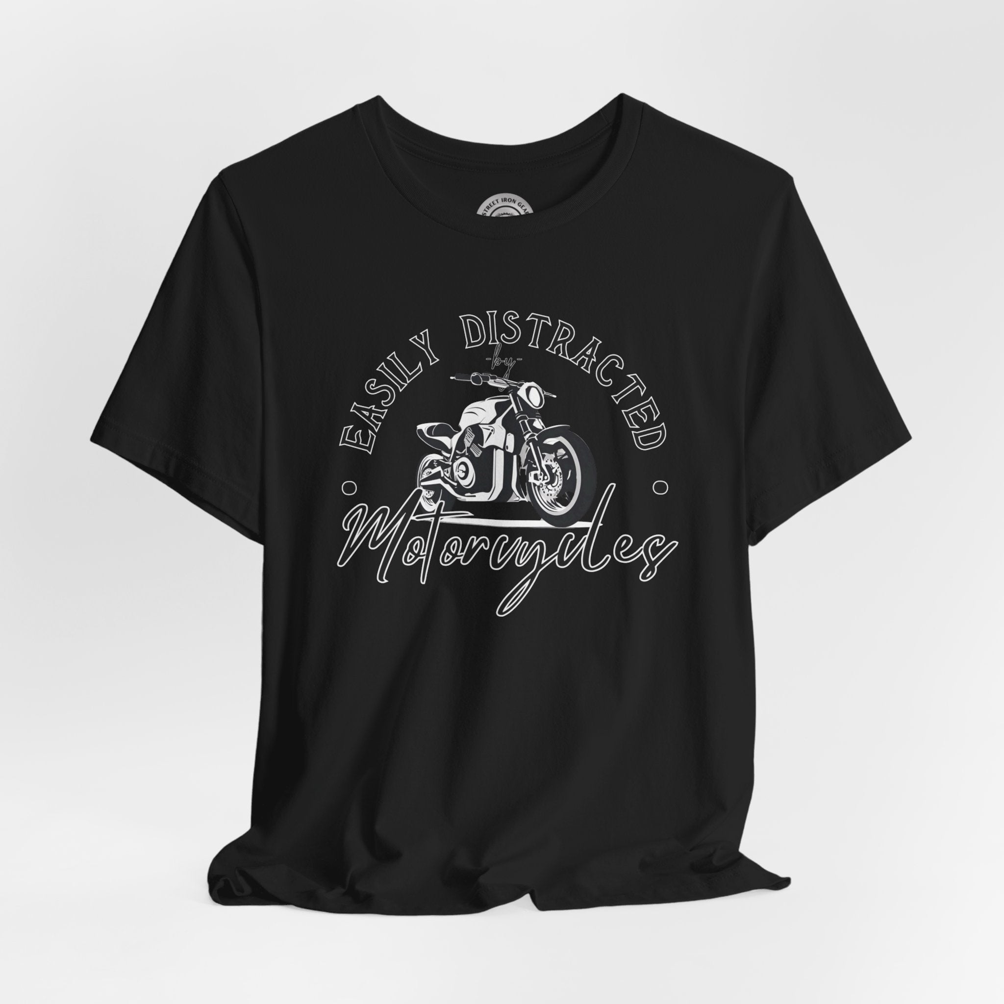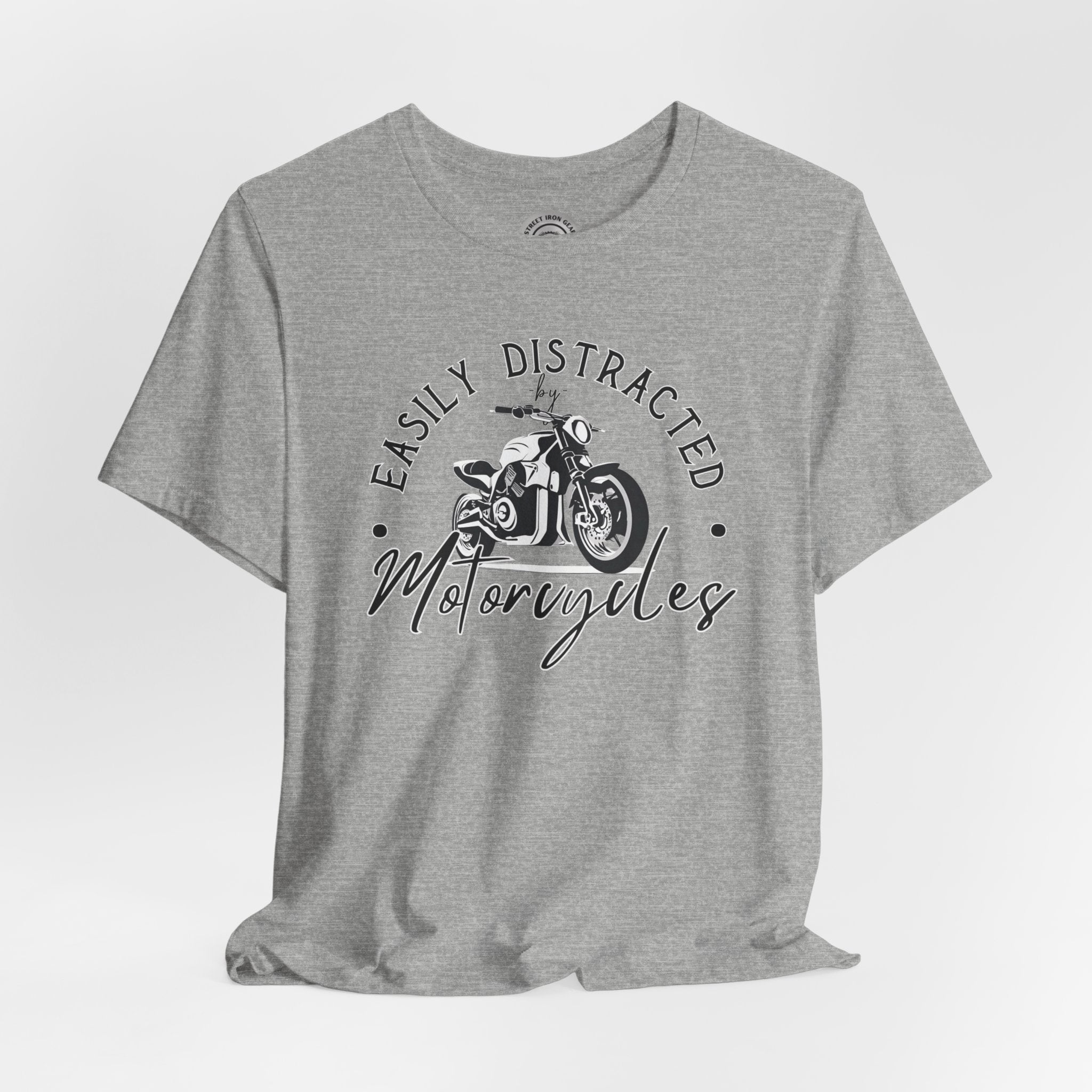 Get noticed with our "Distracted by Motorcycles" T-shirt. The perfect choice for motorcycle enthusiasts, this unisex Motorcycle Shirt is a great gift for both men and women who can't resist the allure of the open road.