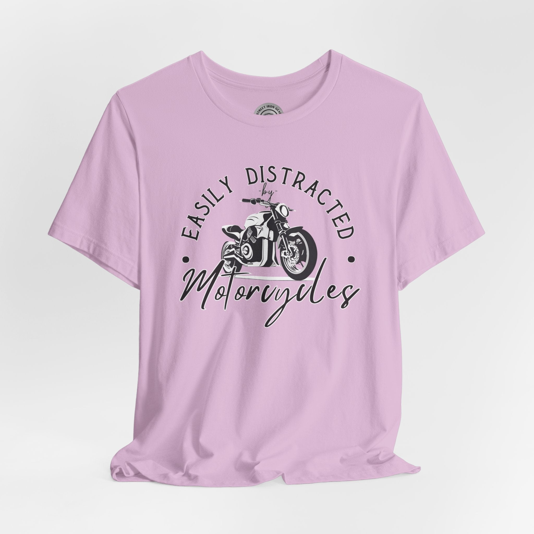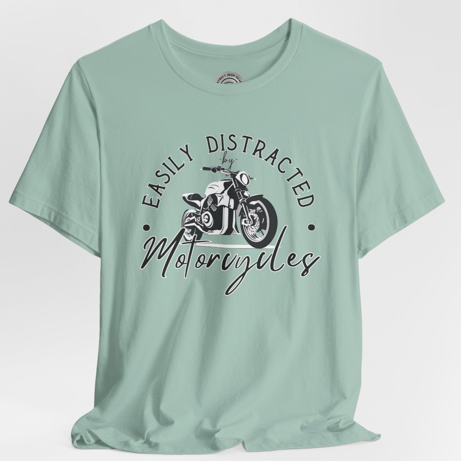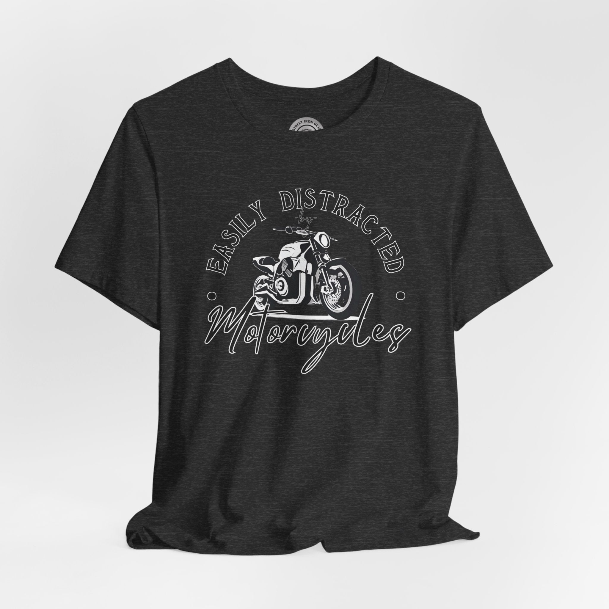 Get noticed with our "Distracted by Motorcycles" T-shirt. The perfect choice for motorcycle enthusiasts, this unisex Motorcycle Shirt is a great gift for both men and women who can't resist the allure of the open road.