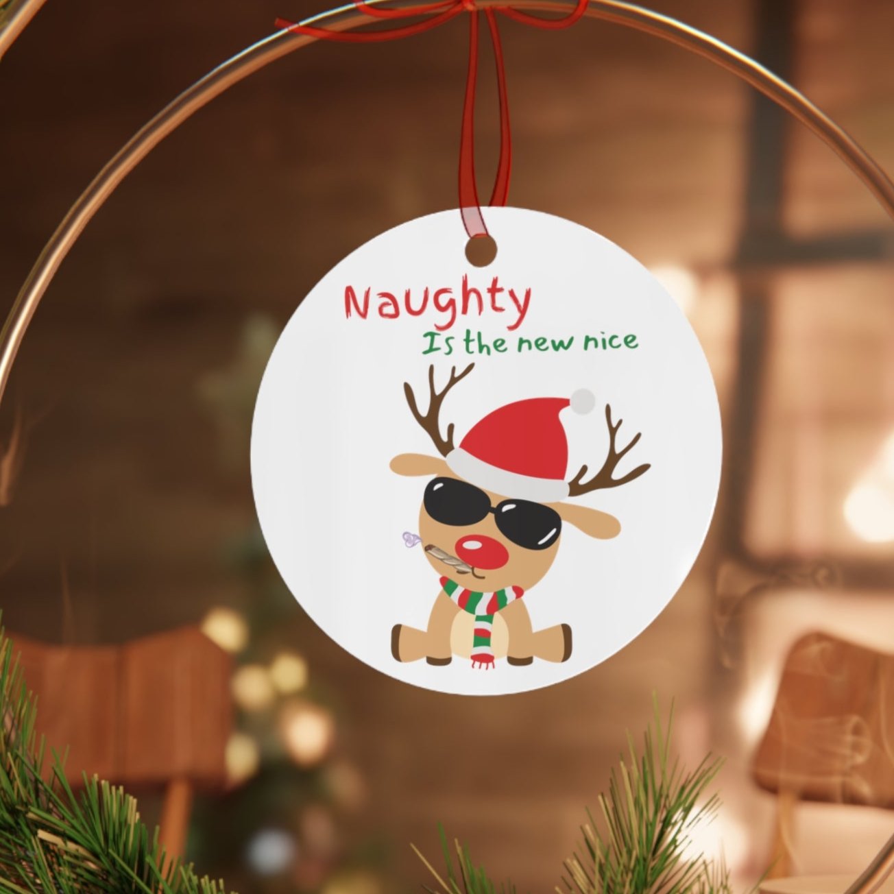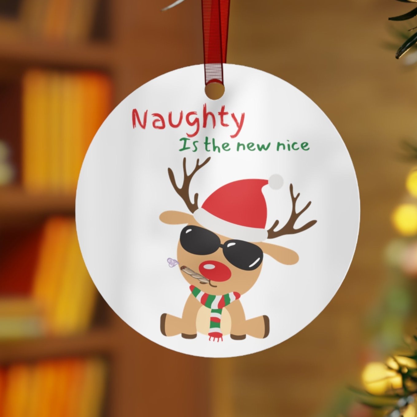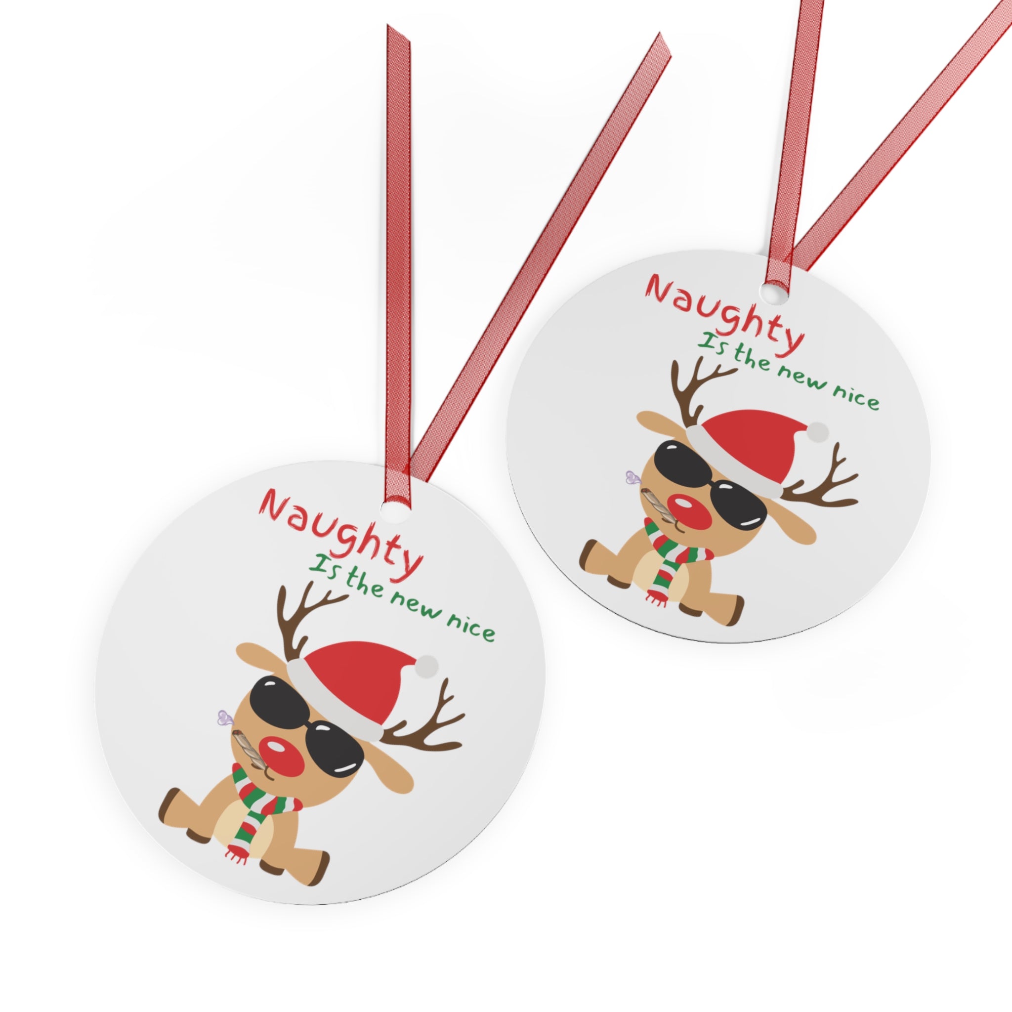 Add some humor to your holiday decor with our custom-designed Christmas ornament featuring a hilarious cartoon-style Rudolph! Sitting on his behind, sporting sunglasses, a Santa hat, and smoking a blunt. Rudolph is embracing the holiday spirit with the funny text "Naughty is the new nice." This unique ornament is perfect for those who love to add a playful, cheeky twist to their Christmas tree. Ideal as a gift for friends or as a standout piece for your own collection, this funny Rudolph ornament is sure to get some laughs!