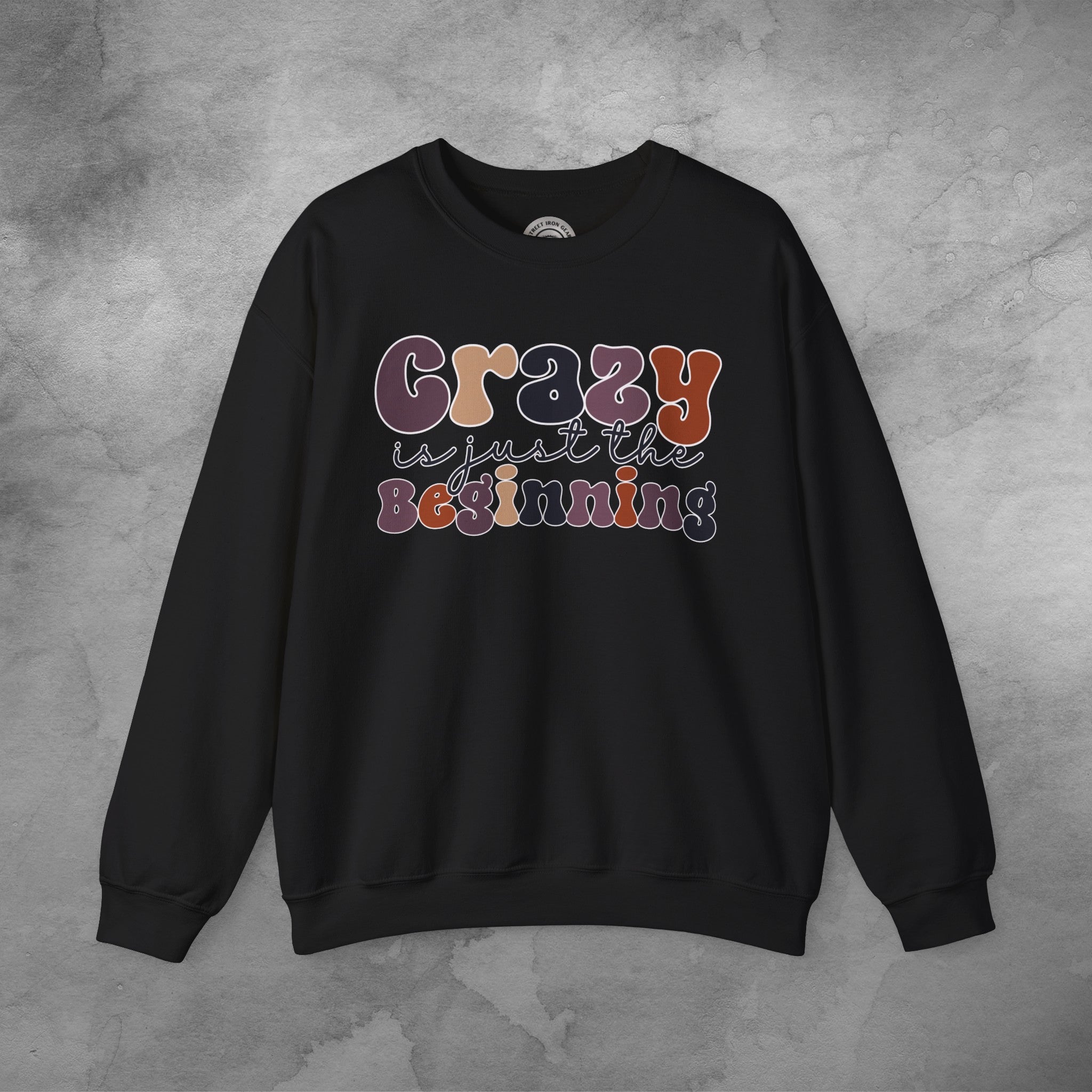Get your retro groove on with our 'Crazy is Just Beginning' sweatshirt. This women's retro motorcycle shirt combines colorful, vintage fonts with a touch of sarcasm. Your crazy journey starts here with this fun and bold Retro Sarcastic Phrase Shirt.