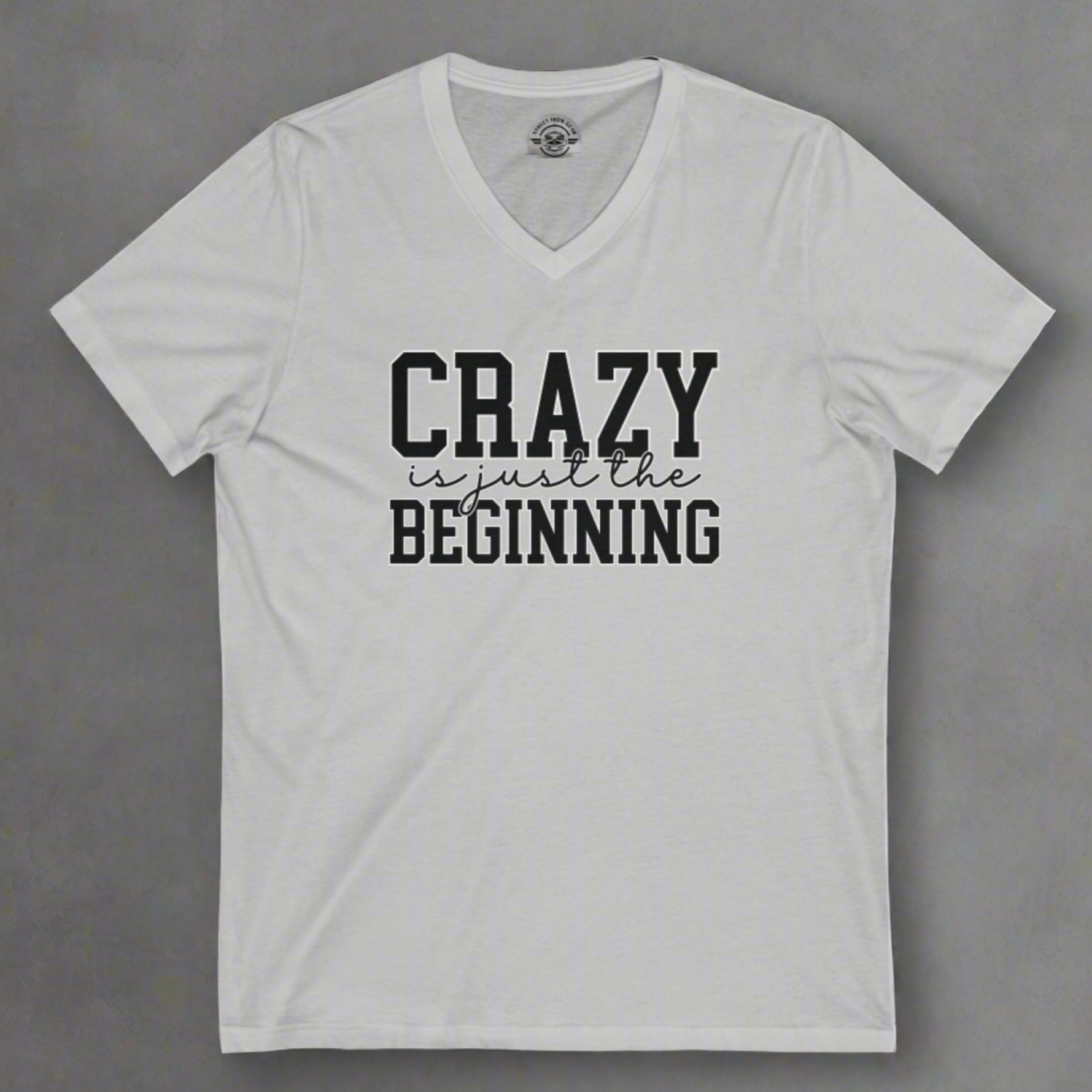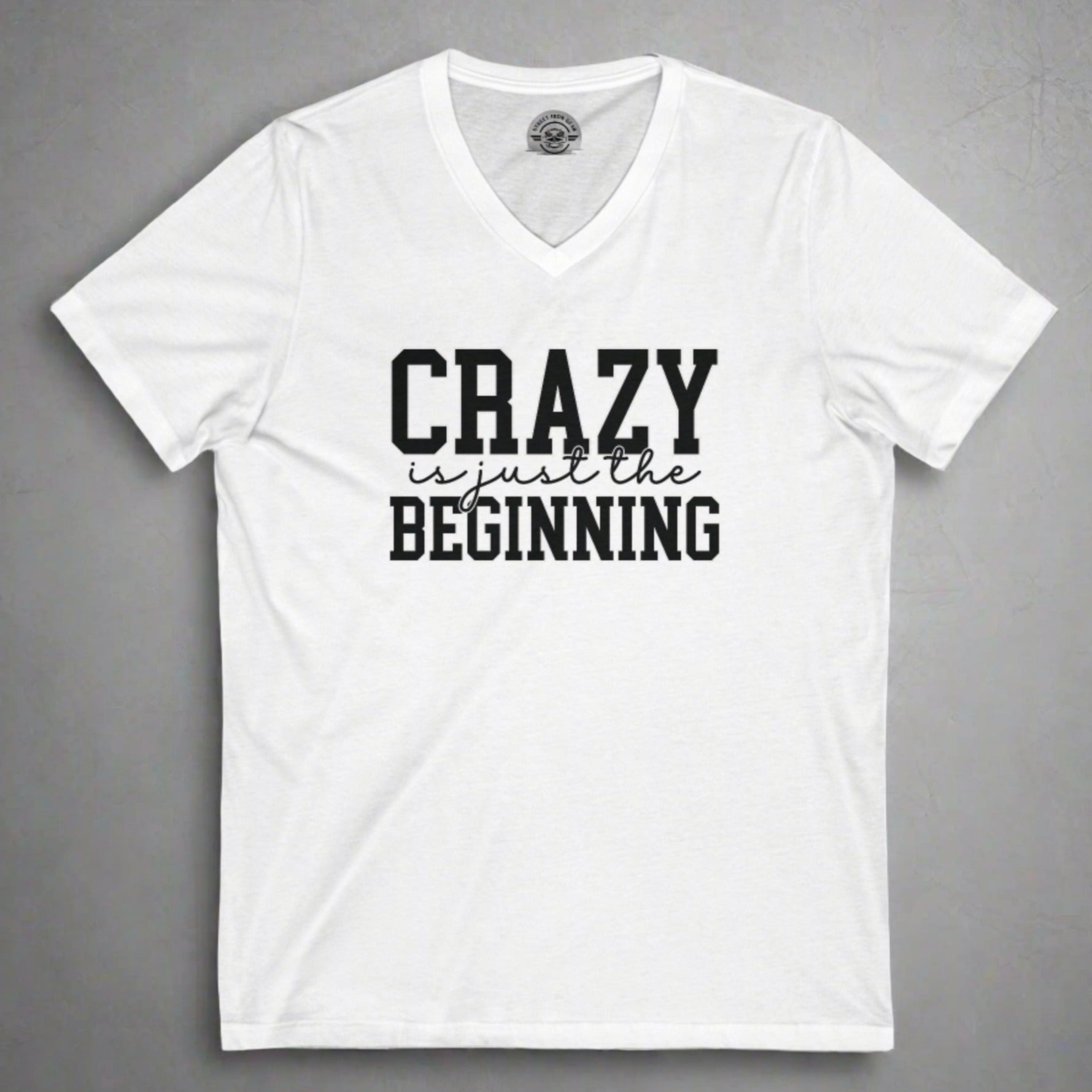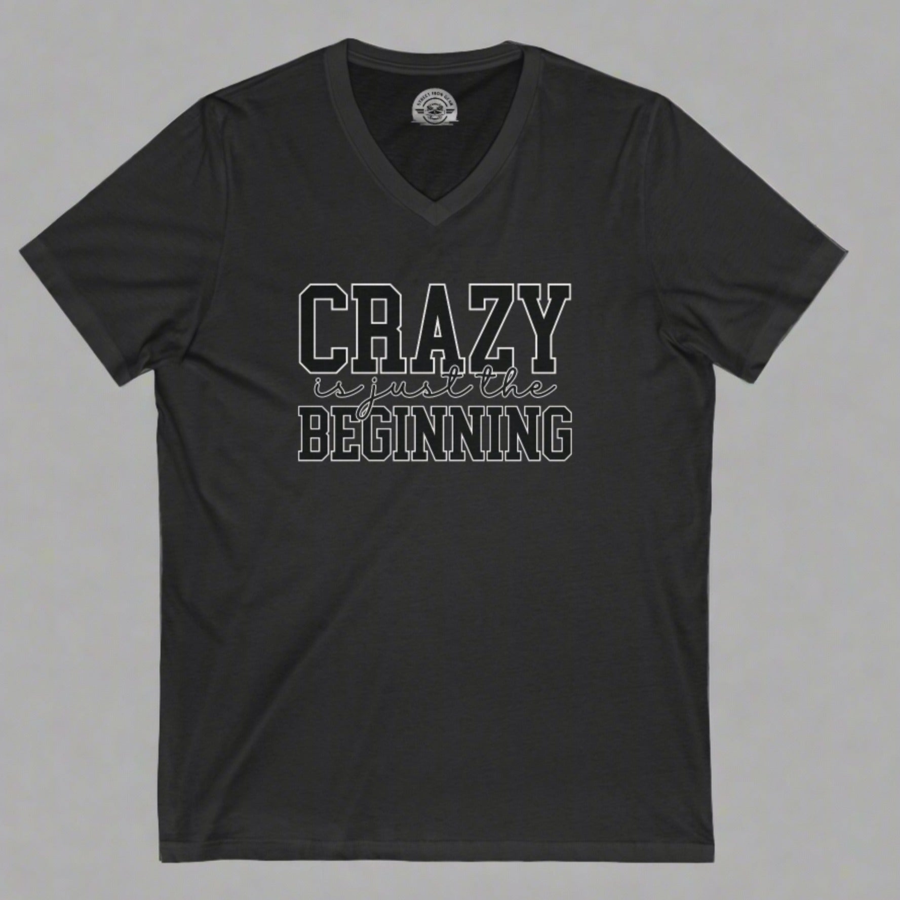 Get ready to turn heads with our 'Crazy is Just the Beginning' V-neck shirt. This fun tee, with its black and white college vibe font, will add a pop of personality to your outfit. Embrace your uniqueness and let the adventure begin!
