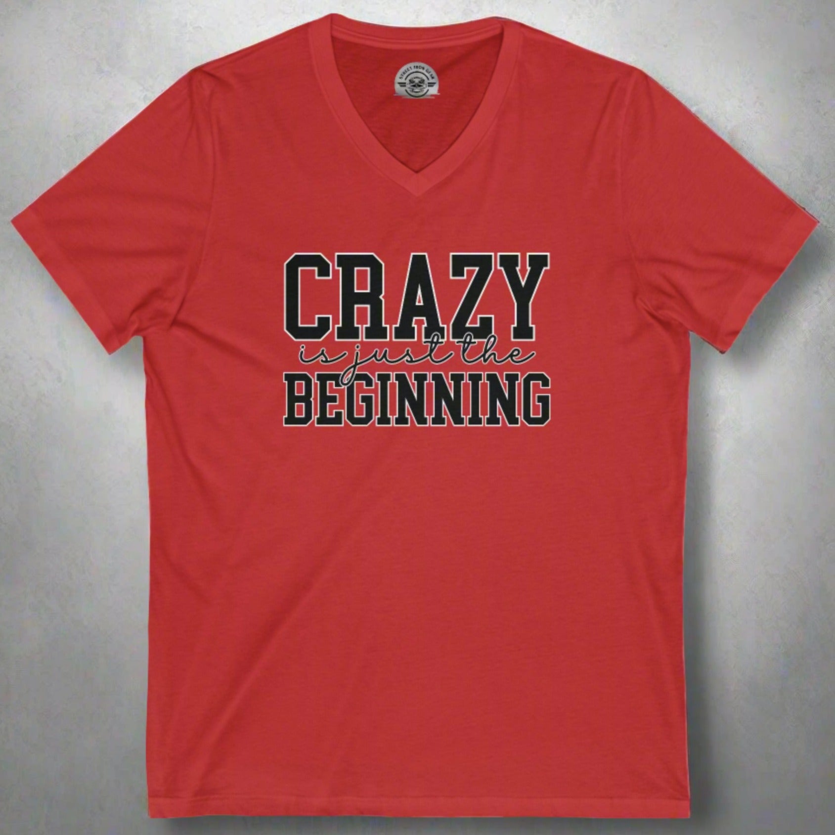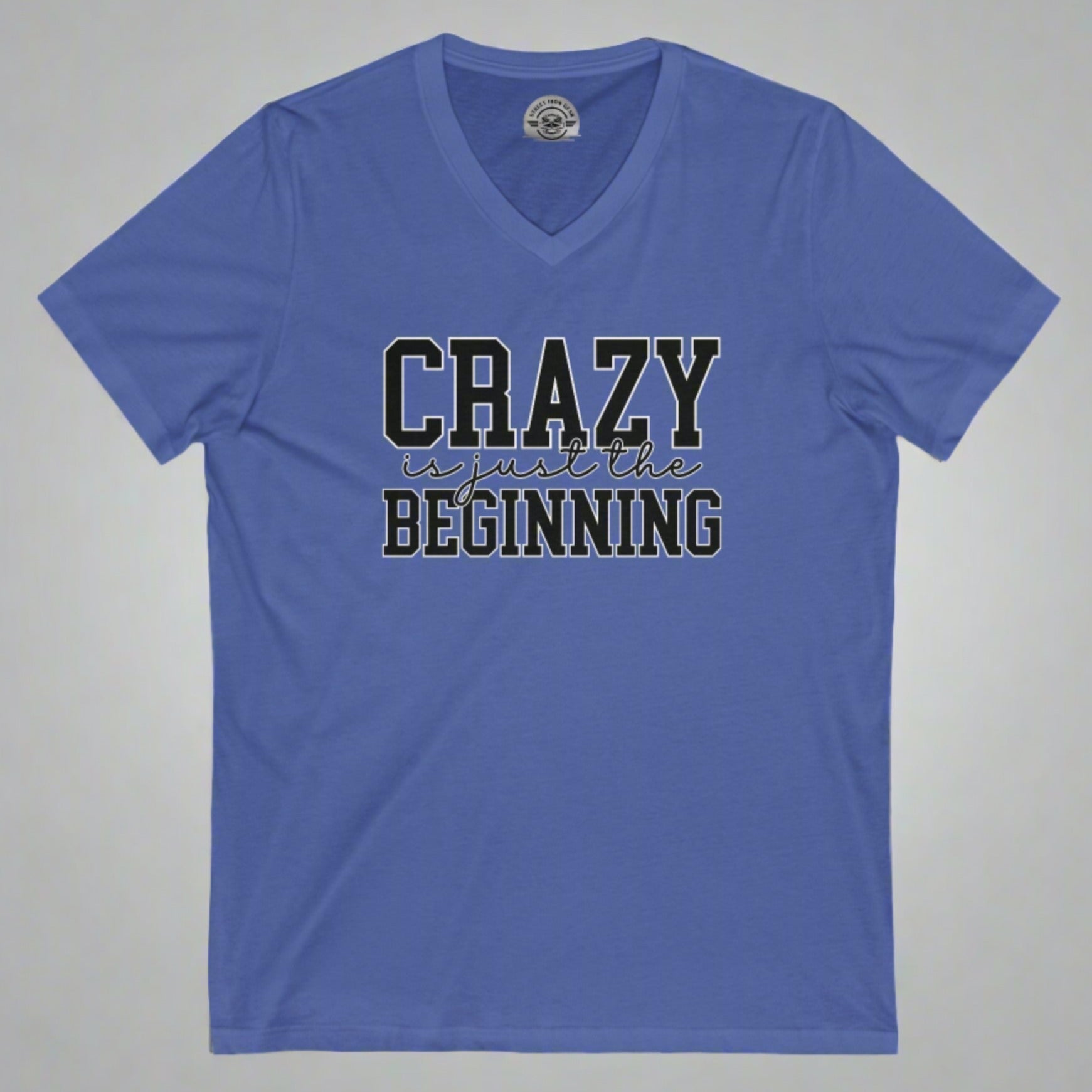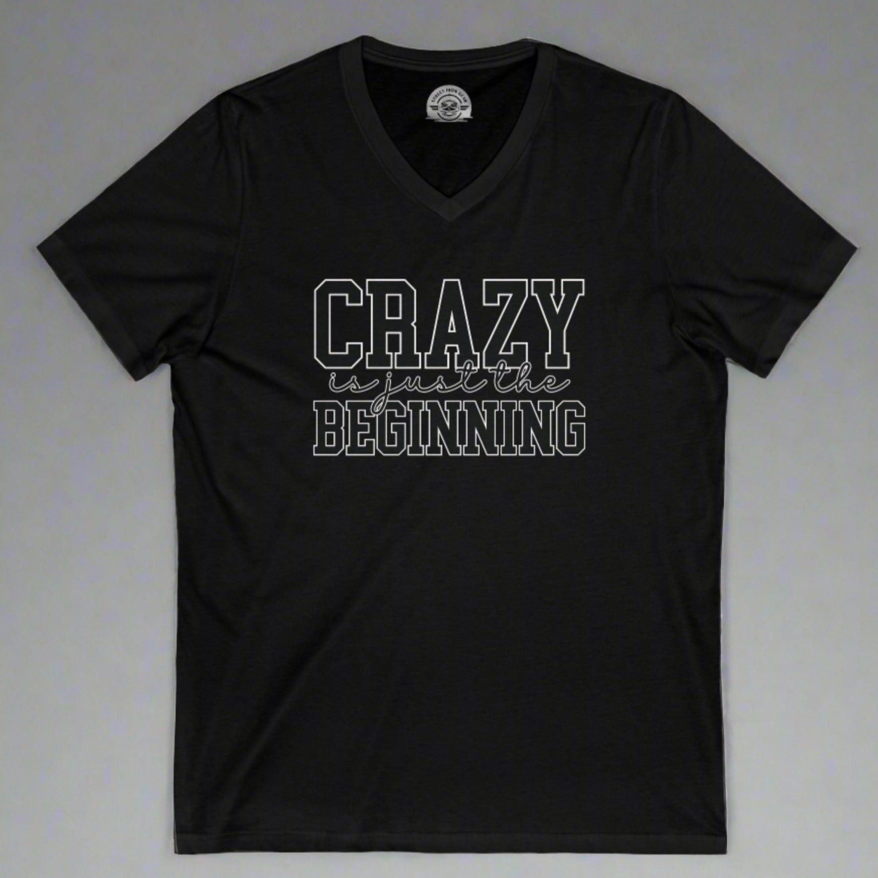 Get ready to turn heads with our 'Crazy is Just the Beginning' V-neck shirt. This fun tee, with its black and white college vibe font, will add a pop of personality to your outfit. Embrace your uniqueness and let the adventure begin!
