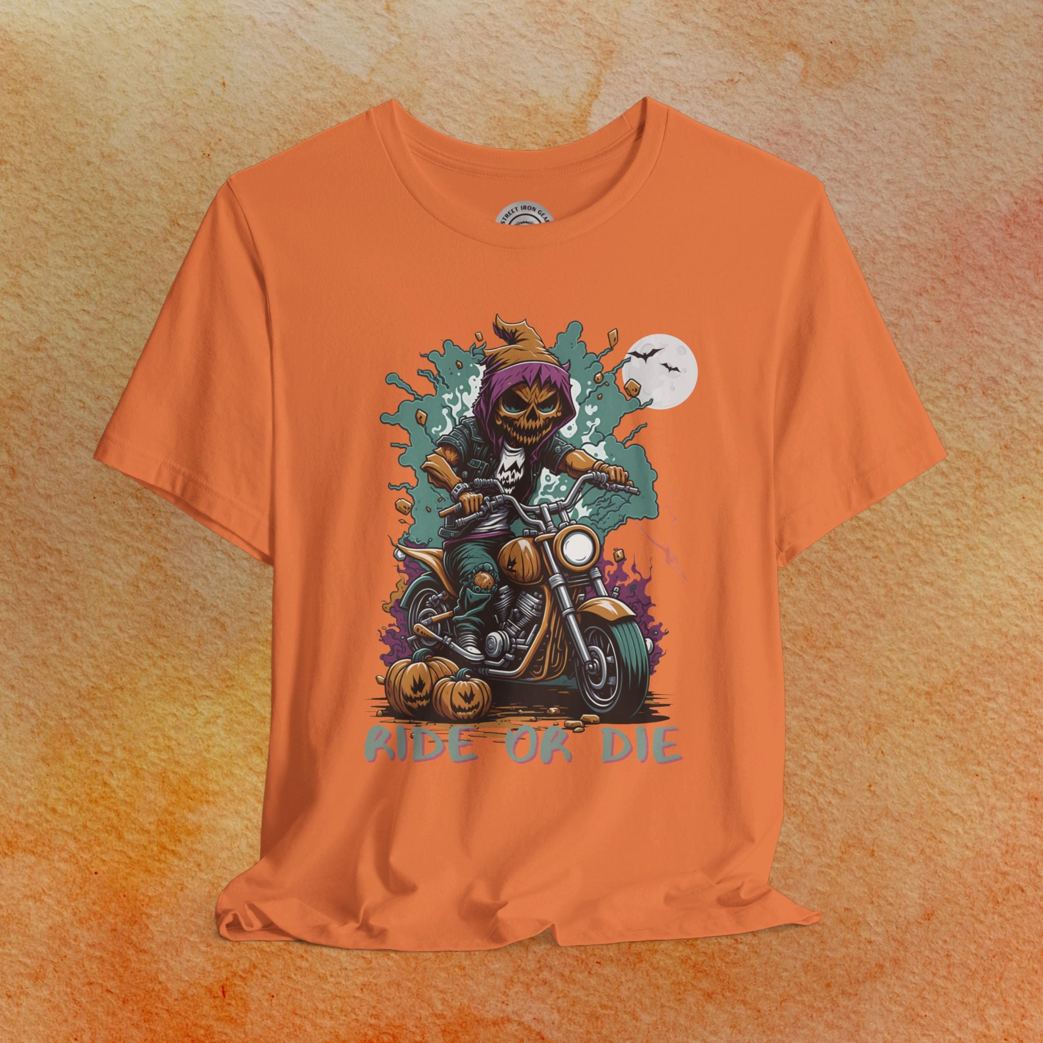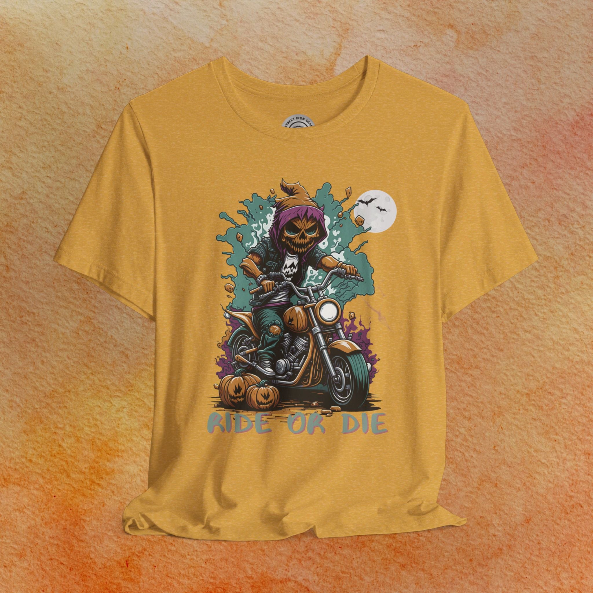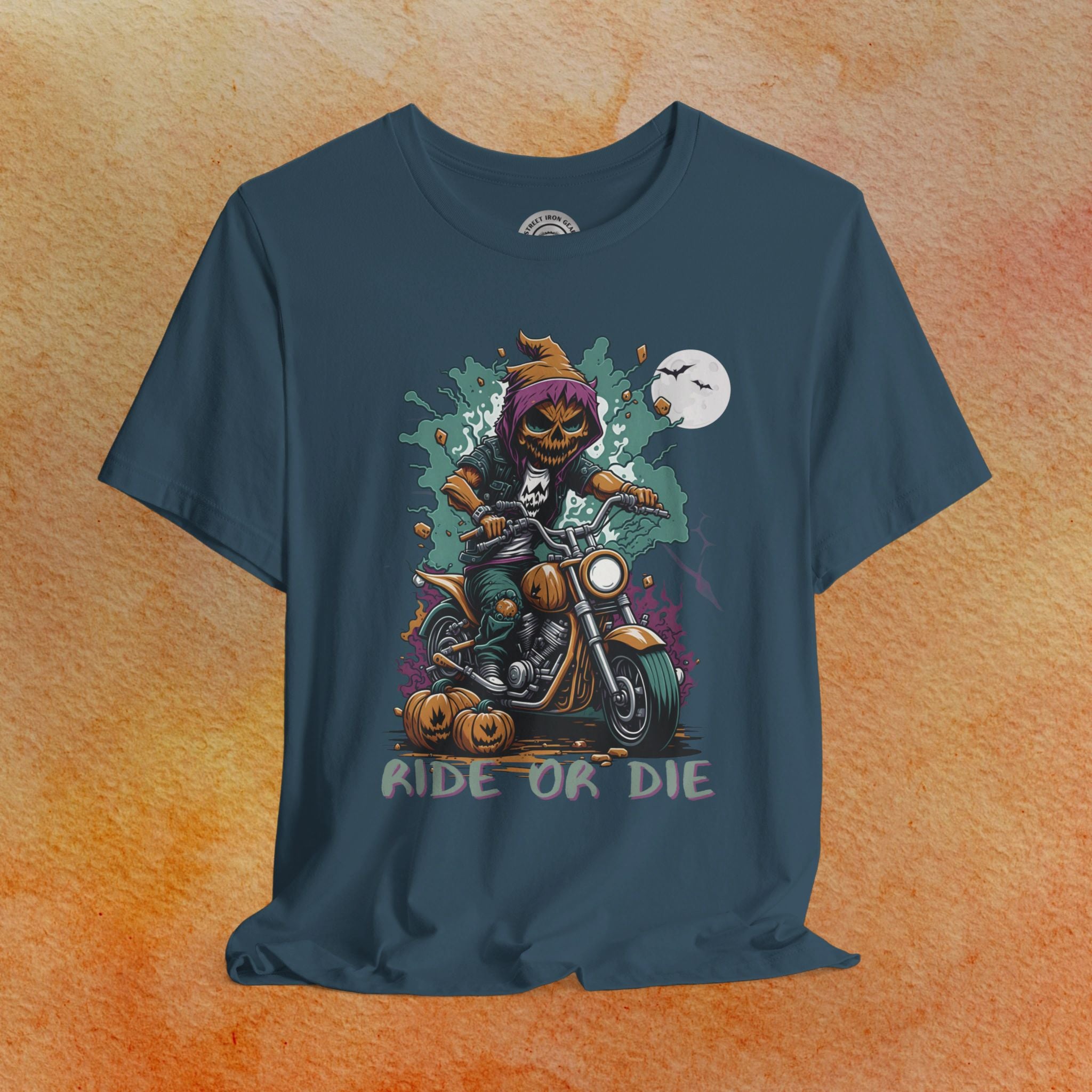 Get into the Halloween spirit with our Spooky Halloween T-Shirt, perfect for motorcycle enthusiasts! Featuring a menacing Pumpkin Skull Rider on a classic motorcycle, this tee captures the thrill of the ride with a haunting twist. The muted Halloween colors and bold "Ride or Die" text make it a standout piece for the season. Ideal for fall rides, Halloween parties, or simply showing off your spooky side, this shirt is a must-have for any biker who loves to embrace the darker side of the road. Perfect for motorcycle Halloween apparel, biker Halloween costumes, and spooky biker gear.