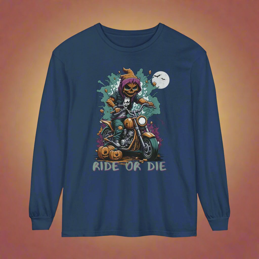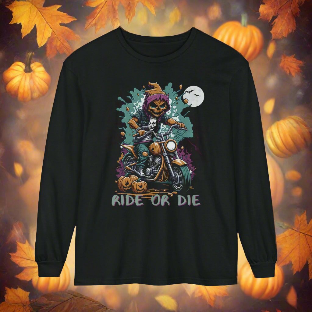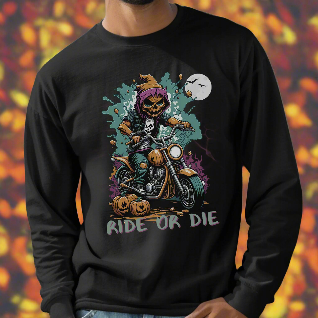 Get into the Halloween spirit with our Spooky Halloween T-Shirt, perfect for motorcycle enthusiasts! Featuring a menacing Pumpkin Skull Rider on a classic motorcycle, this tee captures the thrill of the ride with a haunting twist. The muted Halloween colors and bold "Ride or Die" text make it a standout piece for the season. Ideal for fall rides, Halloween parties, or simply showing off your spooky side, this shirt is a must-have for any biker who loves to embrace the darker side of the road. Perfect for motorcycle Halloween apparel, biker Halloween costumes, and spooky biker gear.