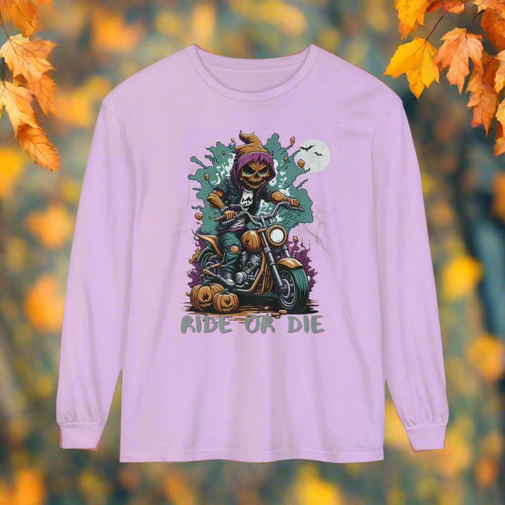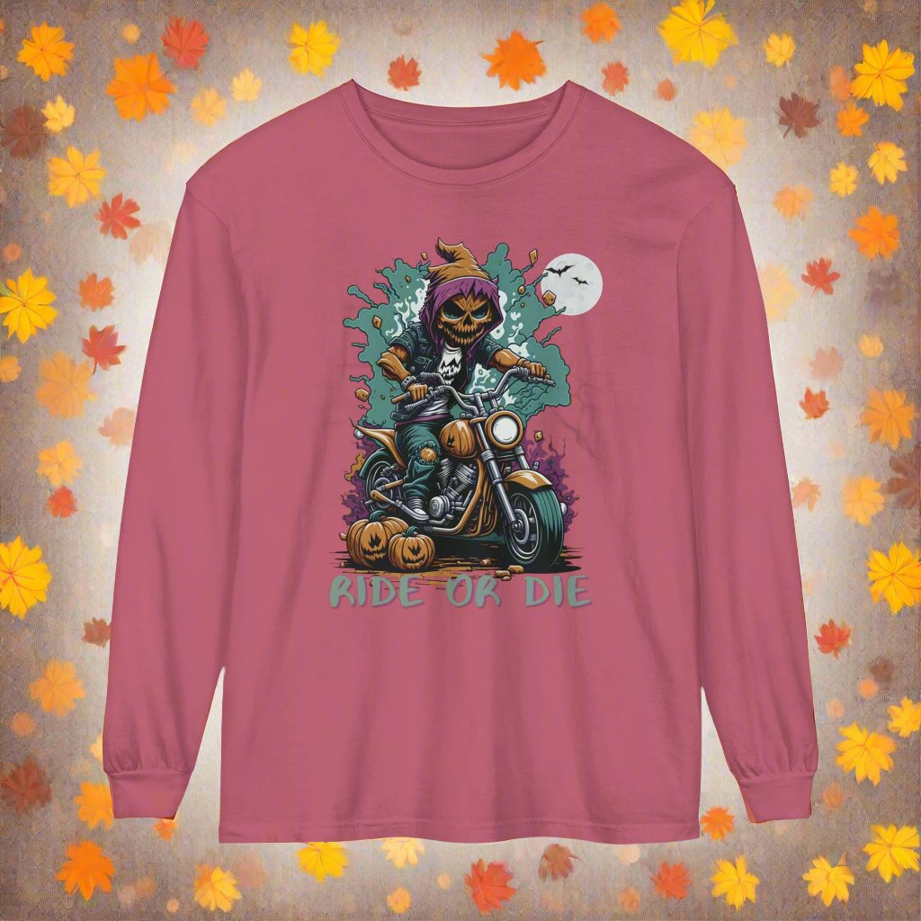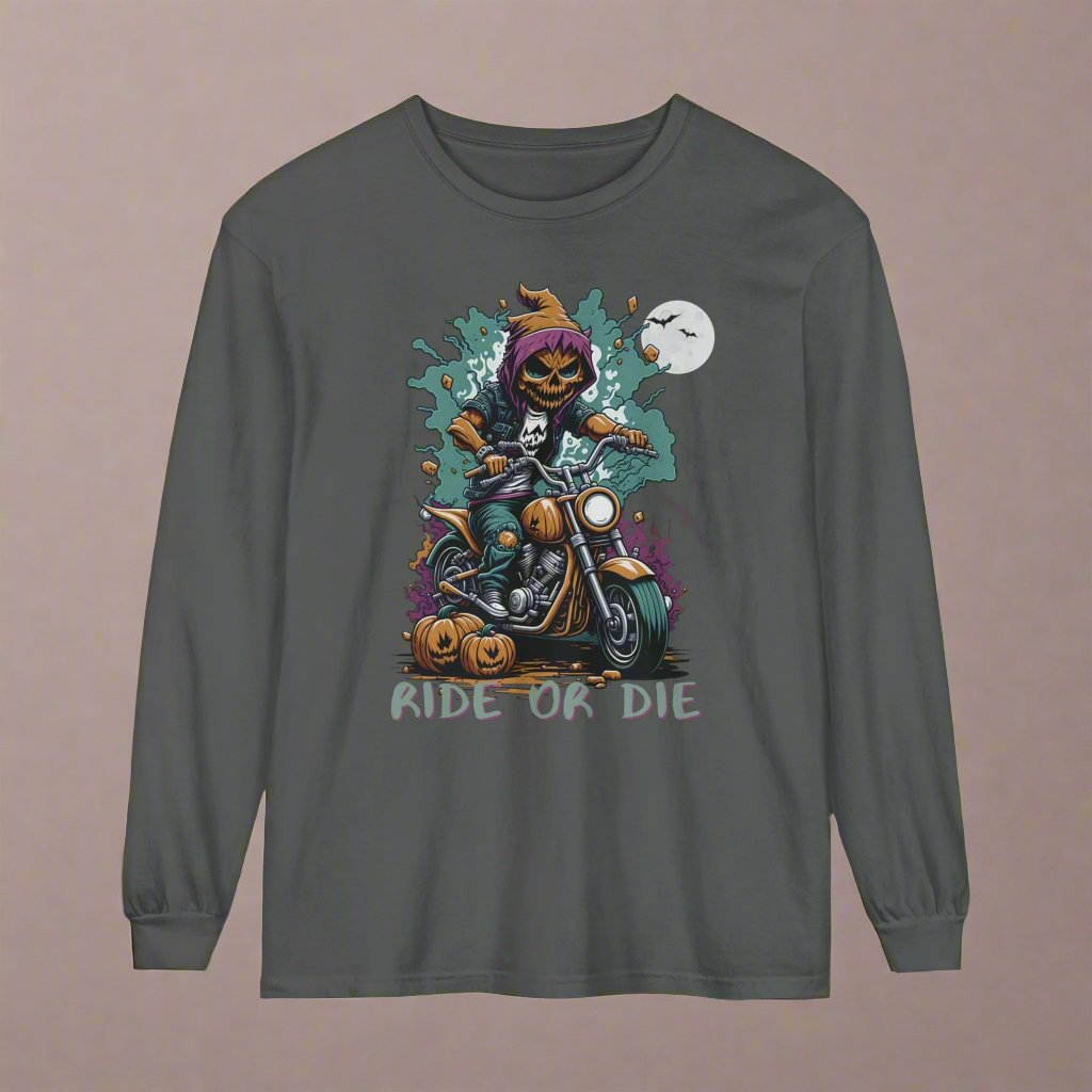 Get into the Halloween spirit with our Spooky Halloween T-Shirt, perfect for motorcycle enthusiasts! Featuring a menacing Pumpkin Skull Rider on a classic motorcycle, this tee captures the thrill of the ride with a haunting twist. The muted Halloween colors and bold "Ride or Die" text make it a standout piece for the season. Ideal for fall rides, Halloween parties, or simply showing off your spooky side, this shirt is a must-have for any biker who loves to embrace the darker side of the road. Perfect for motorcycle Halloween apparel, biker Halloween costumes, and spooky biker gear.
