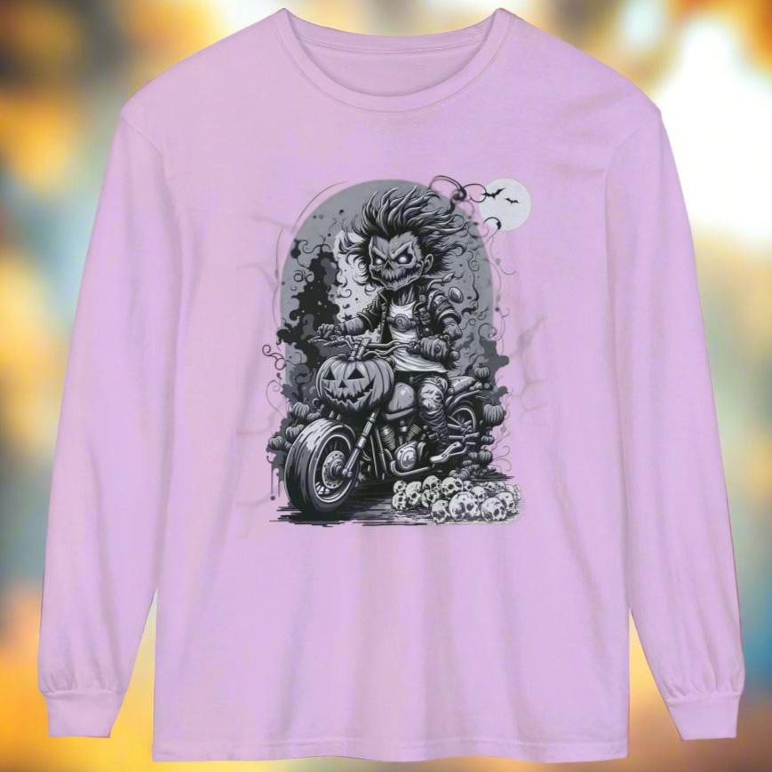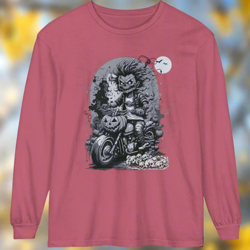 Unleash your spooky side this Halloween with our Pumpkin Skull Rider T-Shirt, designed for true motorcycle enthusiasts. This eerie tee features a menacing pumpkin skull riding a classic motorcycle, all depicted in a vintage monochrome style. Perfect for Halloween rides or as a standout piece in your biker wardrobe, this shirt combines Halloween spirit with timeless biker cool. Ideal for gifting or treating yourself, it’s a must-have for those who live for the open road. Get ready to ride in style this spooky season!