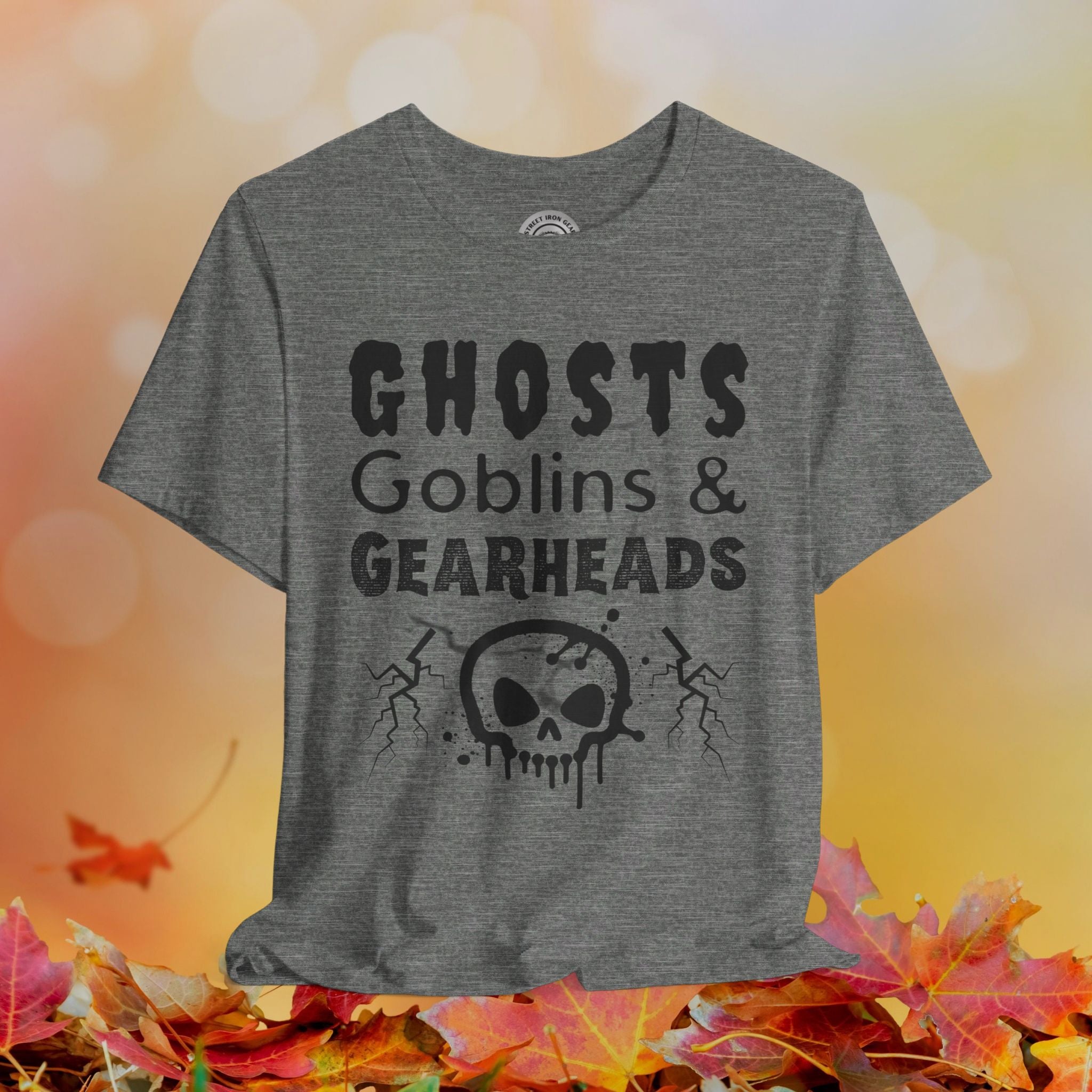 Get ready for Halloween with our Fun Halloween Tee designed for motorcycle and car enthusiasts! This edgy shirt features a grunge skull with a striking lightning background, perfect for those who love to celebrate with a spooky twist. The bold text "Ghosts, Goblins & Gearheads" makes it a must-have for anyone who lives for the thrill of the ride. Ideal for Halloween parties, rides, or just showing off your unique style, this tee is sure to turn heads. Perfect for Halloween lovers, bikers, and gearheads alike!