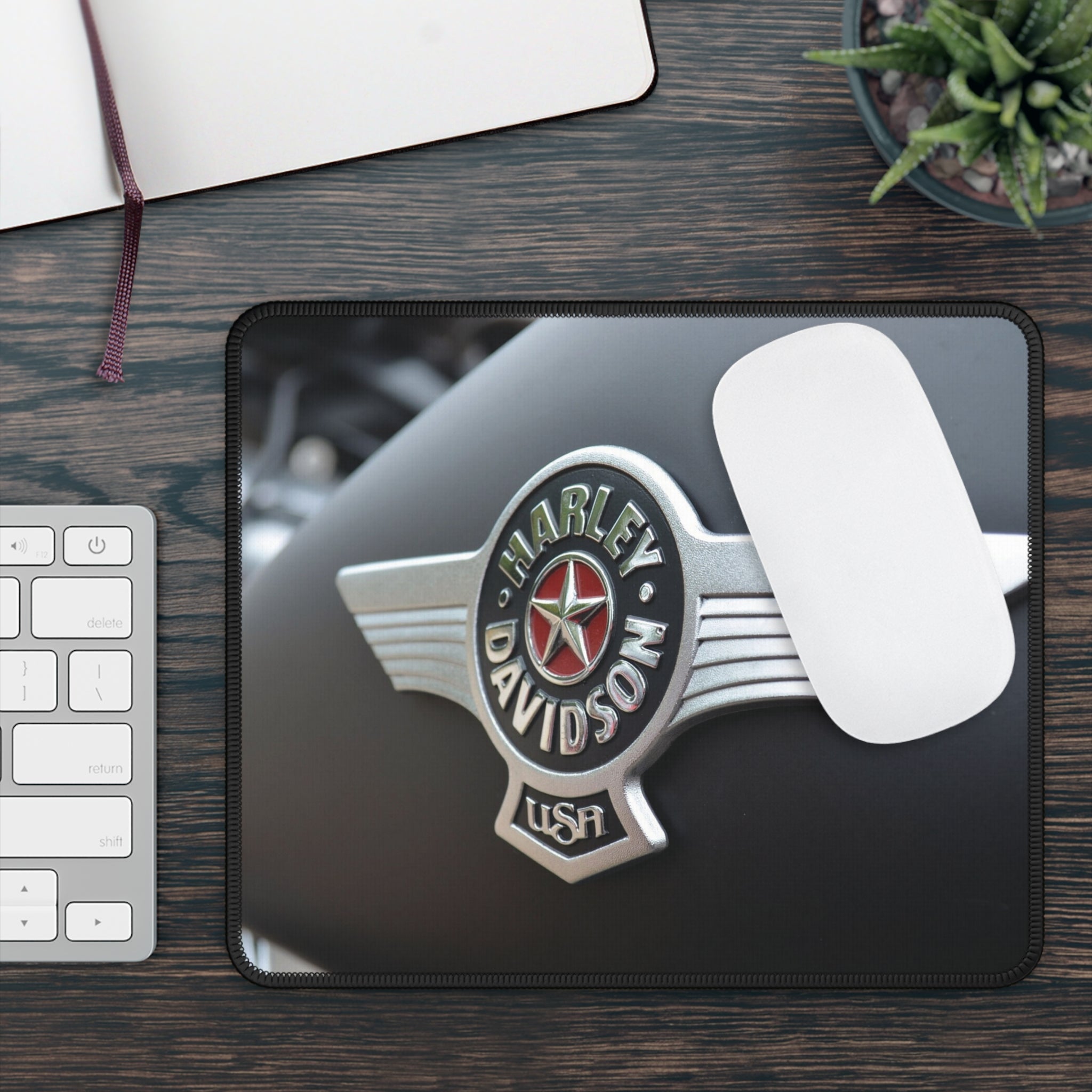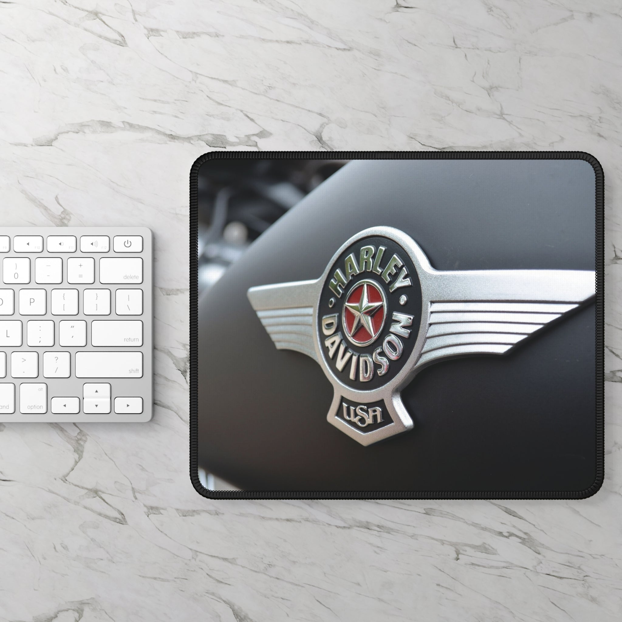 Upgrade your workspace with our Harley Davidson Mouse Pad, featuring a premium photographic image of a close-up Harley emblem on a gas tank. Designed for motorcycle enthusiasts, this mouse pad offers a smooth surface for precise mouse control and a non-slip backing for stability. Perfect for adding a touch of Harley pride to your desk, it's an ideal gift for Harley Davidson fans or anyone who loves classic motorcycle style. Bring the spirit of the open road into your home or office with this must-have accessory!