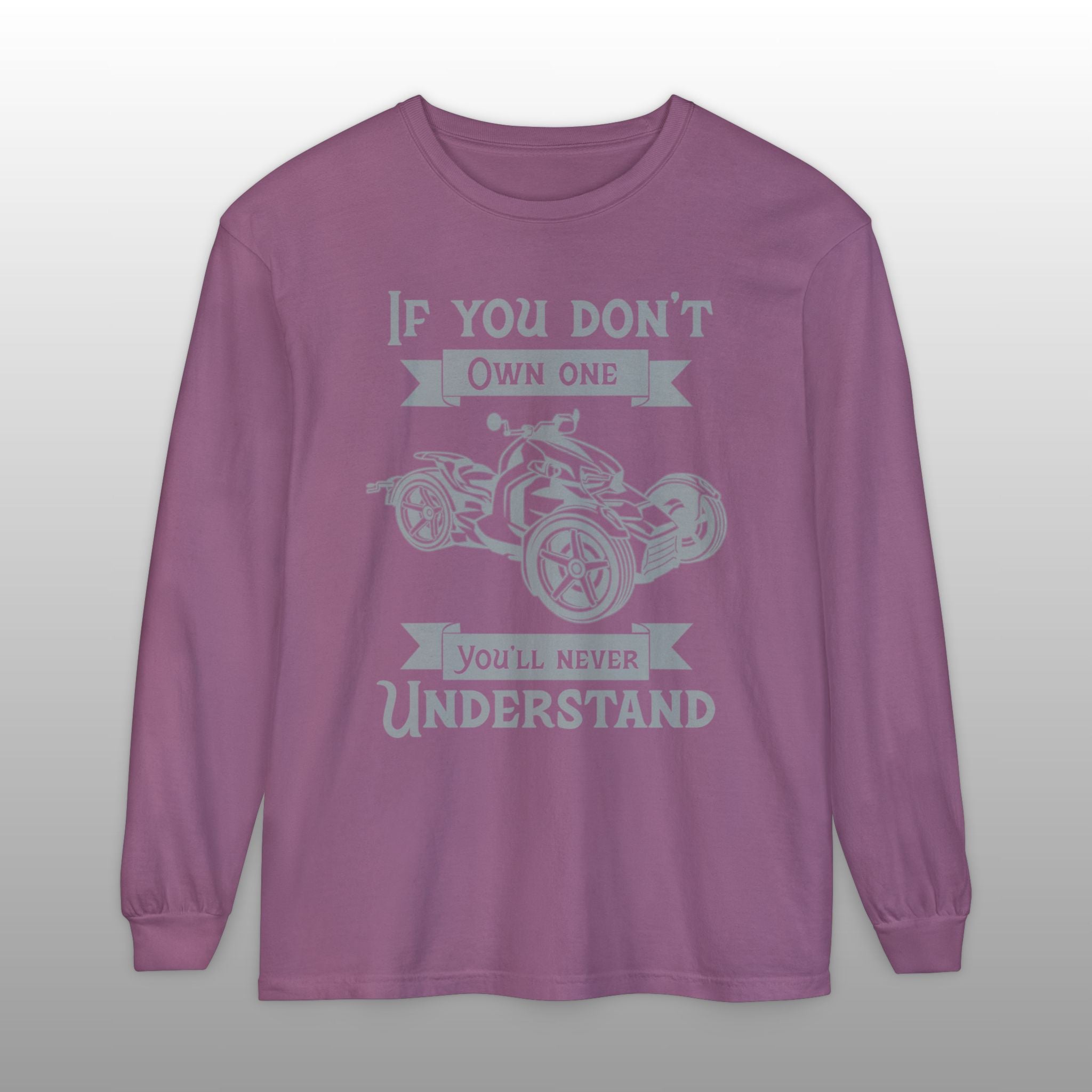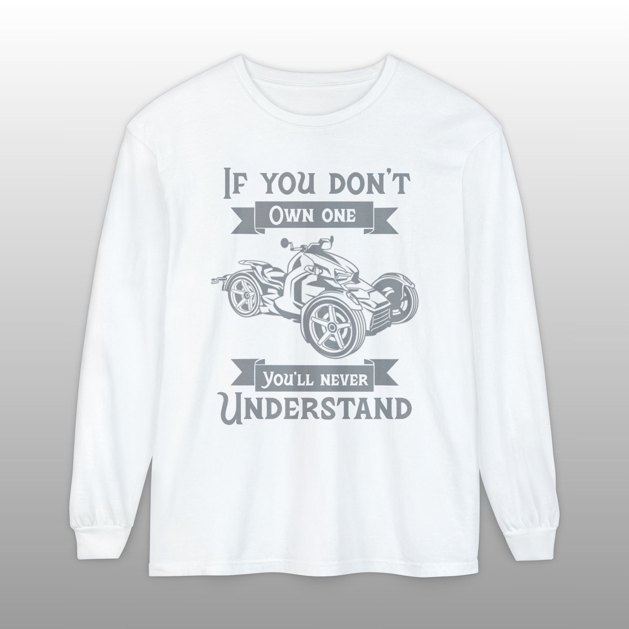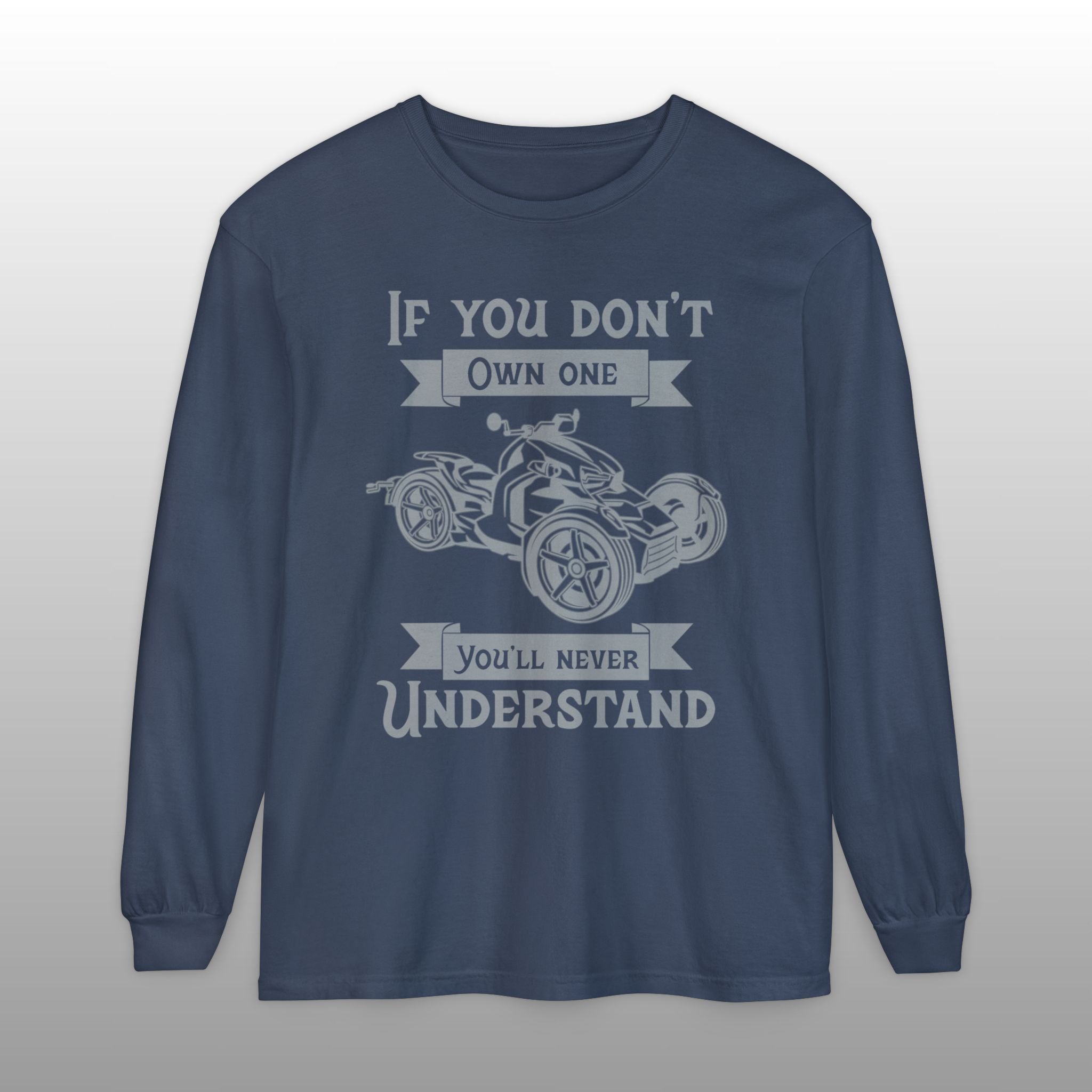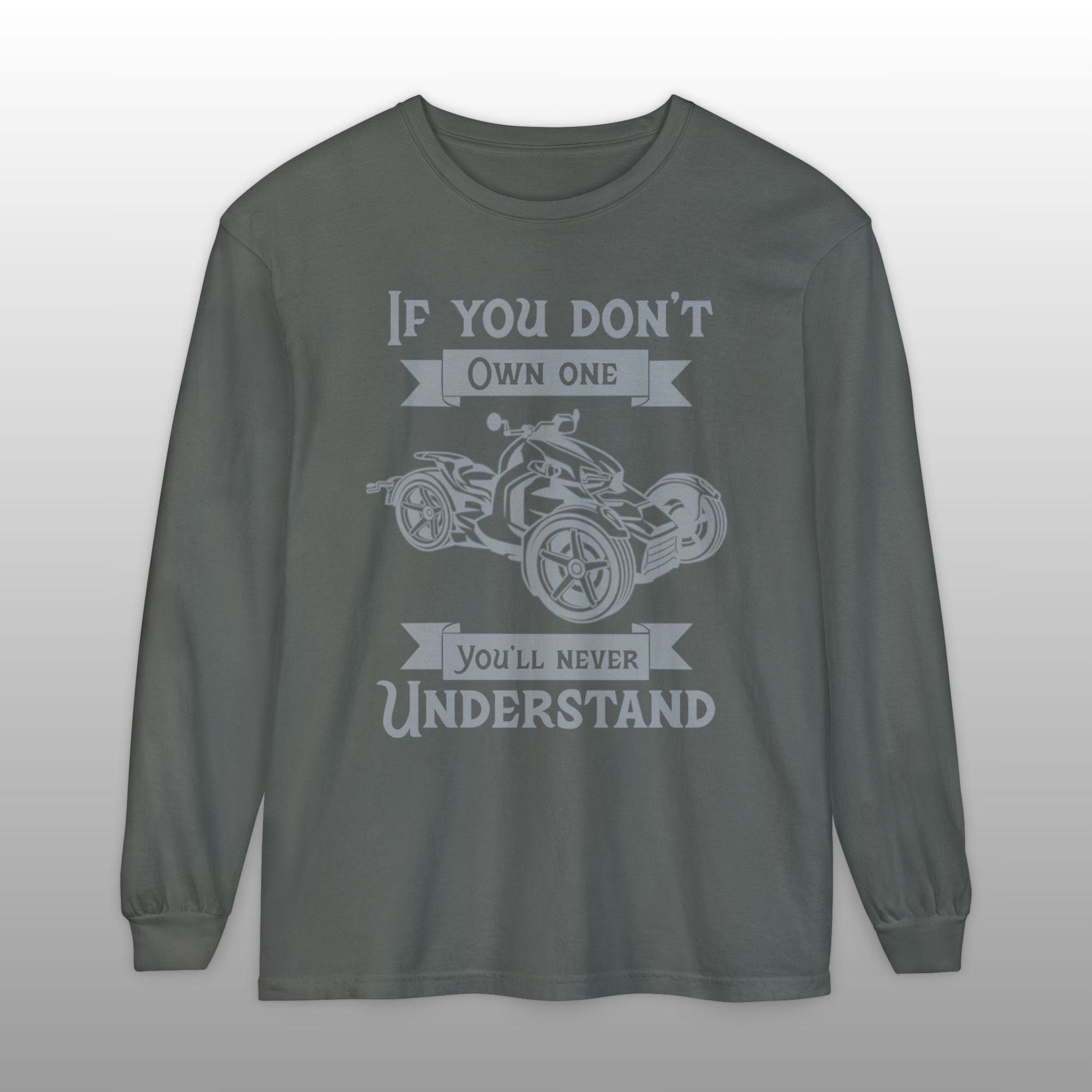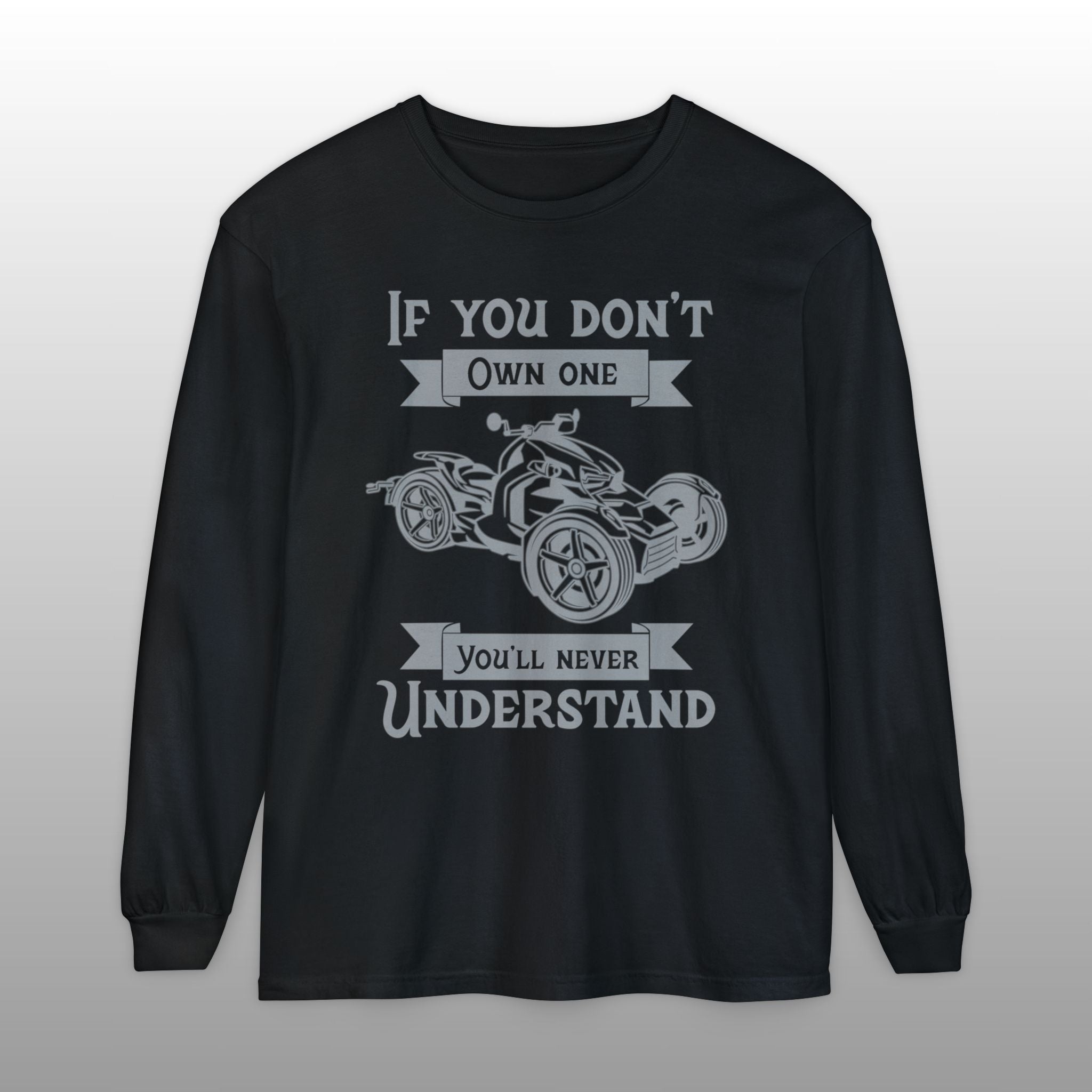 Show off your rider pride with this bold Can-Am Ryker long sleeve tee! This shirt is for every Ryker owner who knows that the open road is a lifestyle few truly understand. The design features a sleek, monochrome graphic of a Ryker silhouette, accented by a powerful slogan that speaks directly to the rider's experience. This classic biker-style design is a nod to the passion and pride of the Ryker community. Its striking black and gray look ensures it pairs well with any rider's gear. Made from a comfortable, high-quality fabric, this tee is perfect for cooler days or layering. It's an ideal piece of Ryker rider apparel and a must-have for any Can-Am Ryker enthusiast. It also makes a perfect motorcycle gift for men or women.