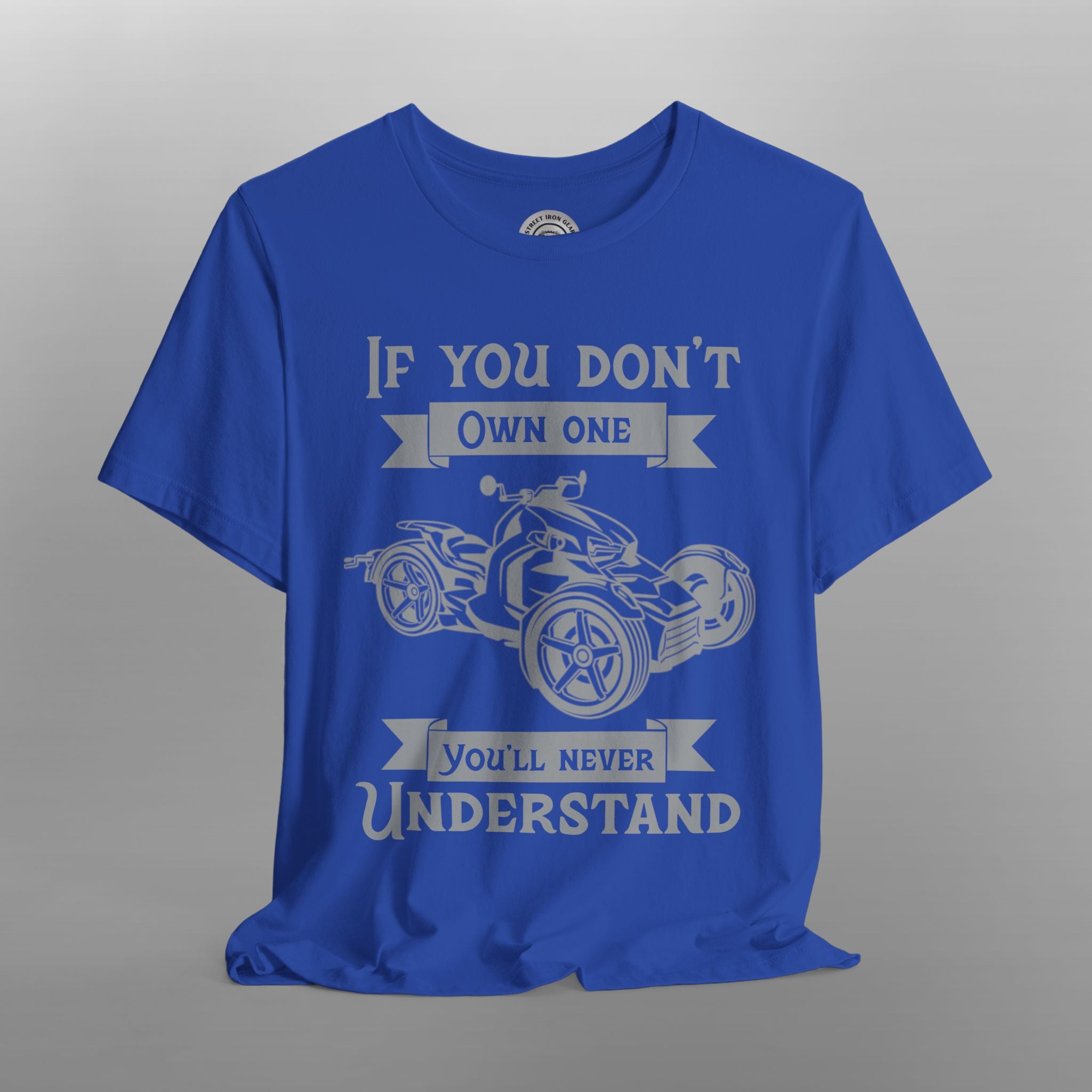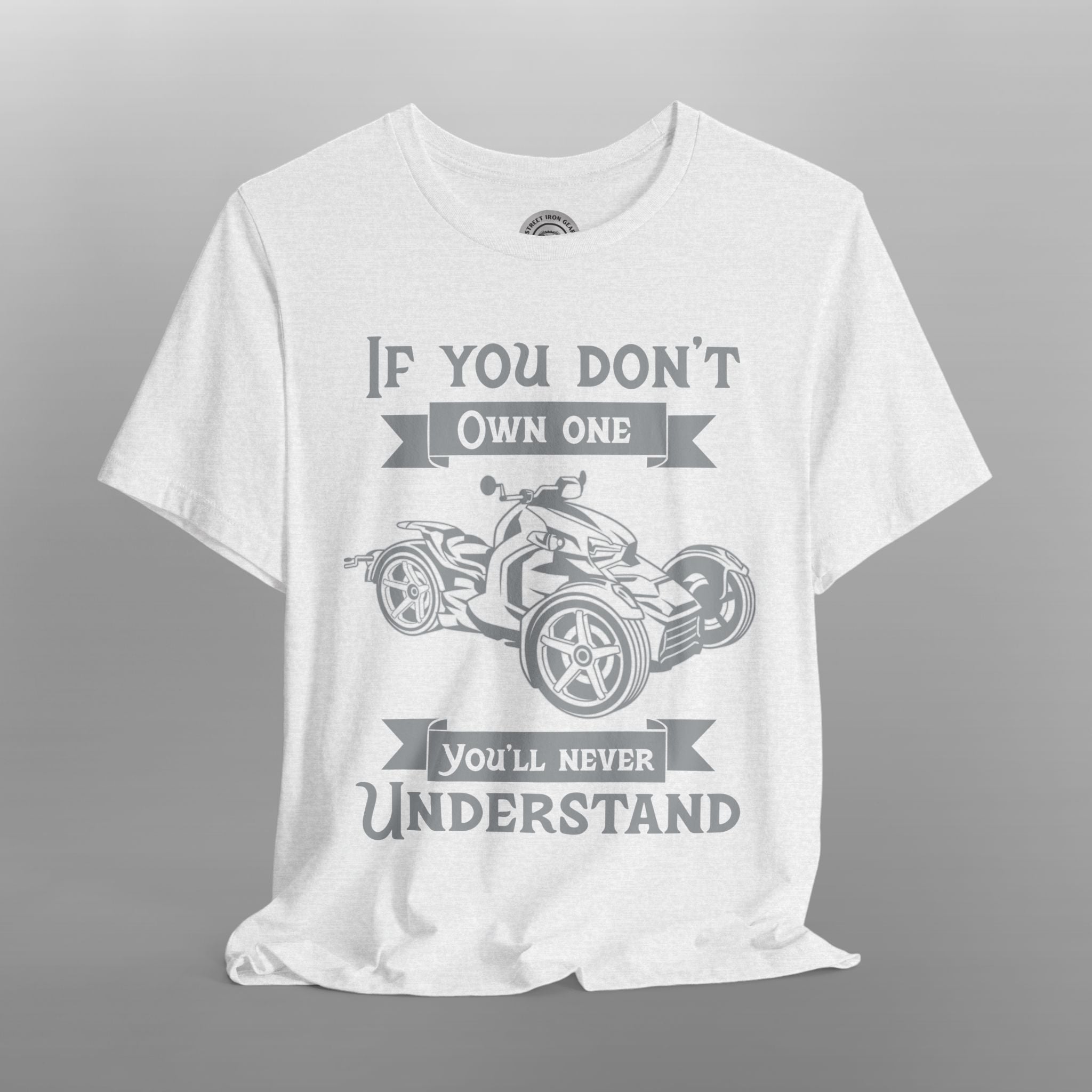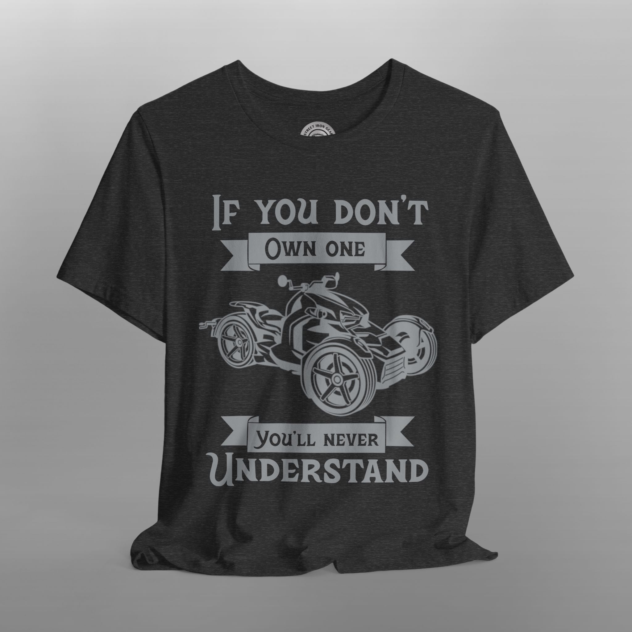 Show off your rider pride with this bold Can-Am Ryker crew beck tee! This shirt is for every Ryker owner who knows that the open road is a lifestyle few truly understand. The design features a sleek, monochrome graphic of a Ryker silhouette, accented by a powerful slogan that speaks directly to the rider's experience. This classic biker-style design is a nod to the passion and pride of the Ryker community. Its striking gray look ensures it pairs well with any rider's gear. Made from a comfortable, high-quality fabric, this tee is perfect for summer days or layering. It's an ideal piece of Ryker rider apparel and a must-have for any Can-Am Ryker enthusiast. It also makes a perfect motorcycle gift for men or women.