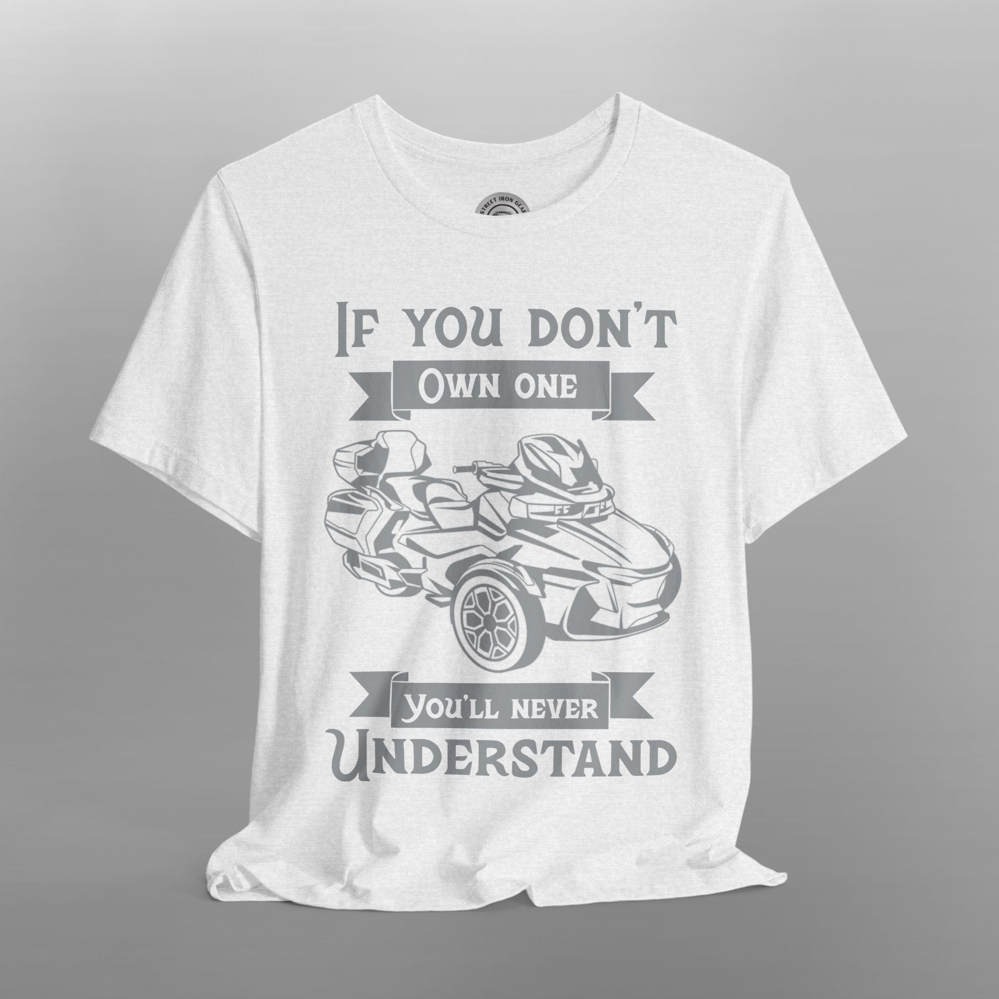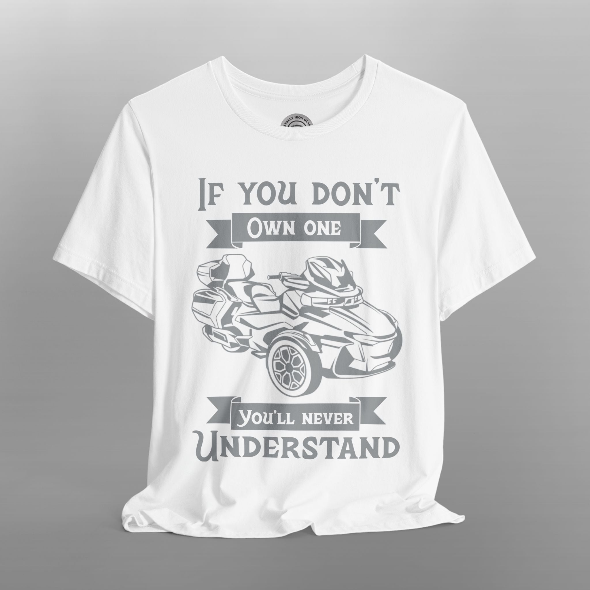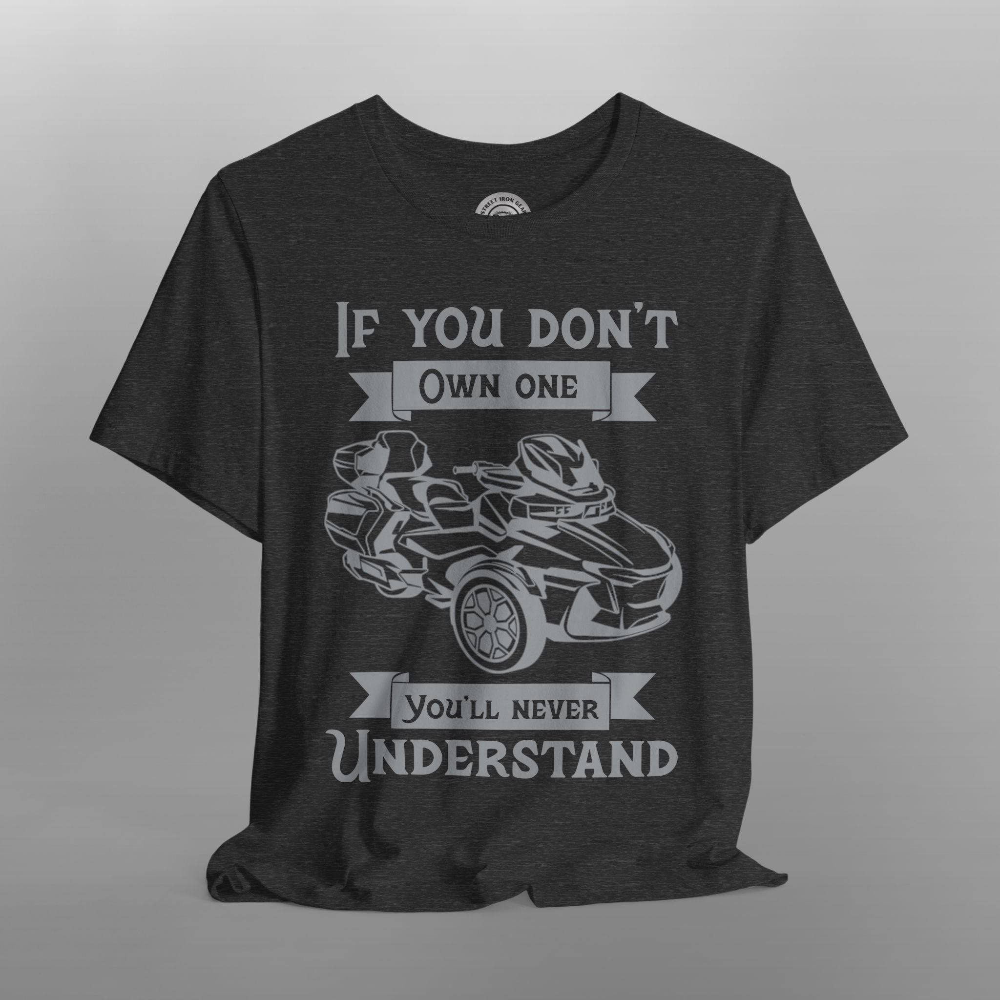 Speak the truth of the road with this classic, crew neck tee designed exclusively for Can-Am Spyder RT owners! This shirt is more than just apparel; it's a statement that captures the unique pride of riding a Spyder RT. The design features a classic motorcycle-inspired graphic with a detailed illustration of the iconic Spyder RT model. At the core of the design is the bold, straightforward slogan that every owner understands: "If you don't own one you'll never understand." This tee is a direct nod to the exclusive community of Spyder riders. Made from a soft, high-quality fabric, this shirt is comfortable for riding or casual wear. It’s the perfect addition to any Can-Am rider's gear and a great gift for the biker in your life who lives the powersports lifestyle.