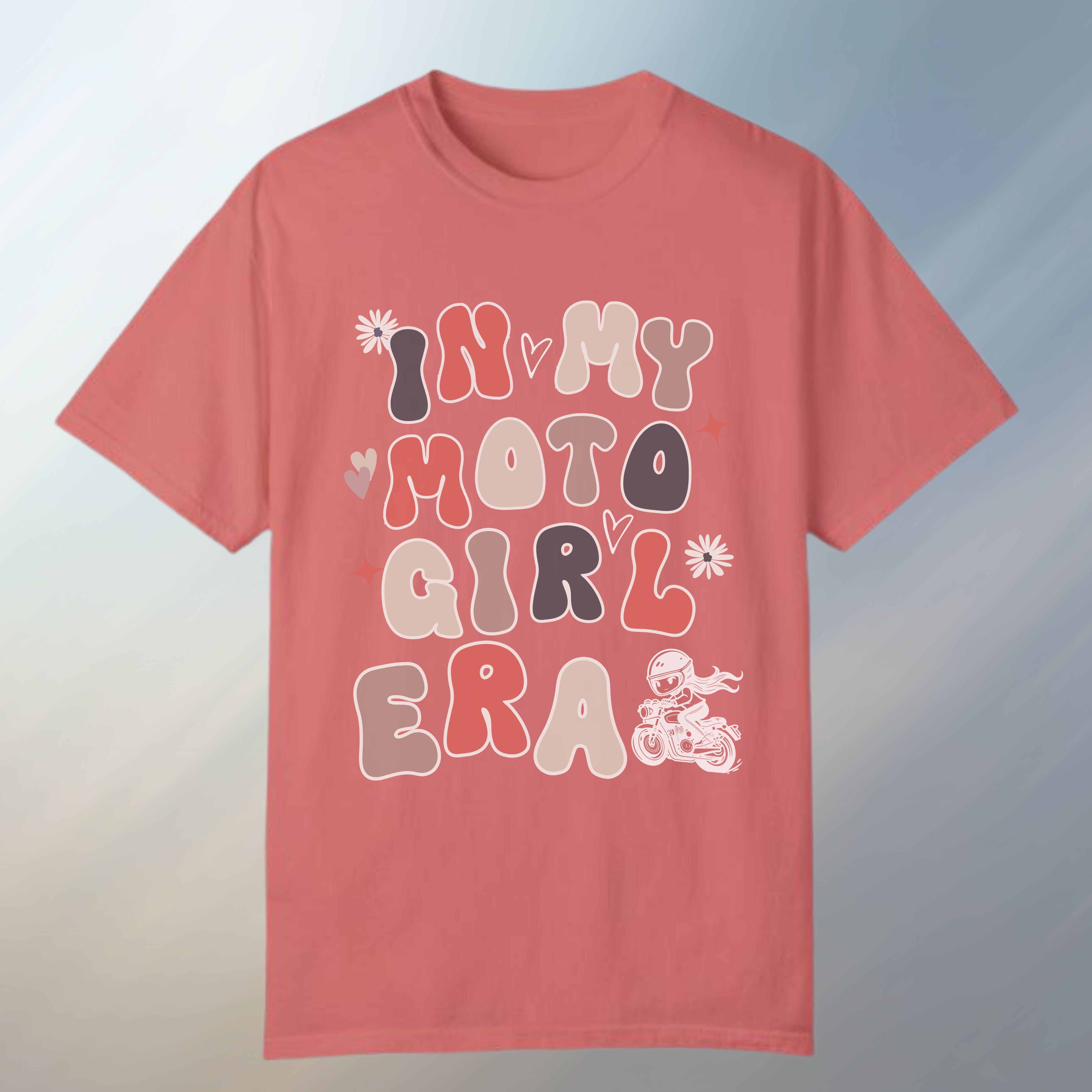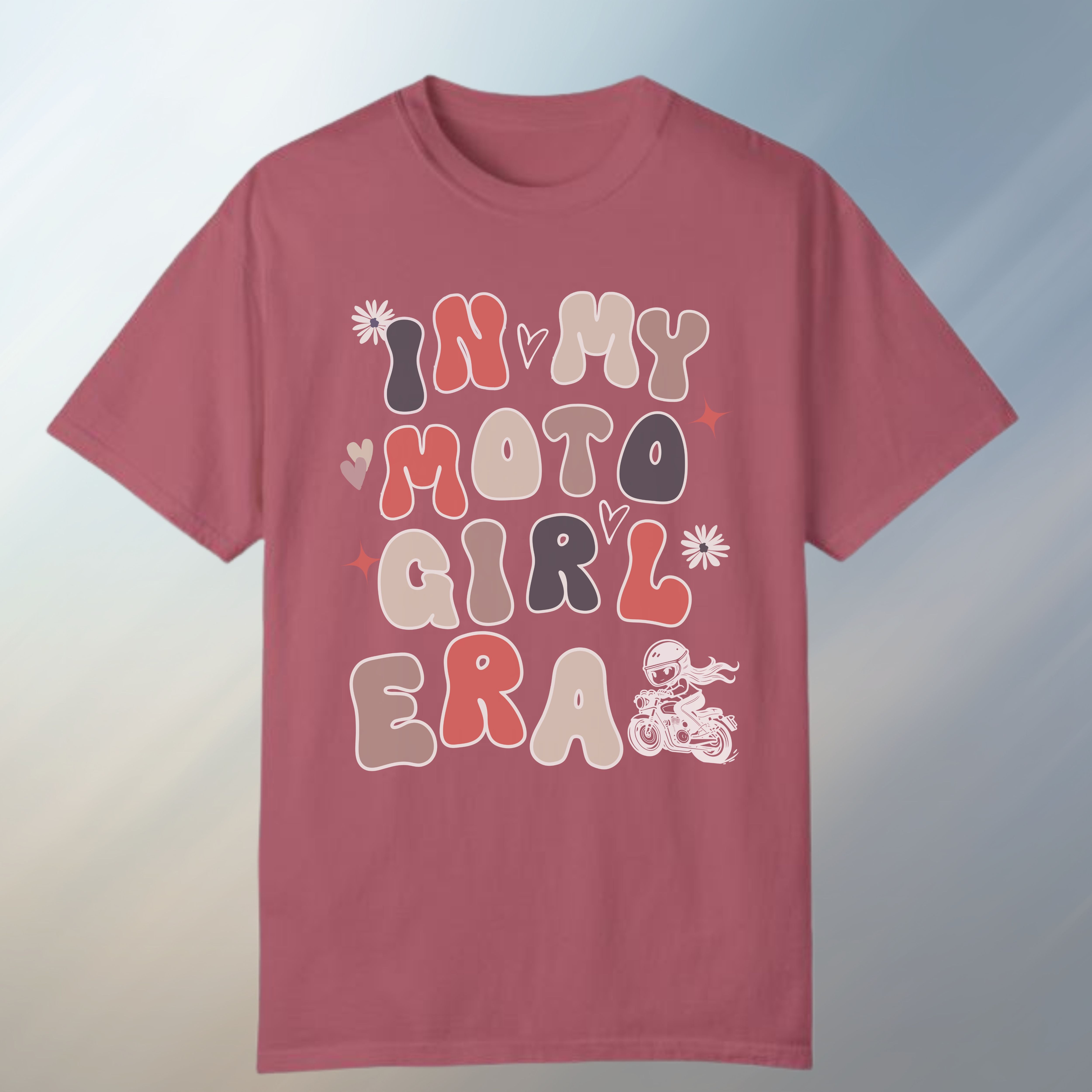 Rev up your style with our Boho styleTShirt that boldly declares "In My Moto Girl Era" in a retro font on the back. It's the perfect riding tee to showcase your love for the open road and your vibrant, adventurous spirit. Embrace the boho-inspired design and hit the road in style.