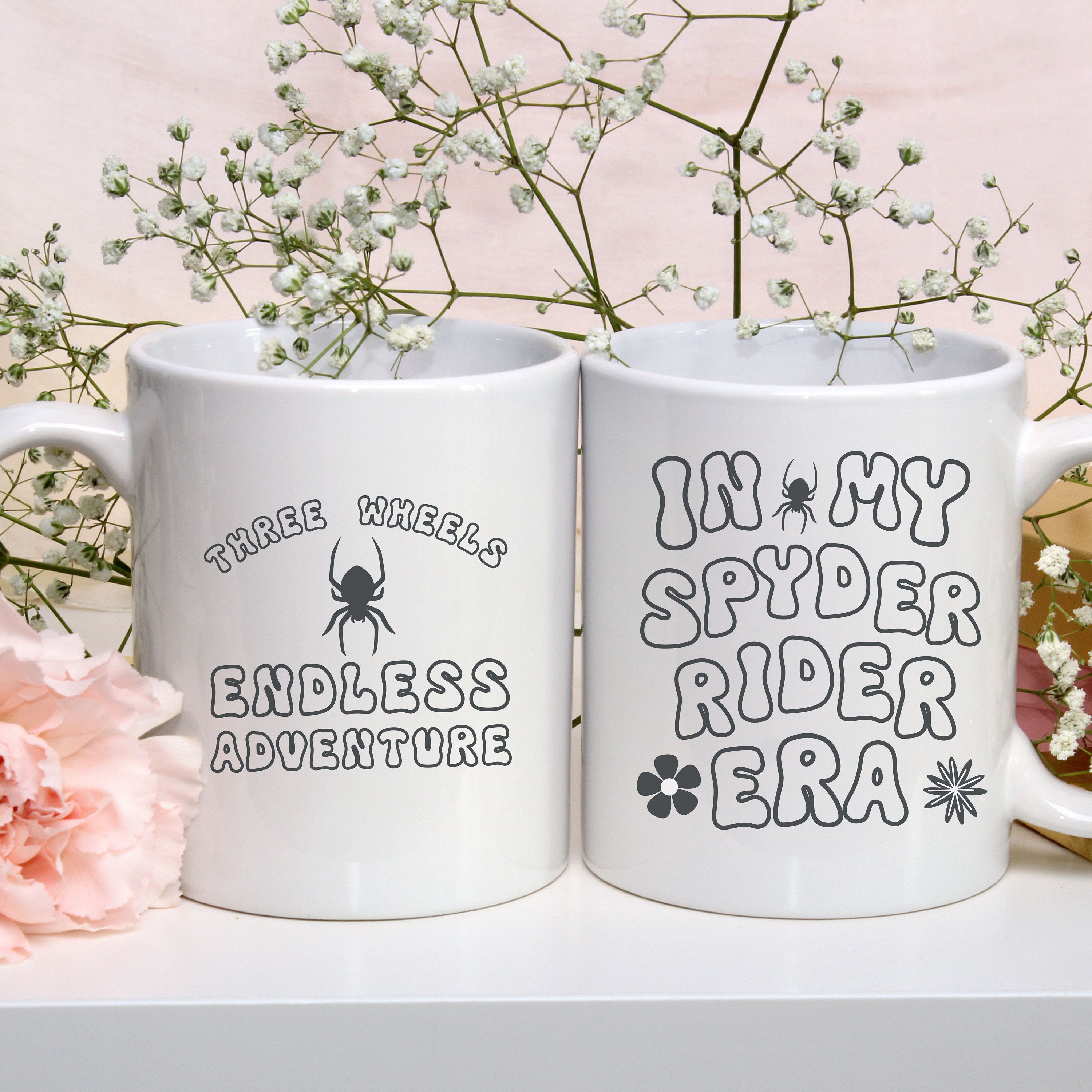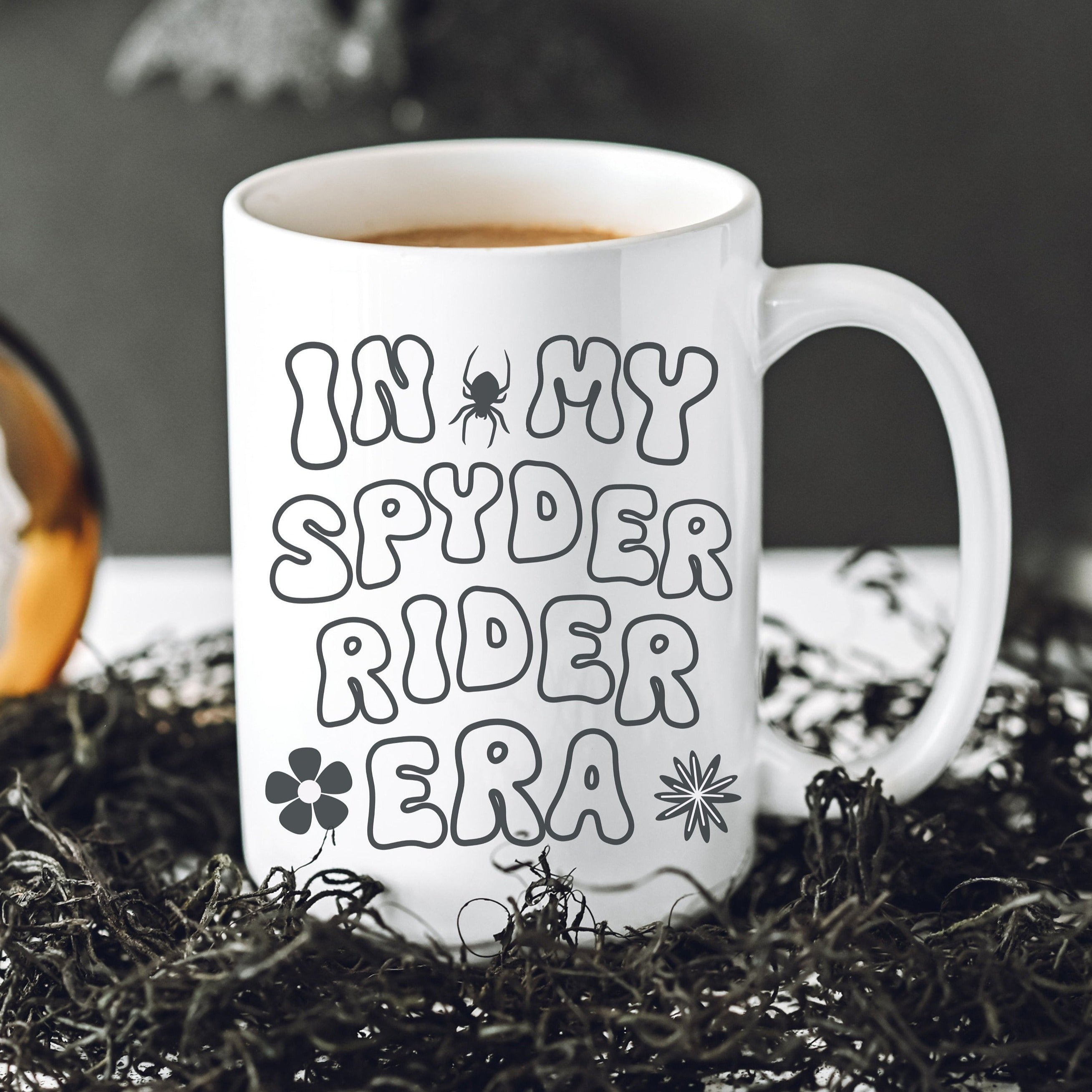 Embrace your free spirit with our Boho Coffee Mug for Biker Women. It boasts the captivating message "In My Spyder Rider Era" in monochrome font, letting you celebrate your adventurous side and love for the open road with every sip.