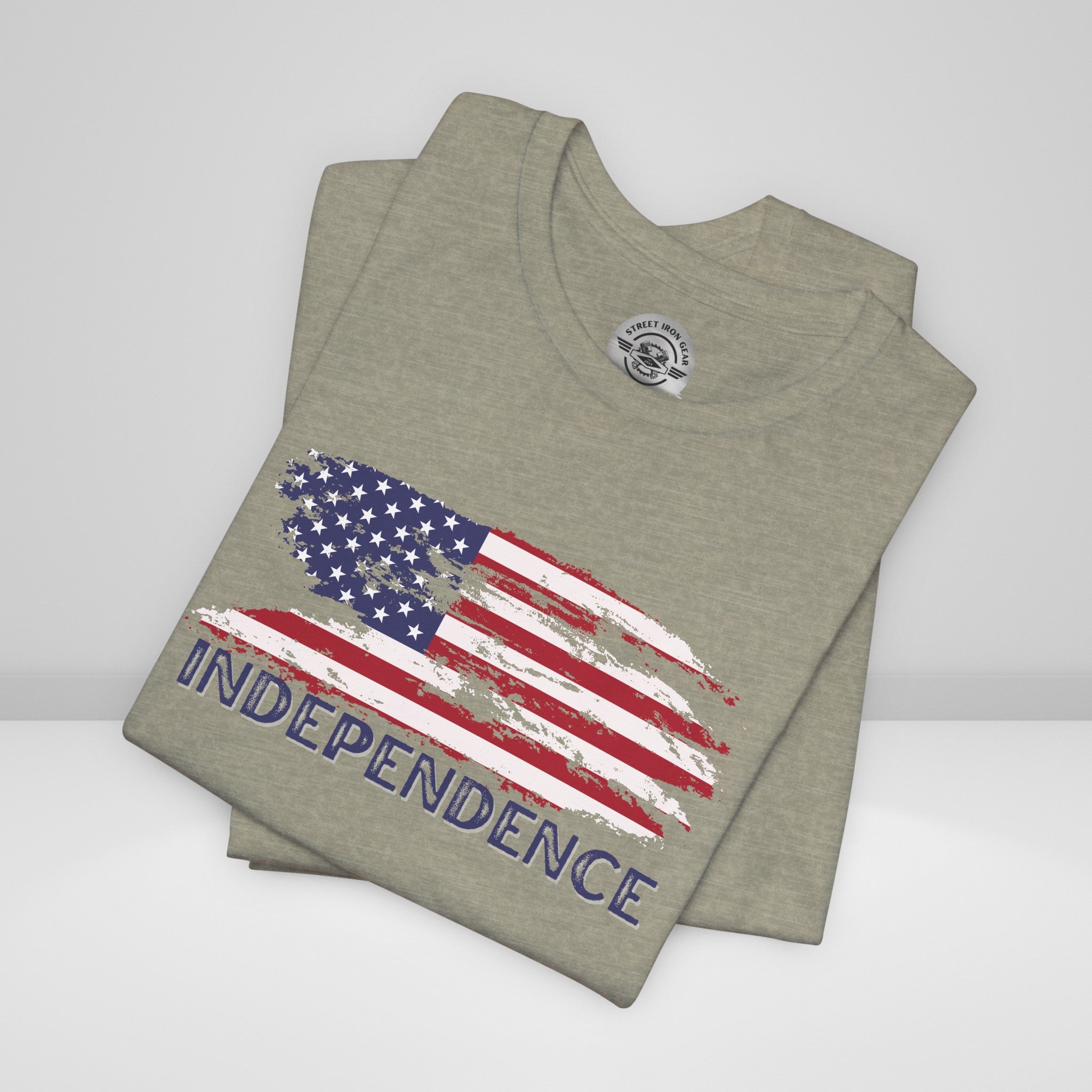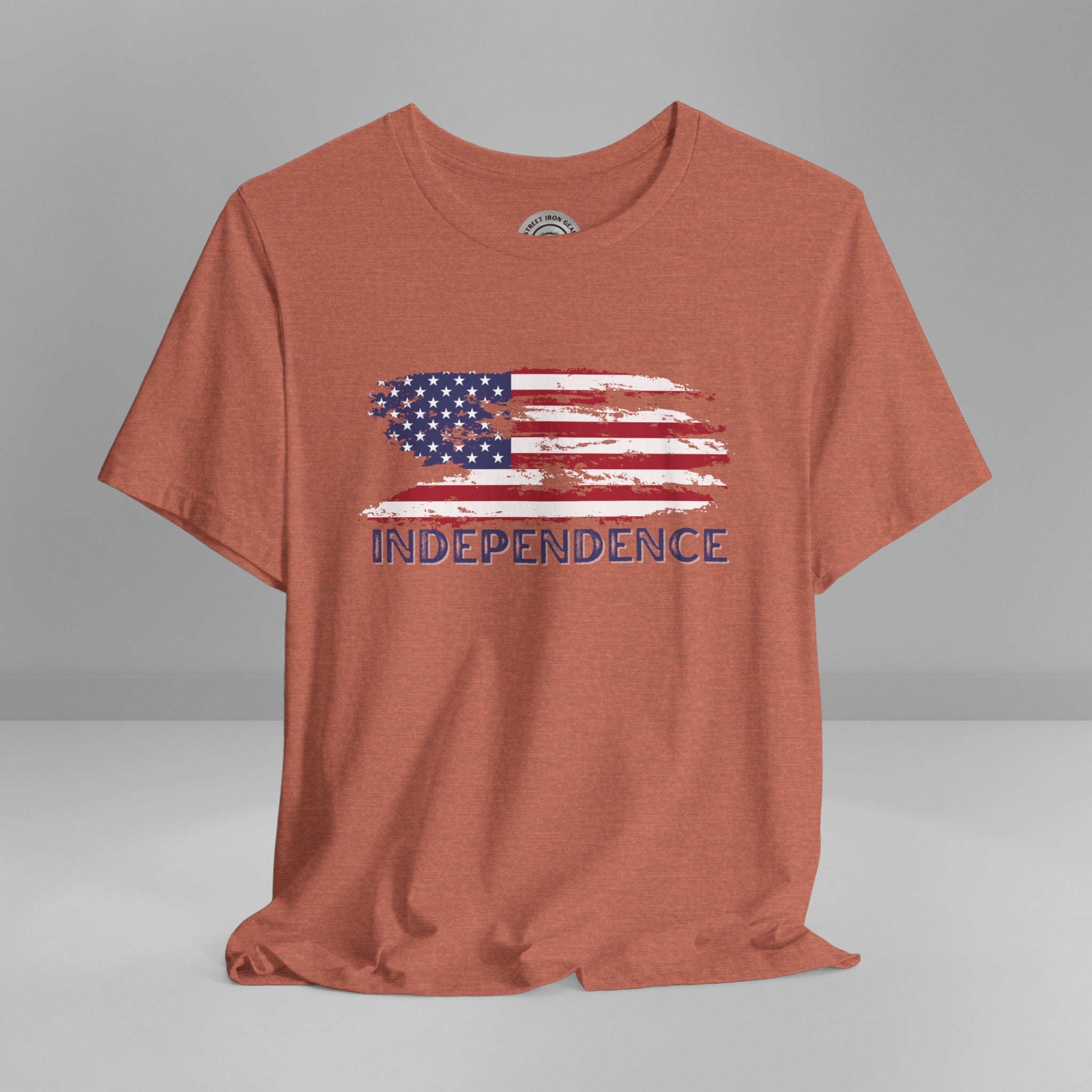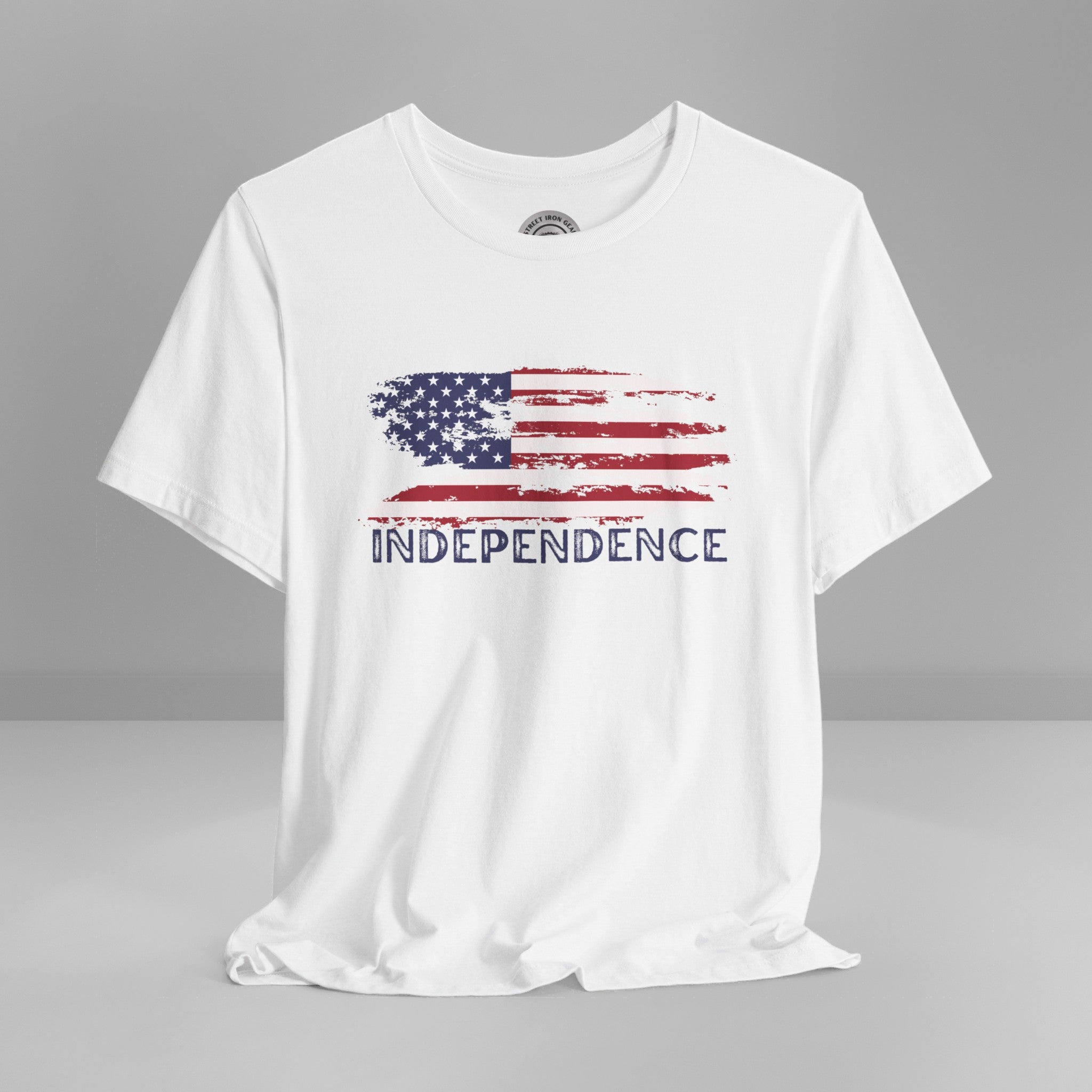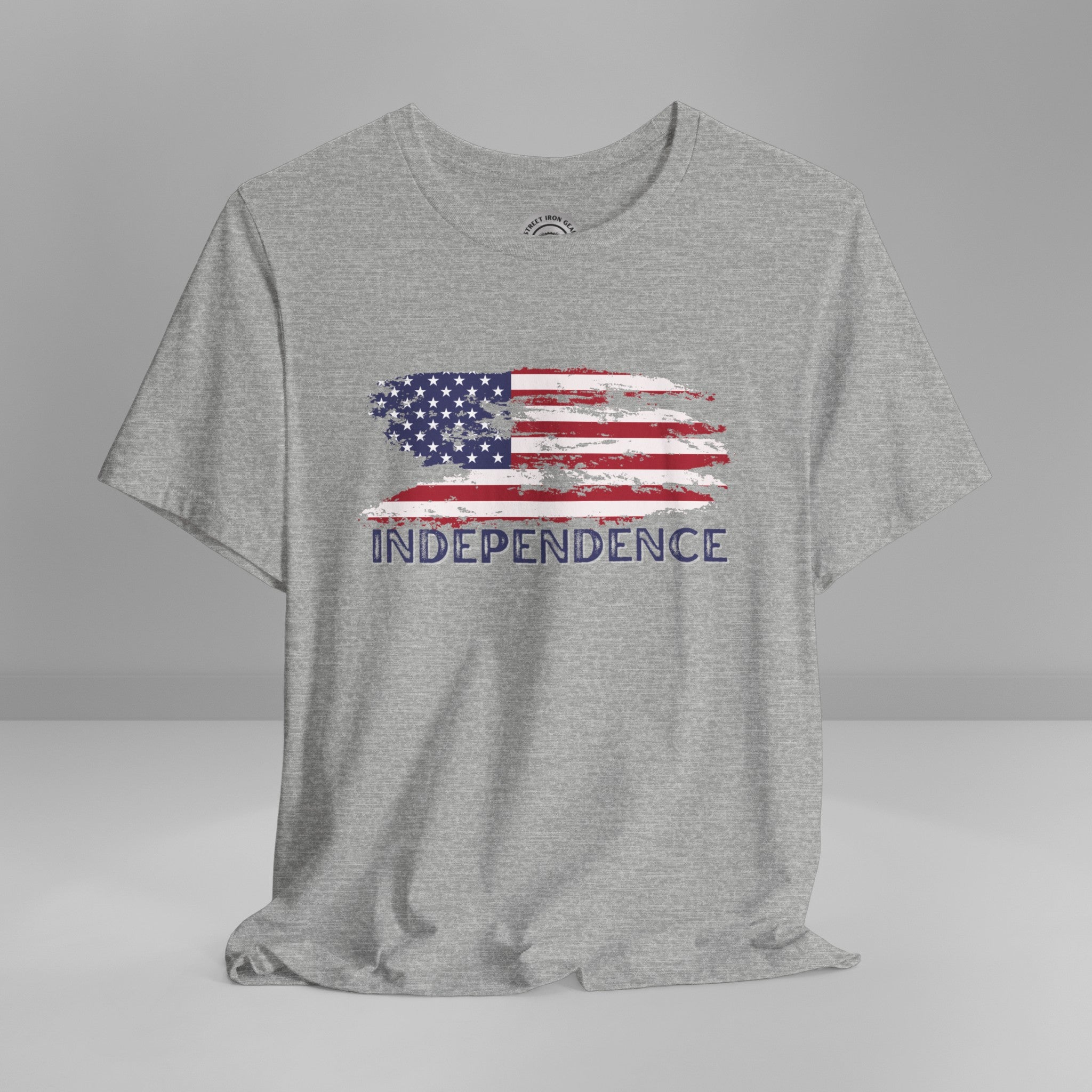 Show your unwavering support with our "American Patriot" T-shirt! This tee proudly features a grunge style American Flag with the bold statement 'Independence' making this T-shirt a stylish choice for a true American patriot.