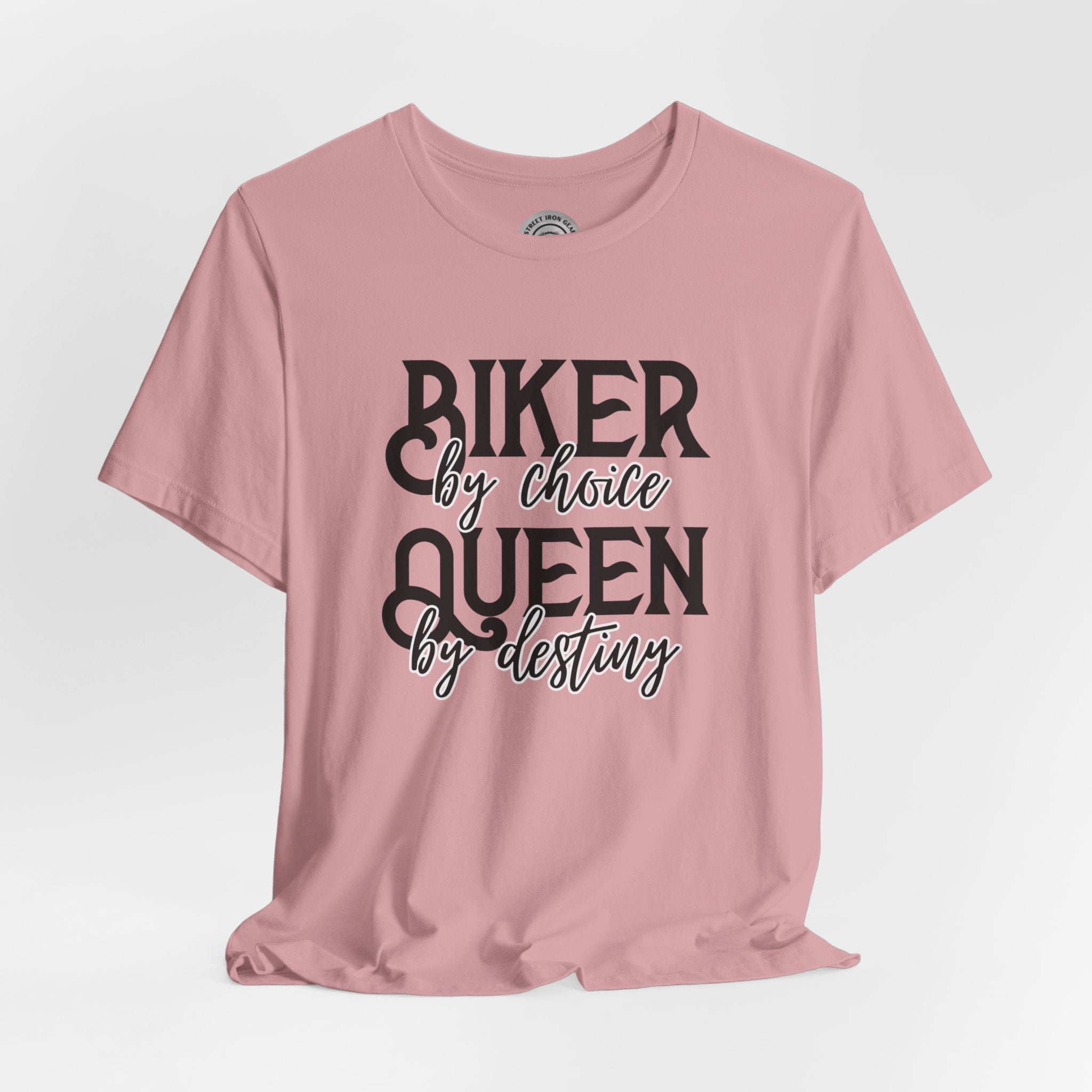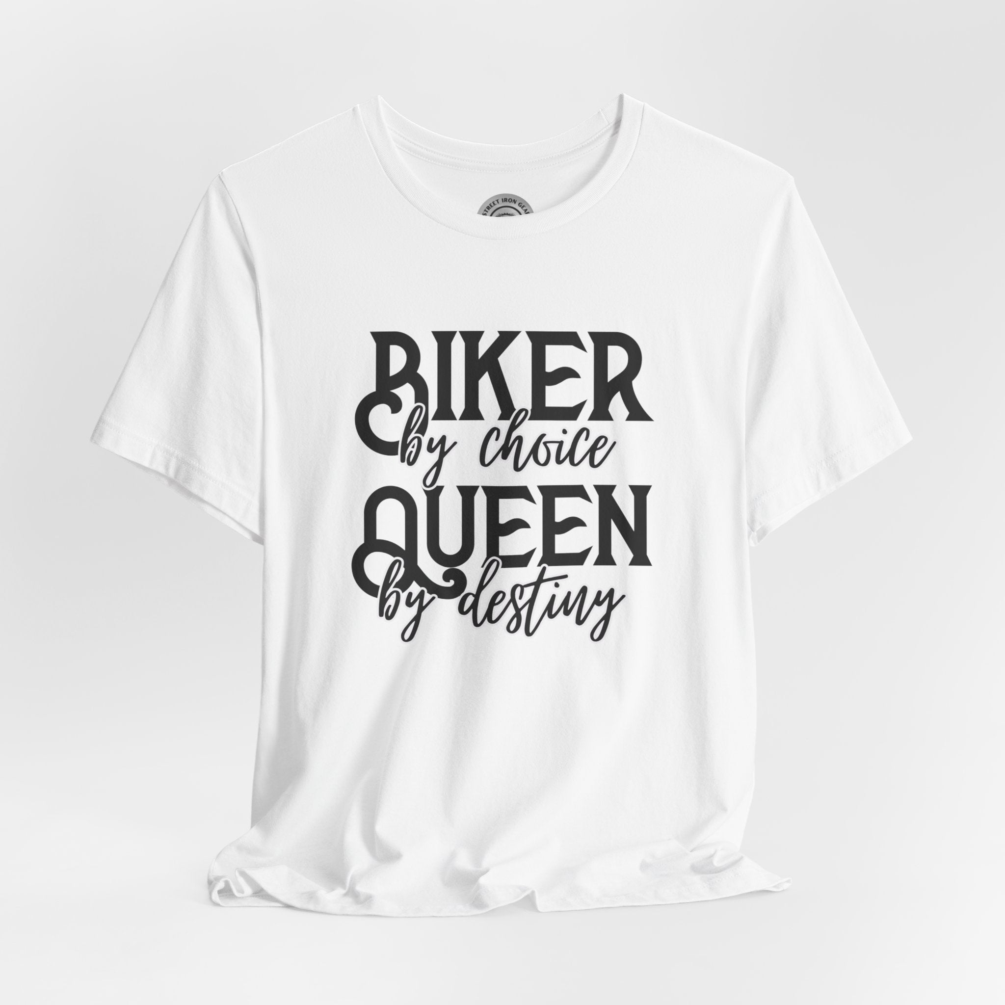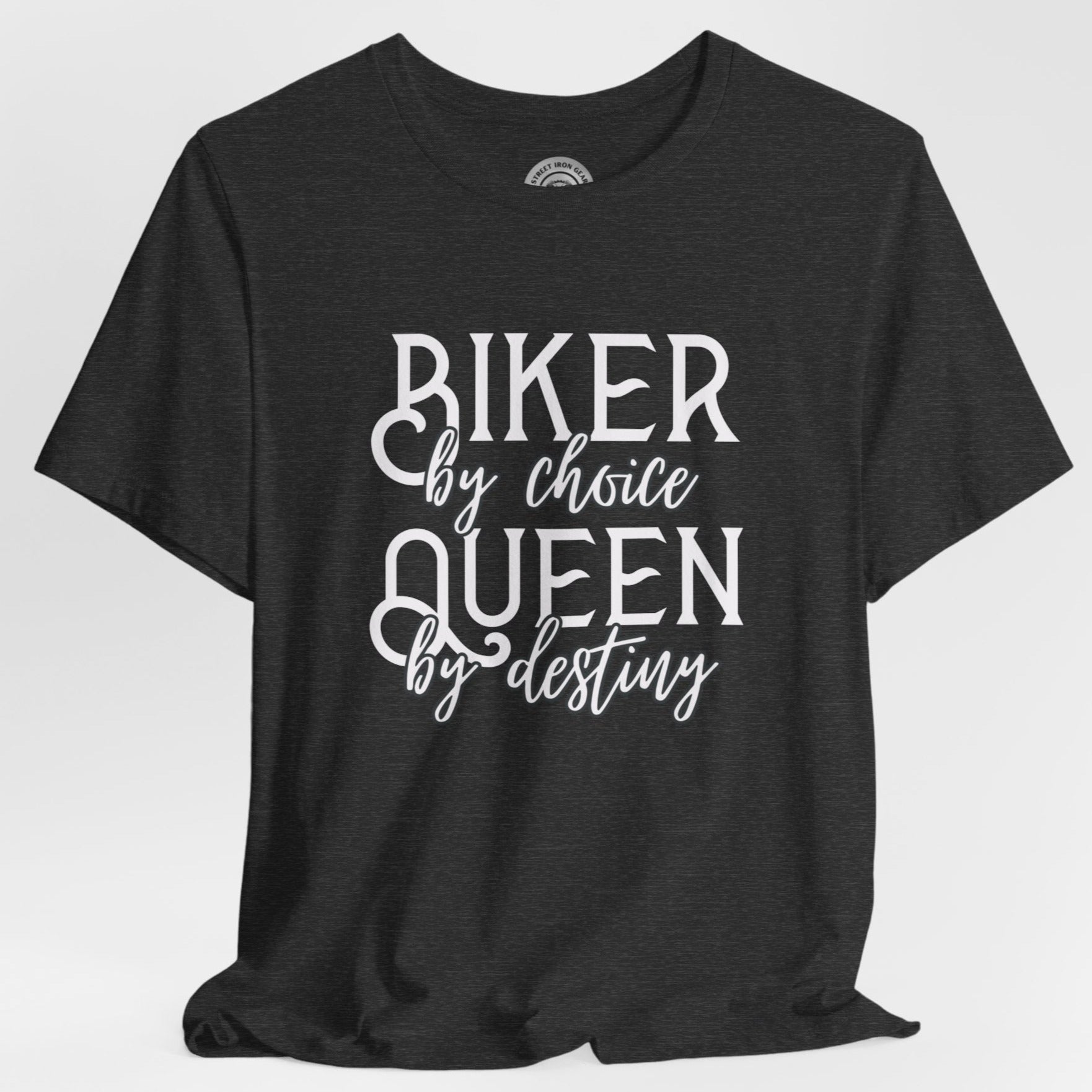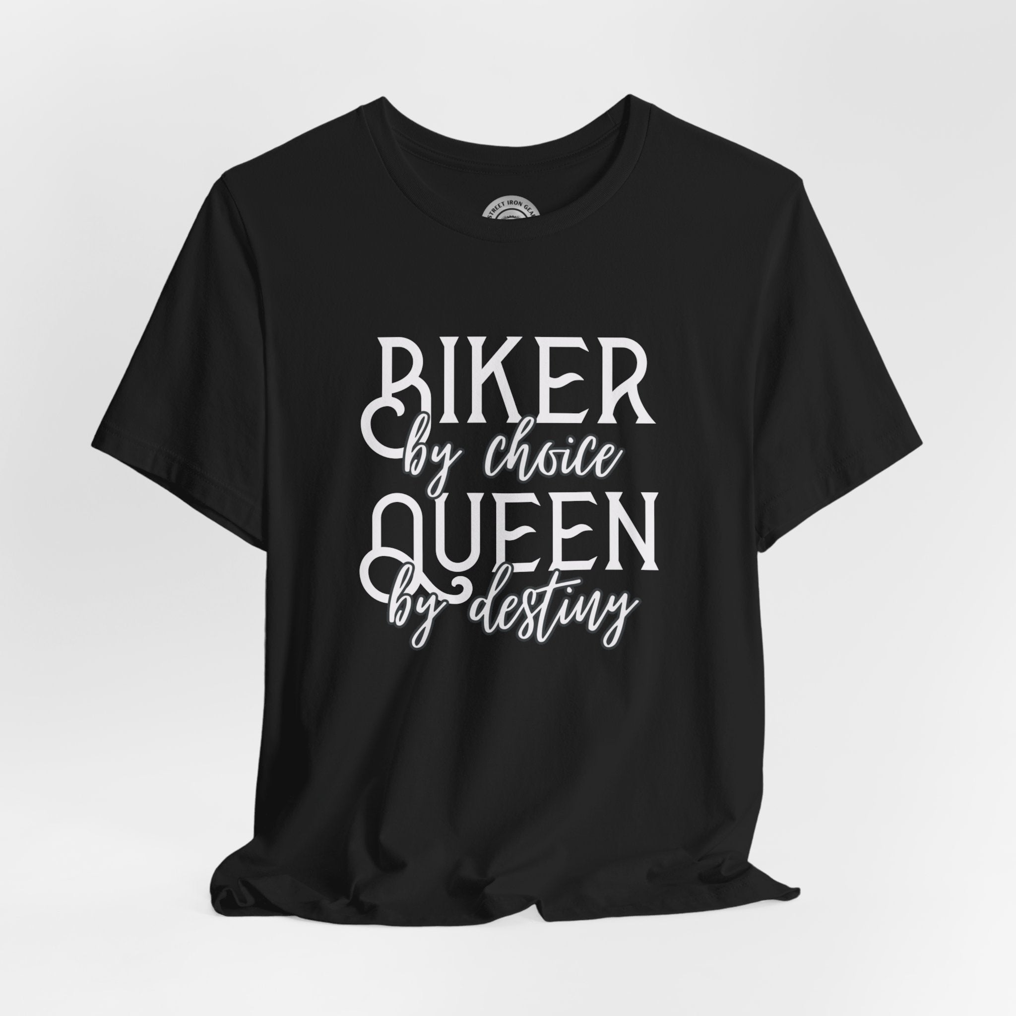 Embrace your inner queen with our 'Biker by Choice, Queen by Destiny'. This shirt combines bold and script fonts for a stylish statement that celebrates your biker spirit and regal confidence.