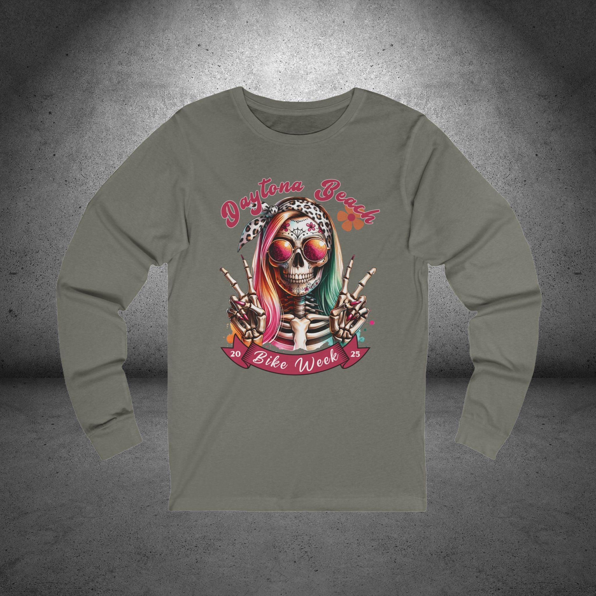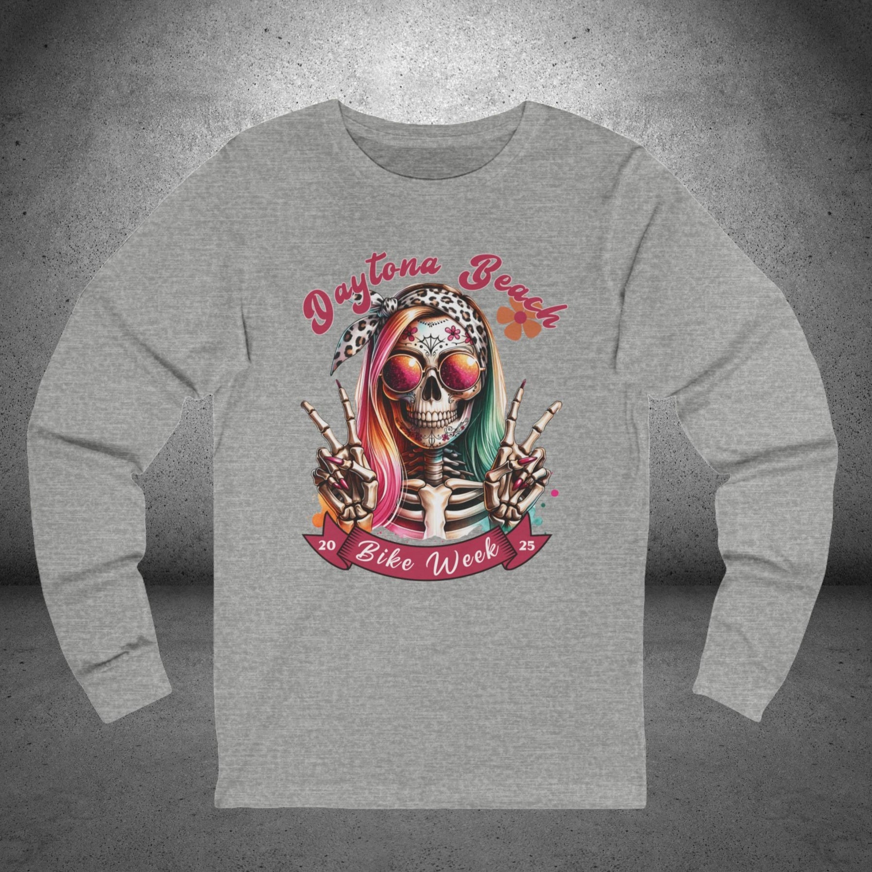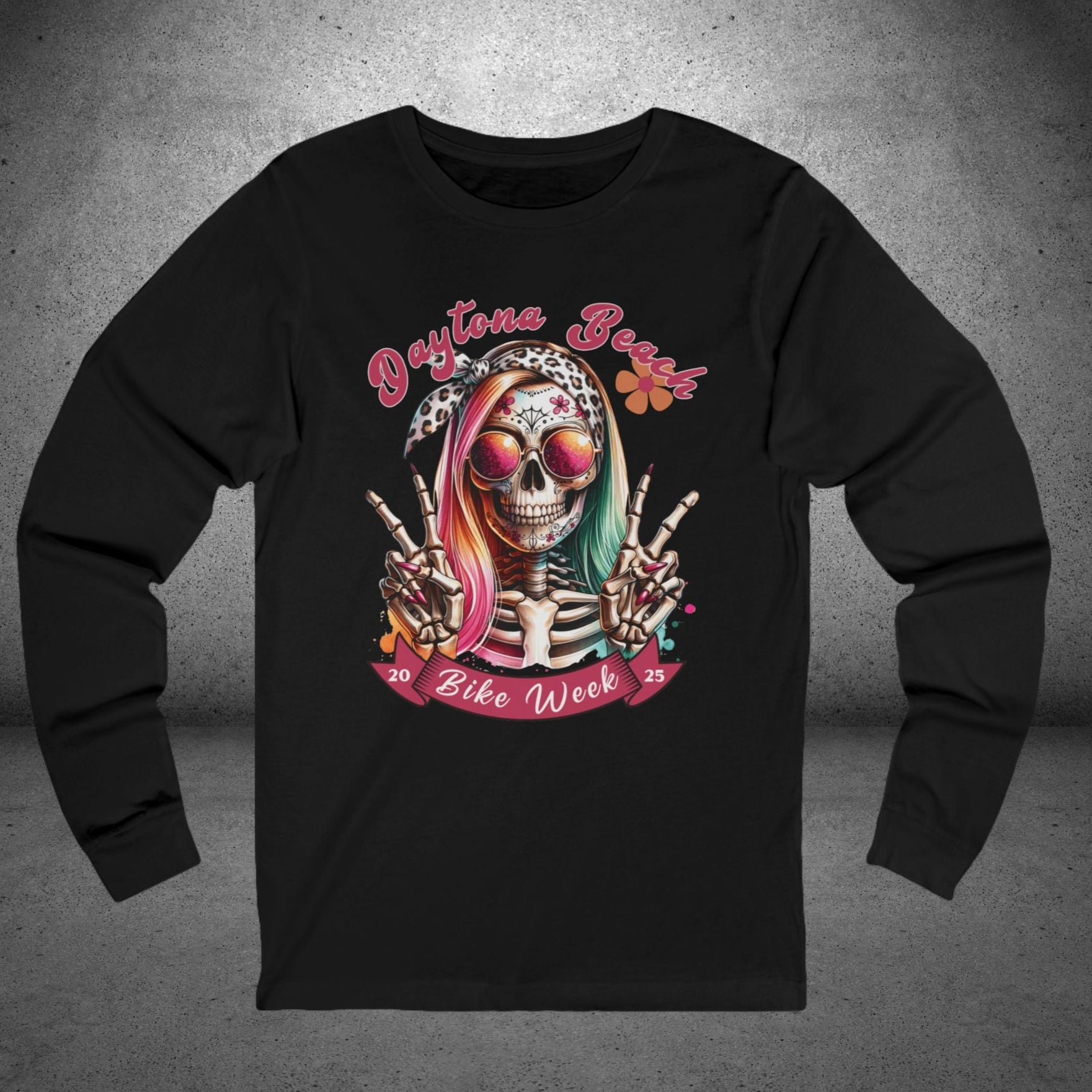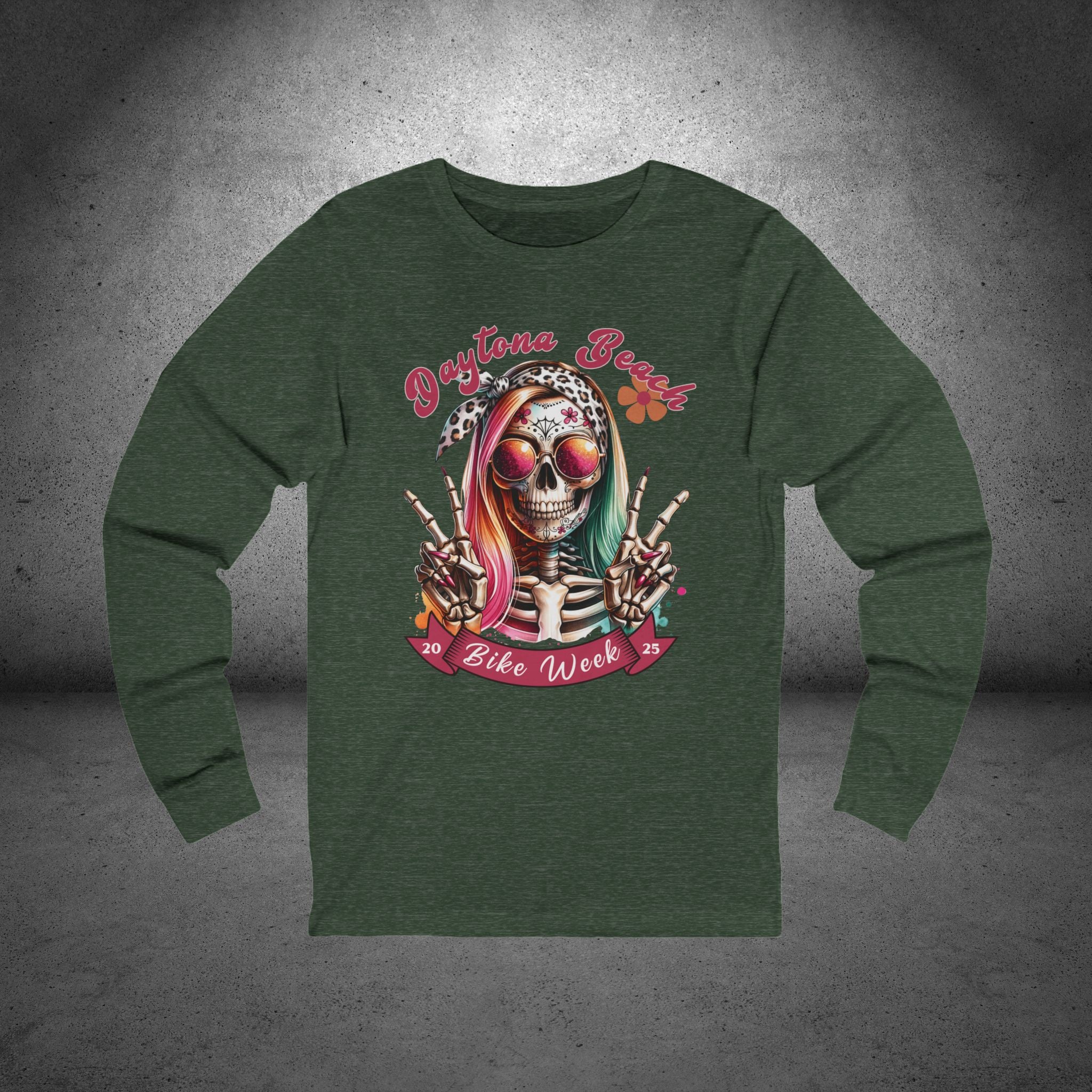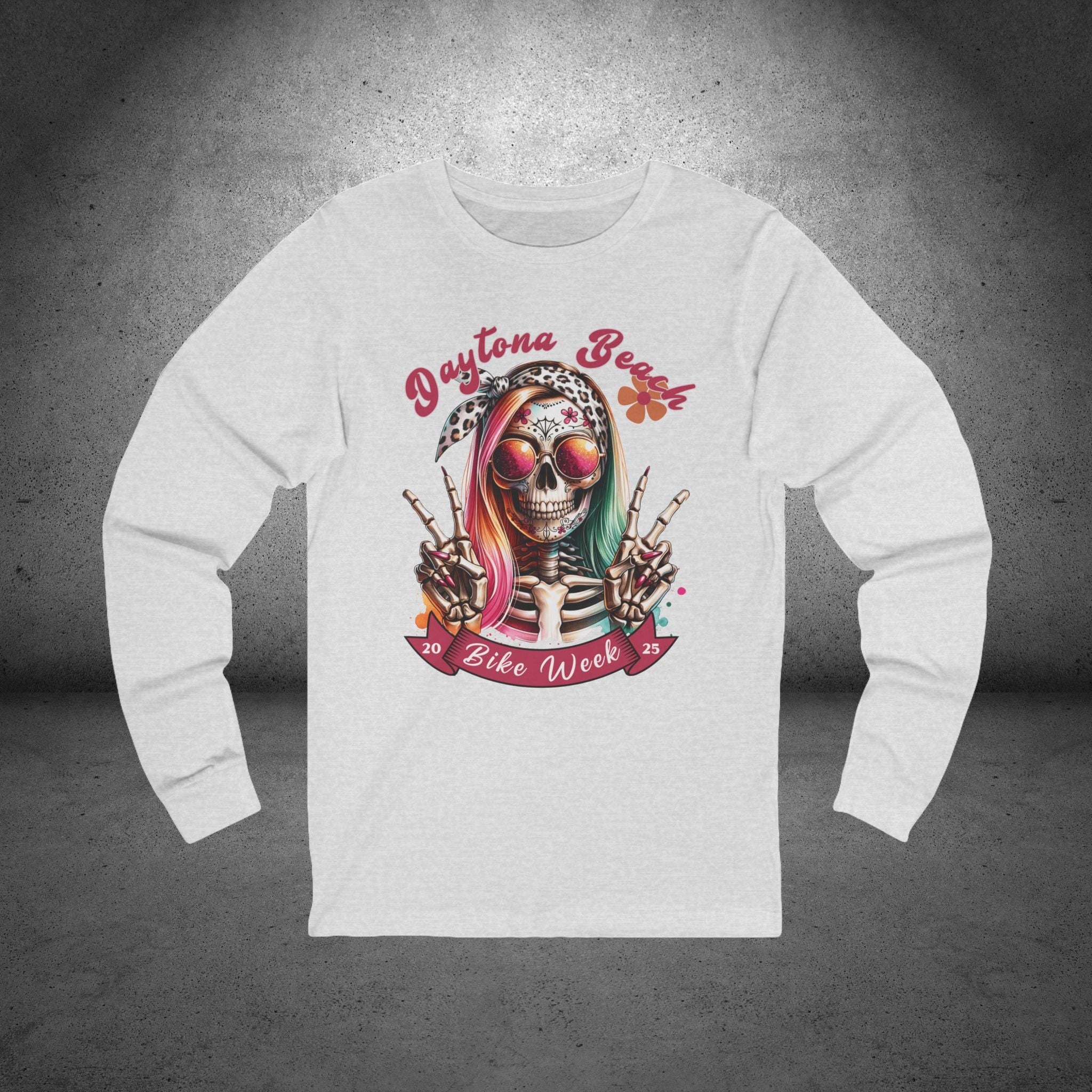 Celebrate Daytona Bike Week 2025 in style with our Ladies T-Shirt featuring a colorful hipster skull with a bow, sunglasses, and two playful peace signs. This vibrant and fun design is perfect for showcasing your love of motorcycles and beach vibes, whether you're at the rally or just want to rep the iconic event. Available in a wide range of colors and sizes up to 2XL, this comfortable and eye-catching tee is a must-have for any biker enthusiast.