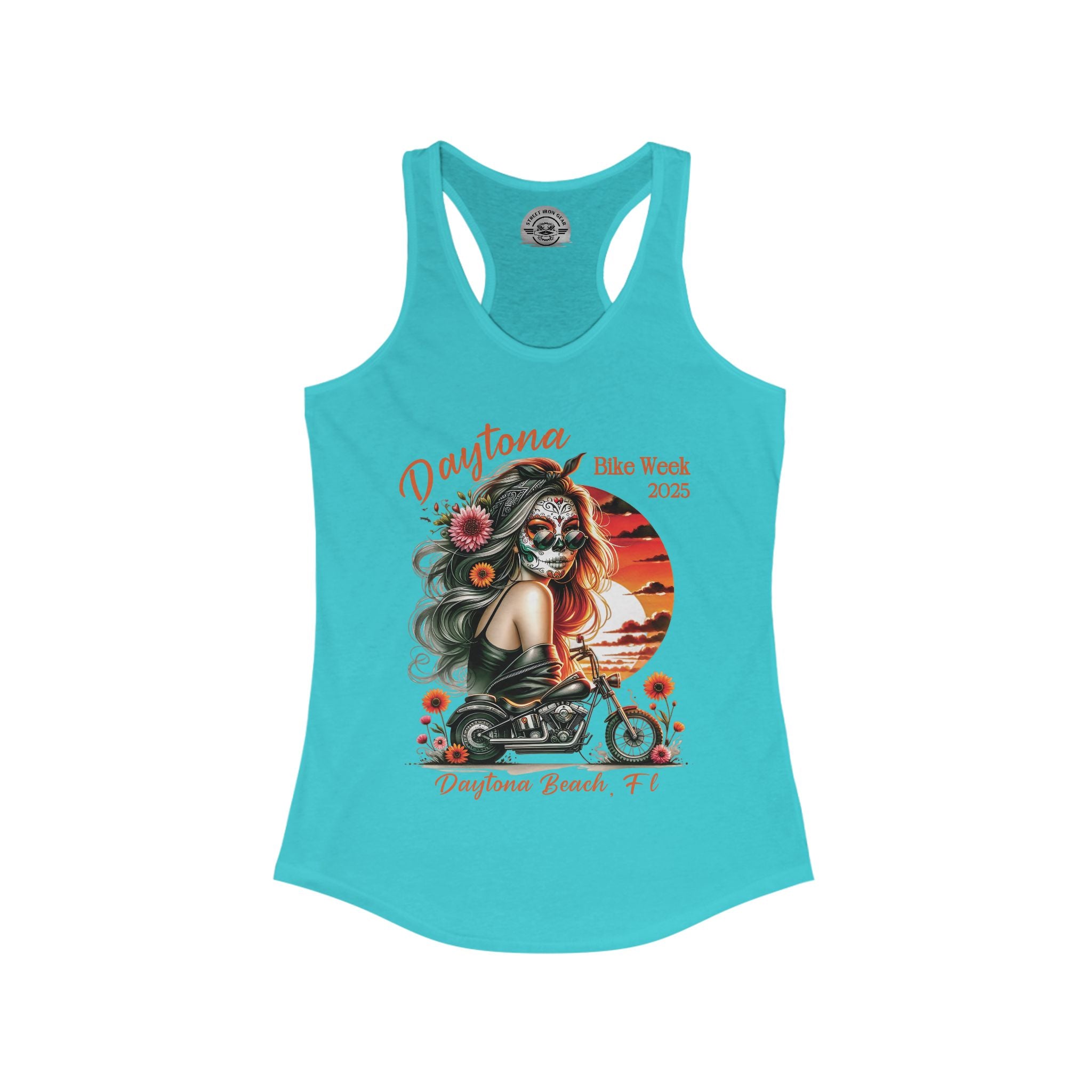 Celebrate the spirit of Daytona Bike Week with our 2025 Daytona Beach racerback tank top, featuring a vibrant Day of the Dead woman alongside a sleek black motorcycle against a stunning sunset backdrop. The design proudly reads "Daytona Bike Week 2025, Daytona Beach, FL," making it a must-have keepsake for the ultimate motorcycle enthusiast. Available in a variety of colors and sizes up to 2XL, this high-quality, comfortable shirt is perfect for commemorating one of the biggest biker events of the year..