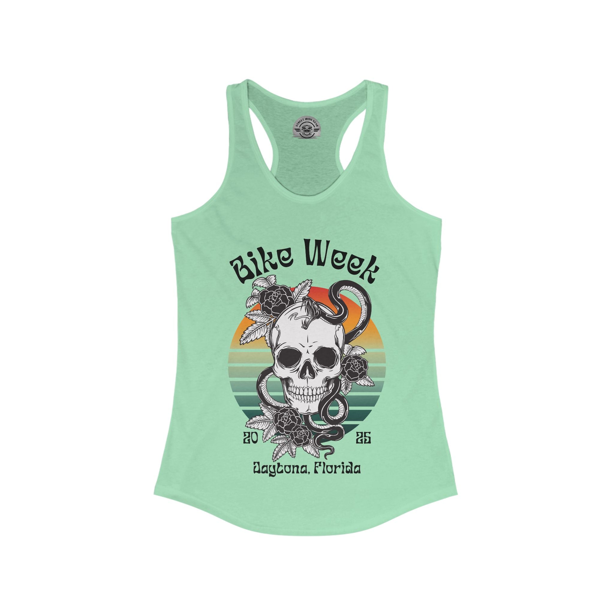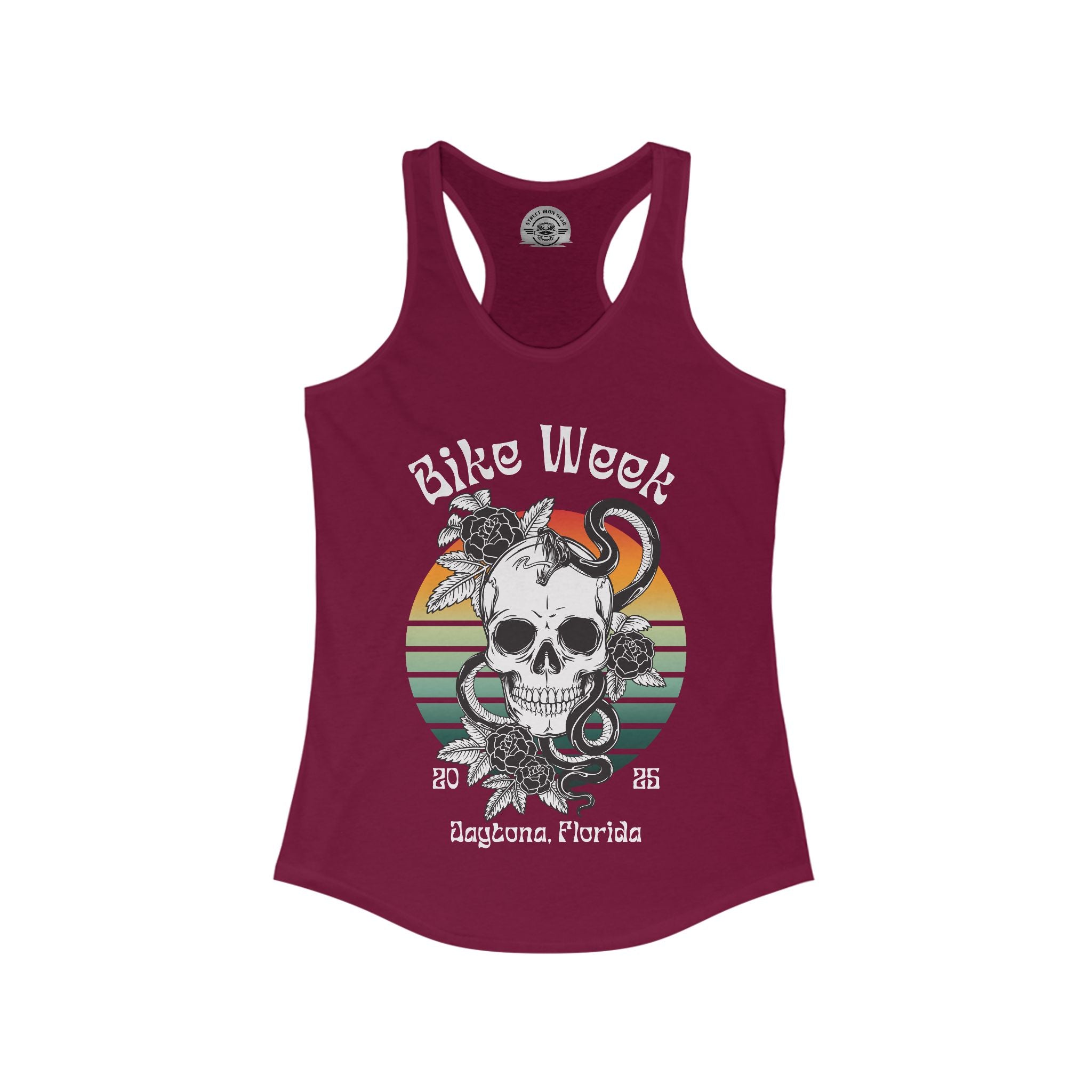 Ride in style with our Ladies Daytona Beach Bike Week 2025 racerback tank top, featuring a vibrant boho sunset background and a striking skull, snake, and roses graphic. The bold design proudly reads "Bike Week 2025, Daytona Beach, FL," making it the perfect keepsake or gift for motorcycle enthusiasts. Available in a variety of colors and sizes up to 2XL, this shirt combines comfort and edgy style for every rider.