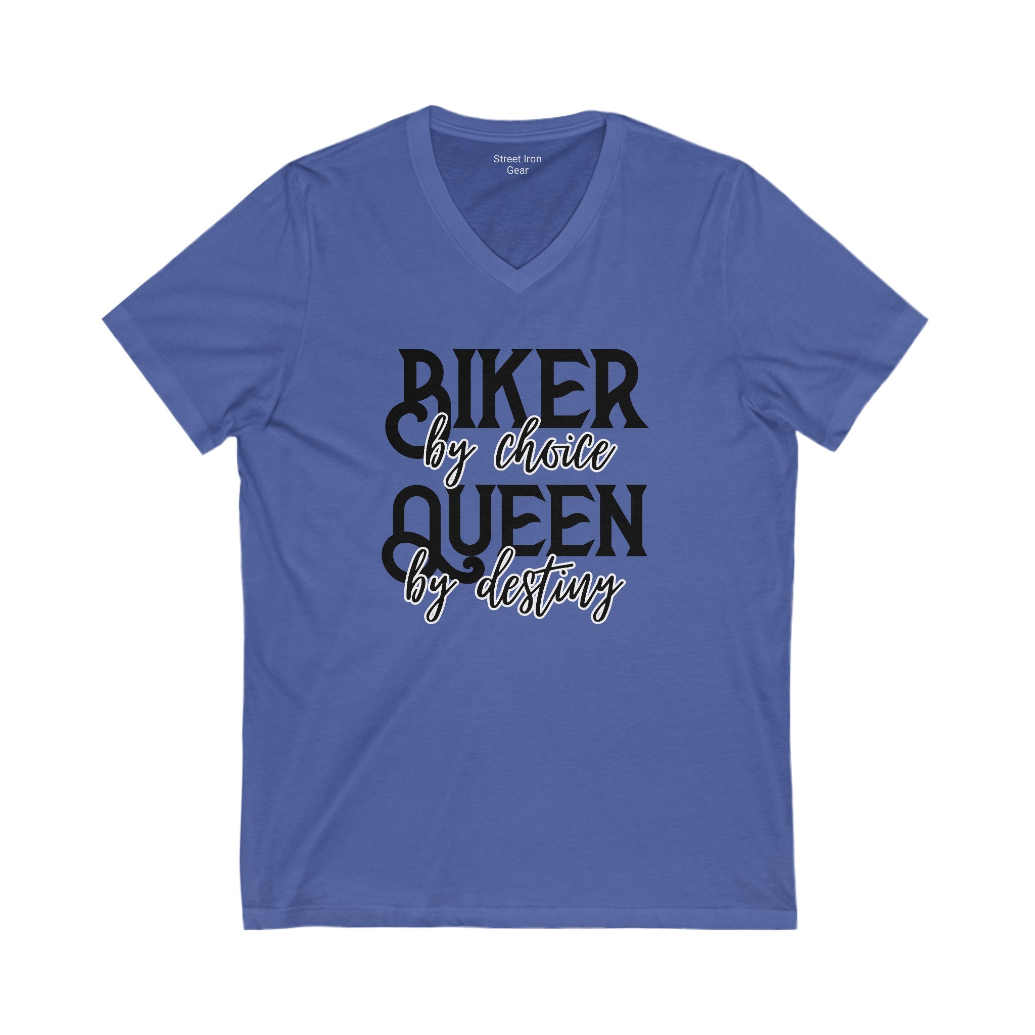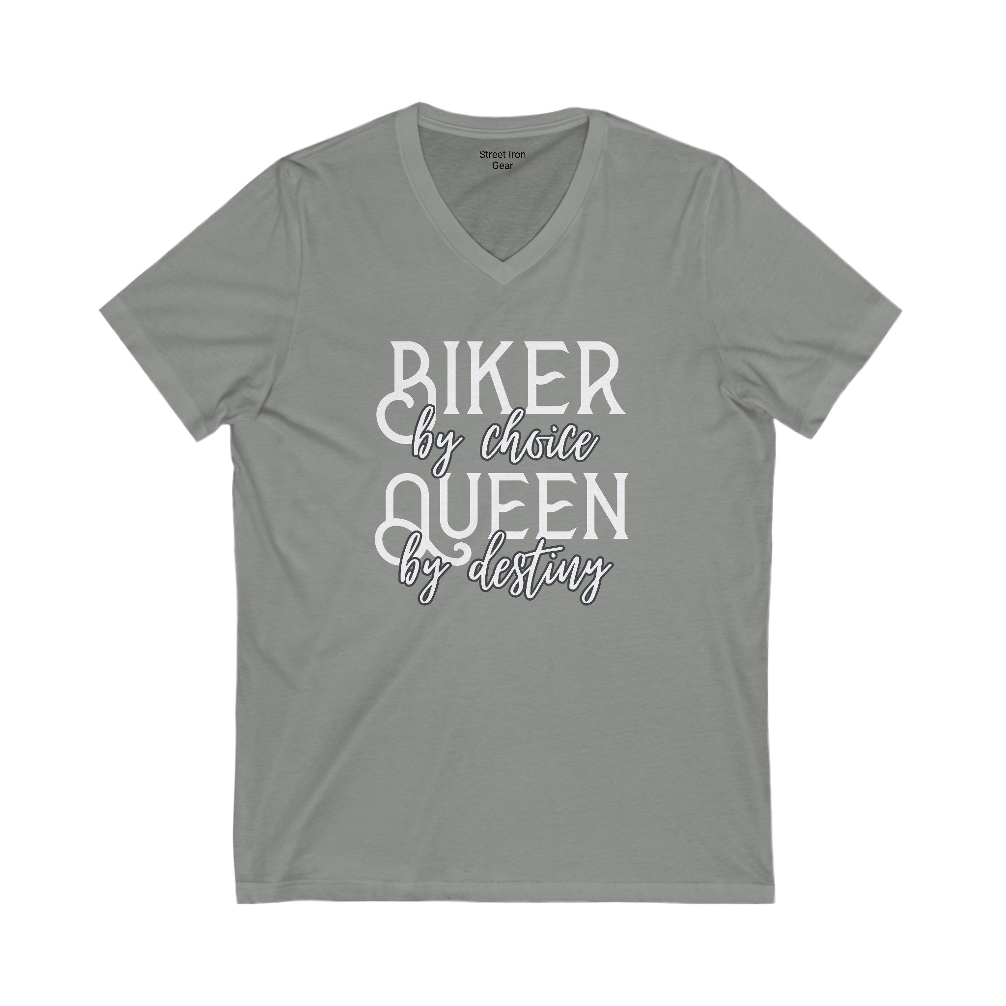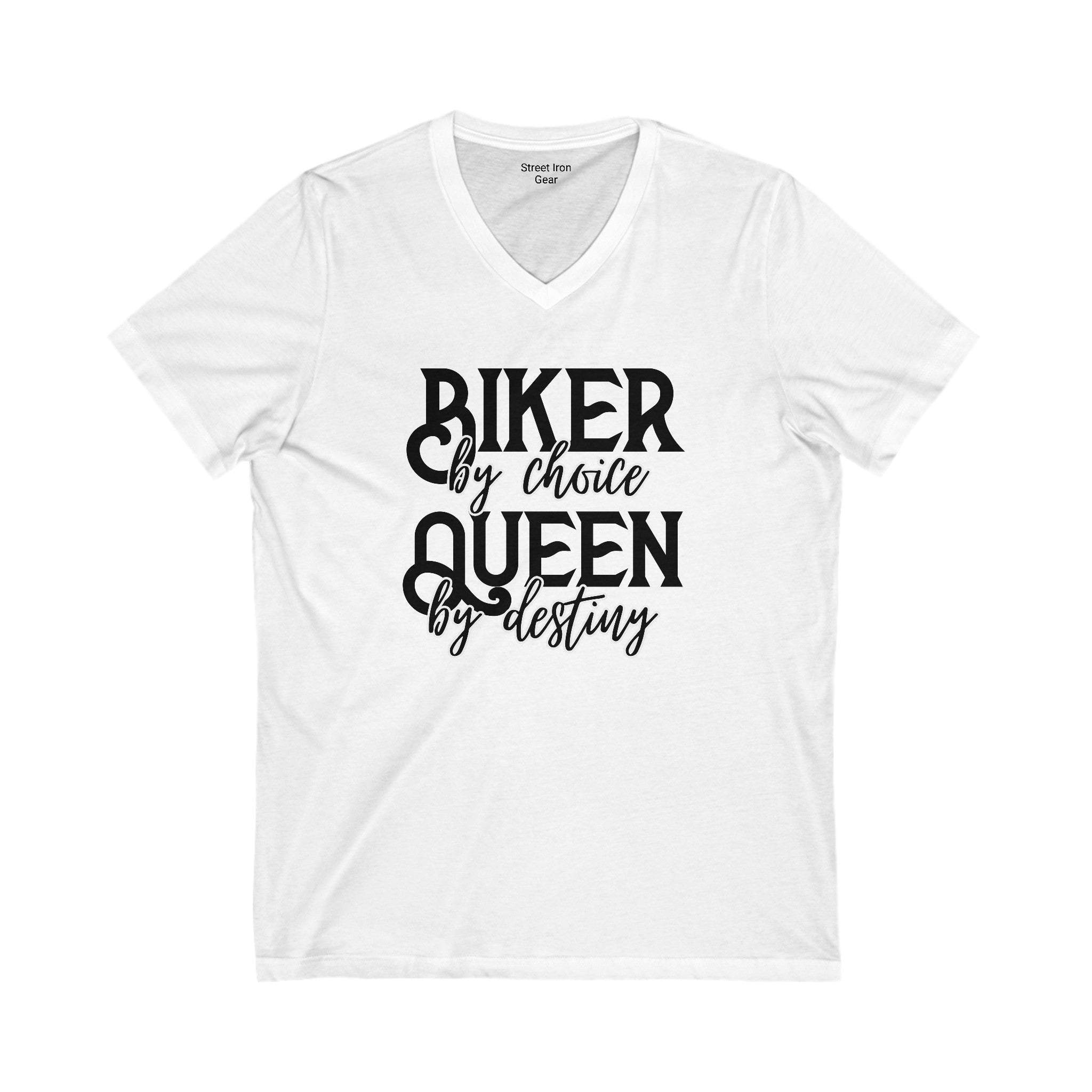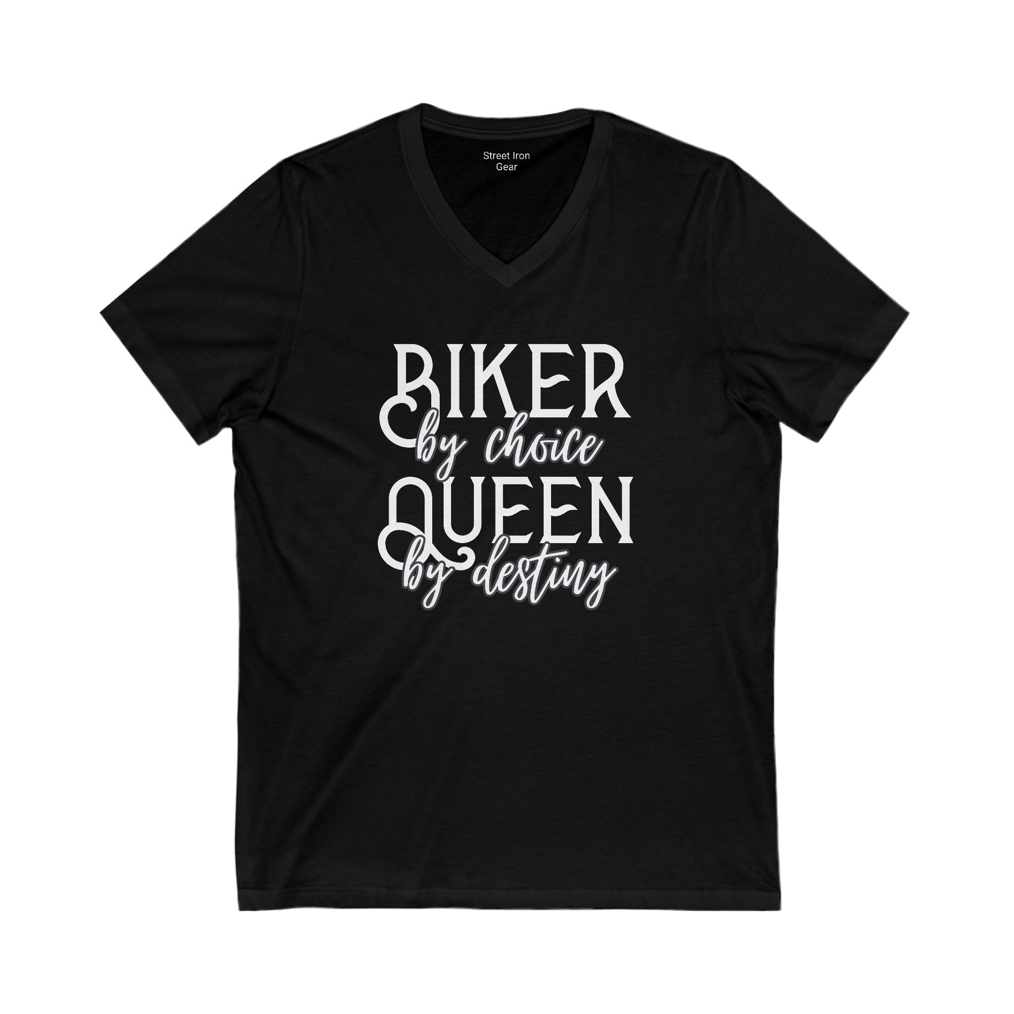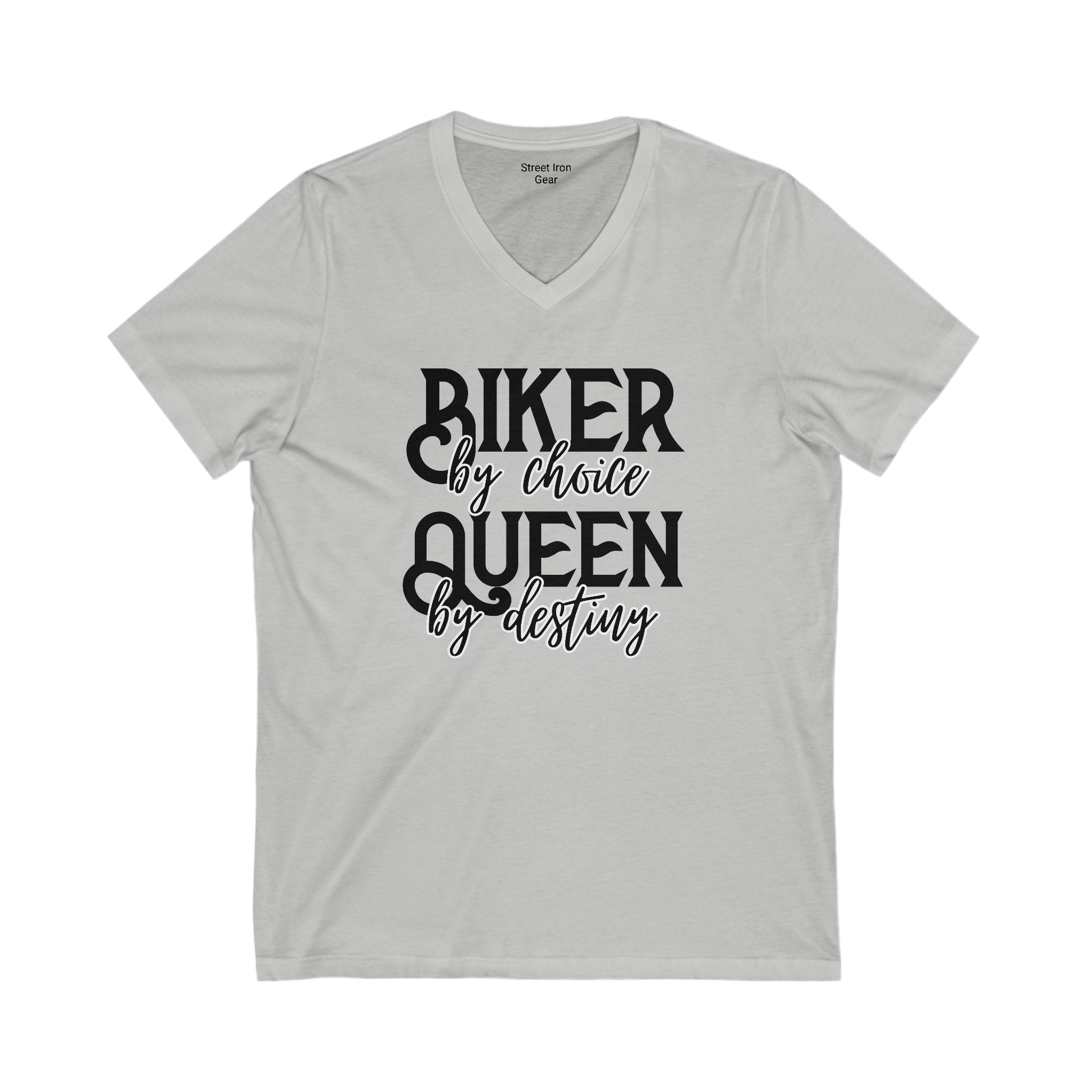 Embrace your inner queen with our 'Biker by Choice, Queen by Destiny' V-neck tee. This shirt combines bold and script fonts for a stylish statement that celebrates your biker spirit and regal confidence.