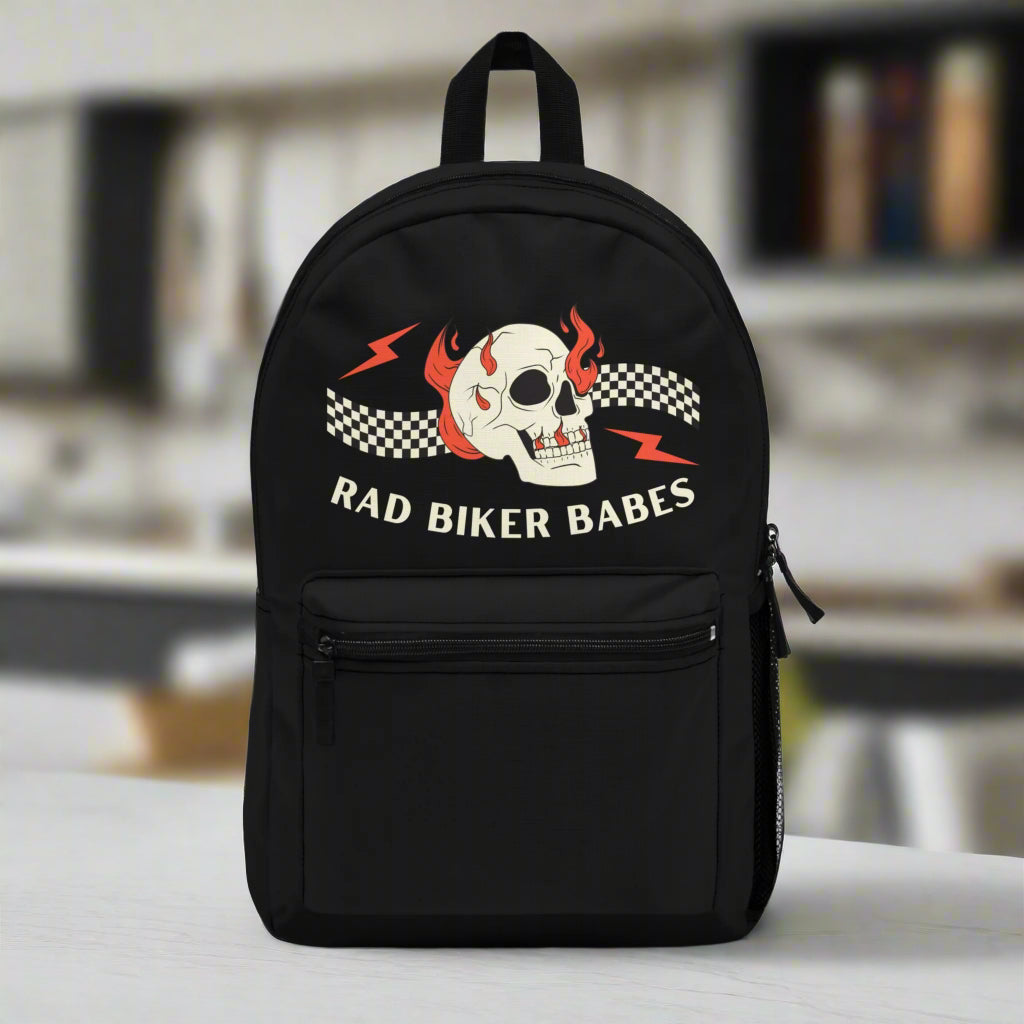 Ride in style with our ladies' motorcycle backpack, featuring a bold vintage skull with flames and racing elements along with the phrase "Rad Biker Babes." Designed on a sleek black backpack, this functional yet fashionable piece is perfect for carrying your laptop, gear, or essentials on any motorcycle adventure. With a durable build and spacious compartments, it's the ultimate accessory for biker women who want to combine practicality with attitude.