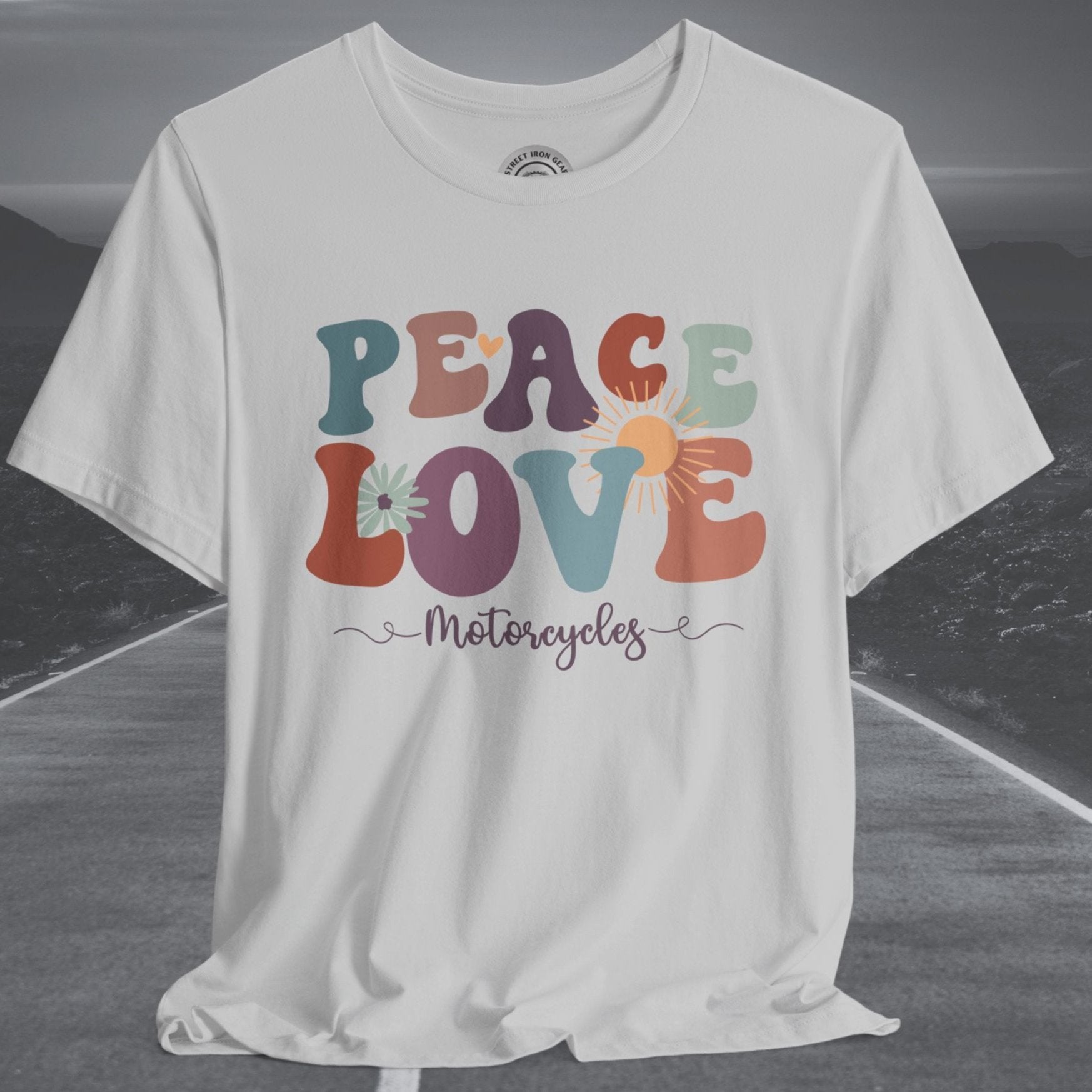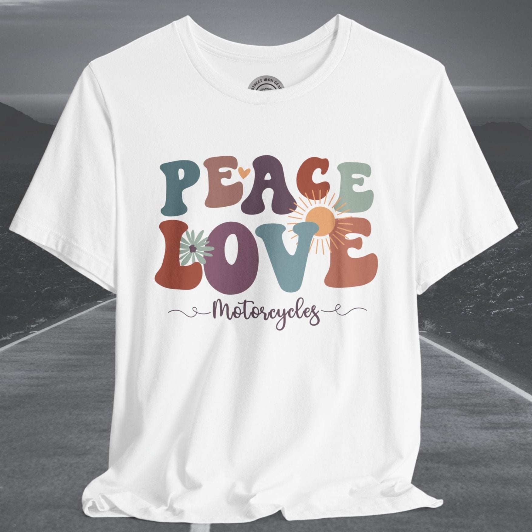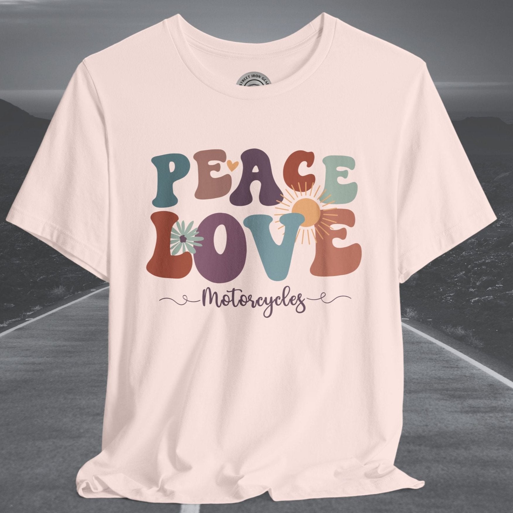 Embrace your love for the open road with our Ladies Motorcycle Crew Neck T-Shirt, featuring a retro boho style design that reads "Peace. Love. Motorcycles" in beautiful script. Adorned with boho-style flowers and sun elements in a classic boho color scheme, this shirt is the perfect blend of vintage flair and motorcycle passion. Soft, comfortable, and stylish, it's ideal for casual rides, rallies, or everyday wear for the free-spirited biker.