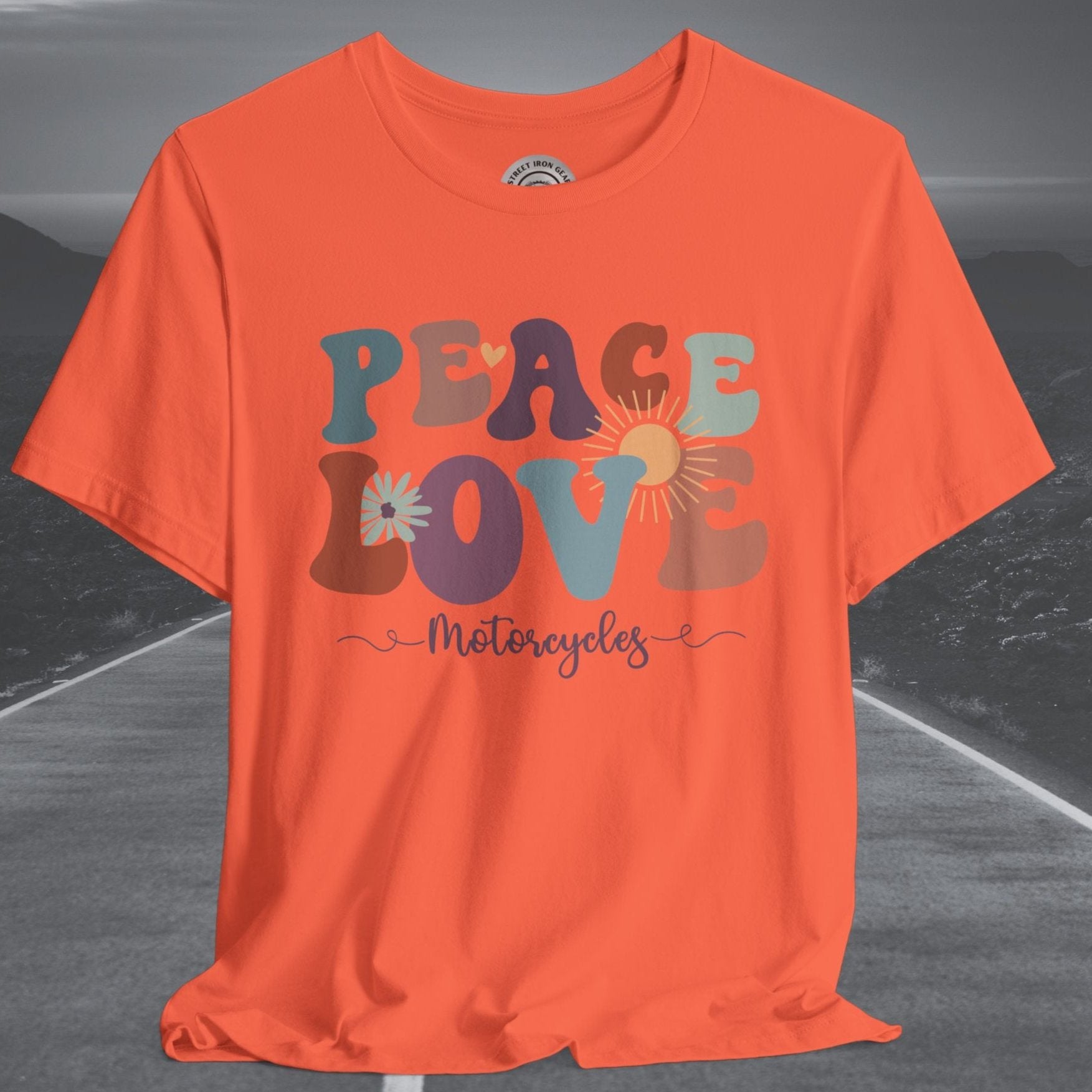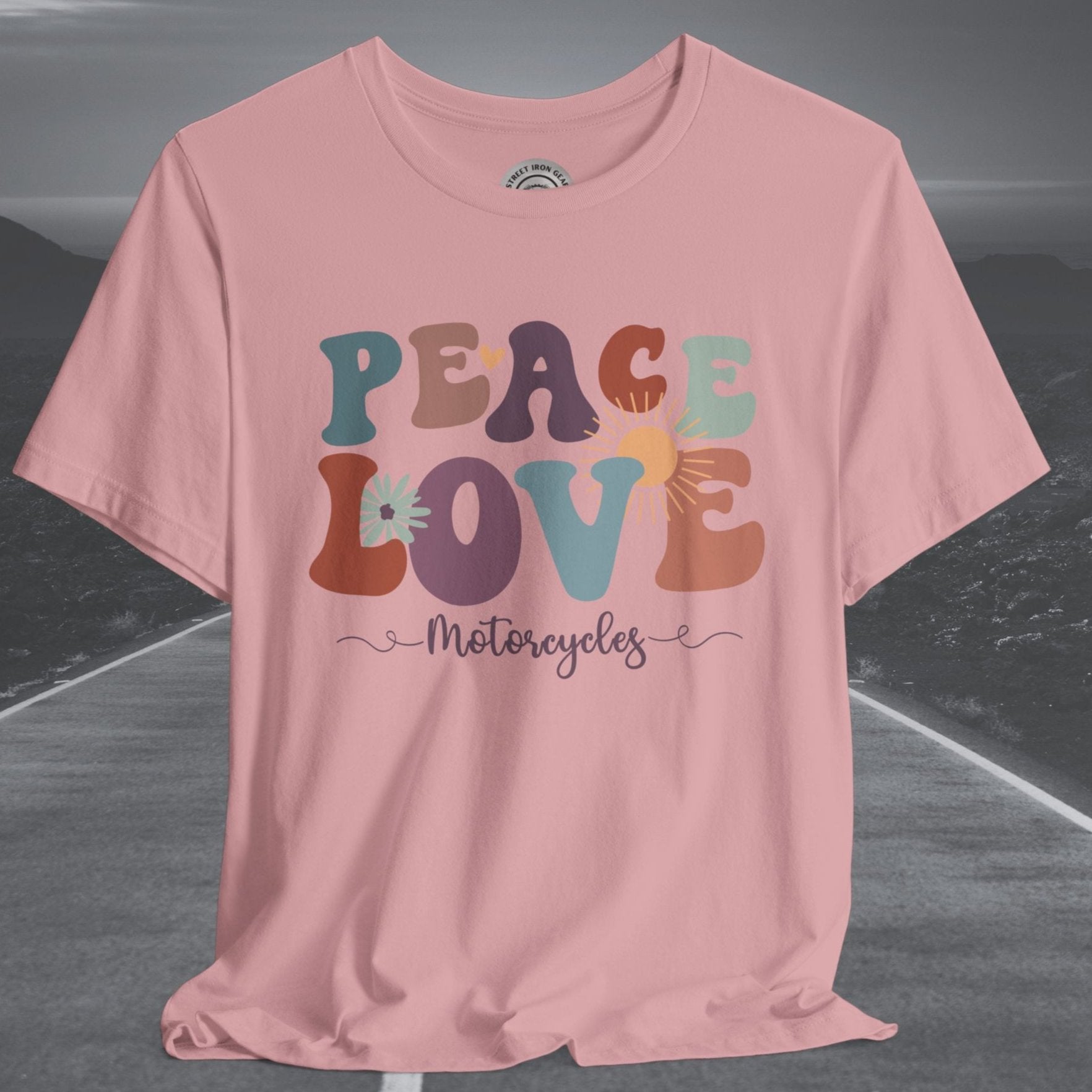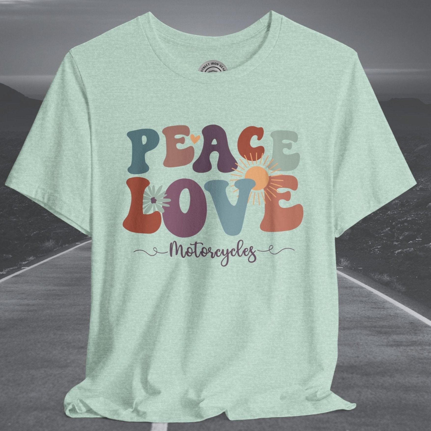 Embrace your love for the open road with our Ladies Motorcycle Crew Neck T-Shirt, featuring a retro boho style design that reads "Peace. Love. Motorcycles" in beautiful script. Adorned with boho-style flowers and sun elements in a classic boho color scheme, this shirt is the perfect blend of vintage flair and motorcycle passion. Soft, comfortable, and stylish, it's ideal for casual rides, rallies, or everyday wear for the free-spirited biker.