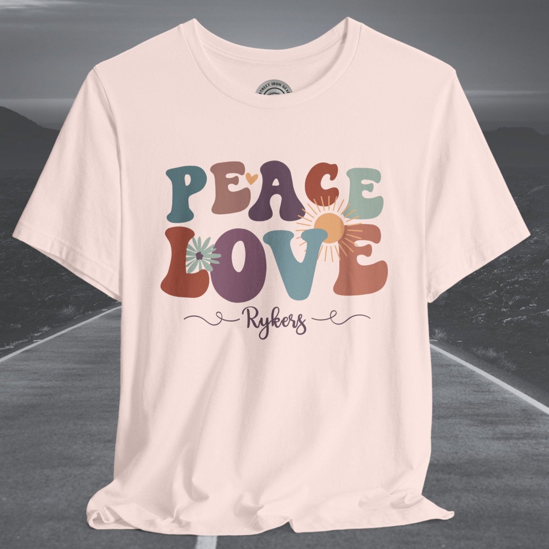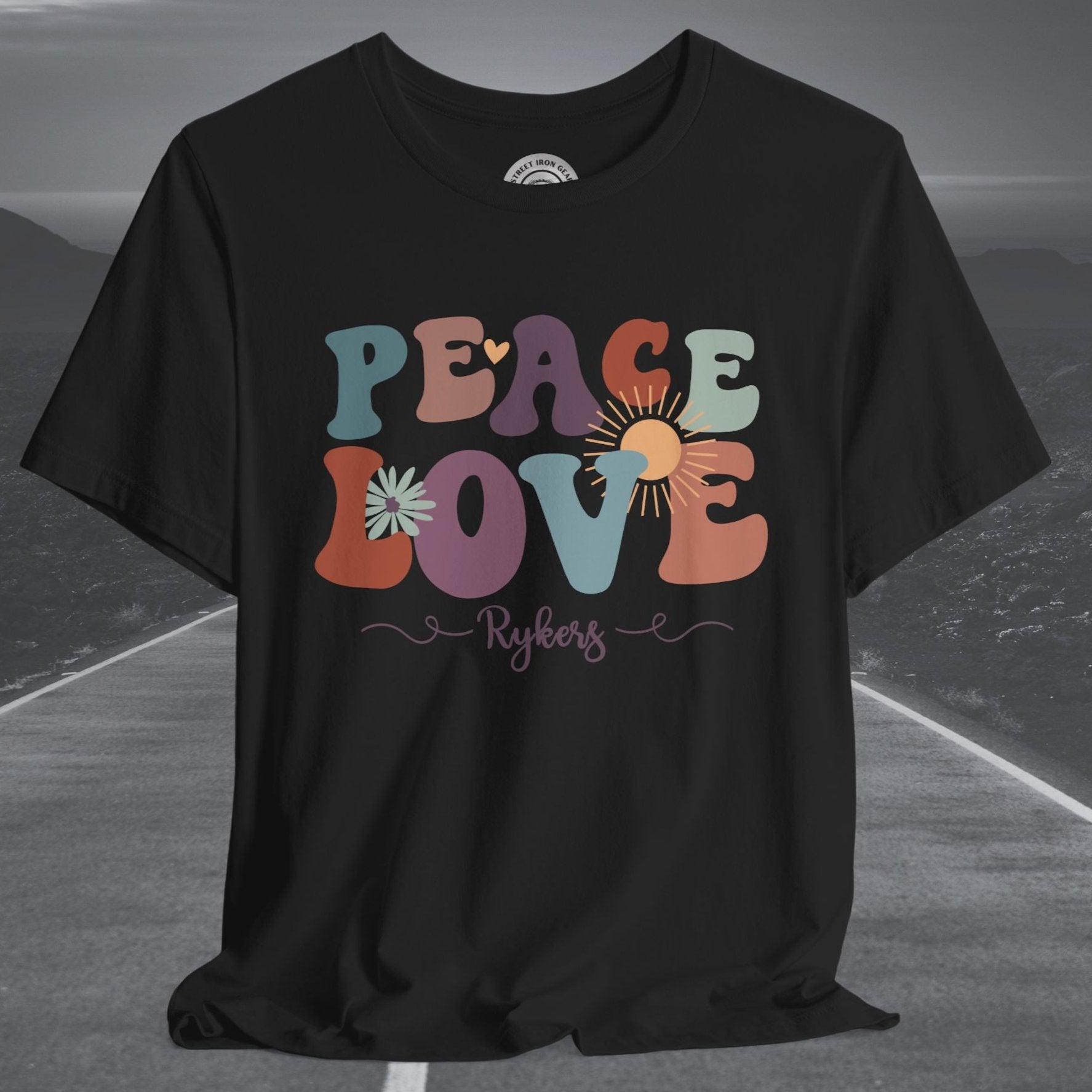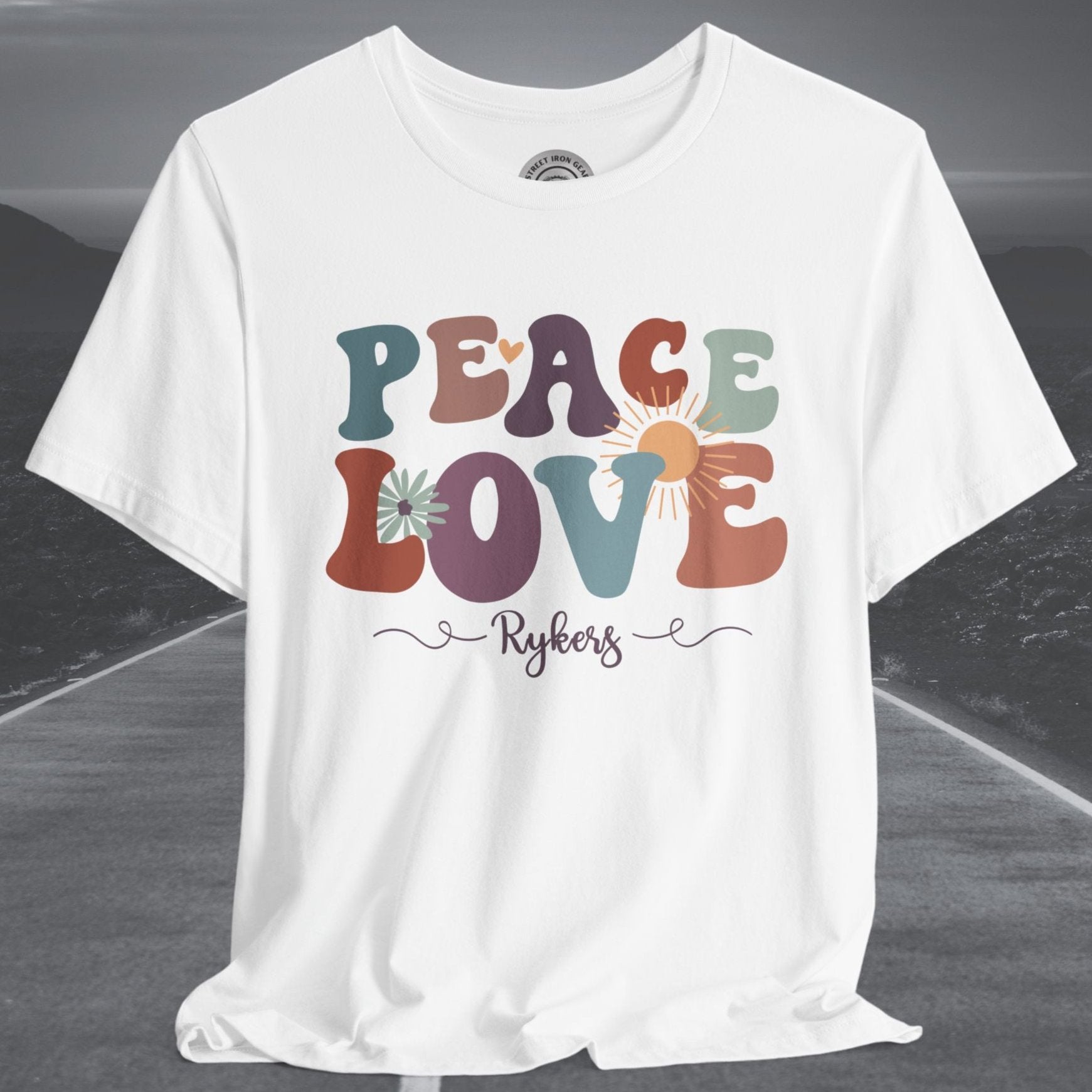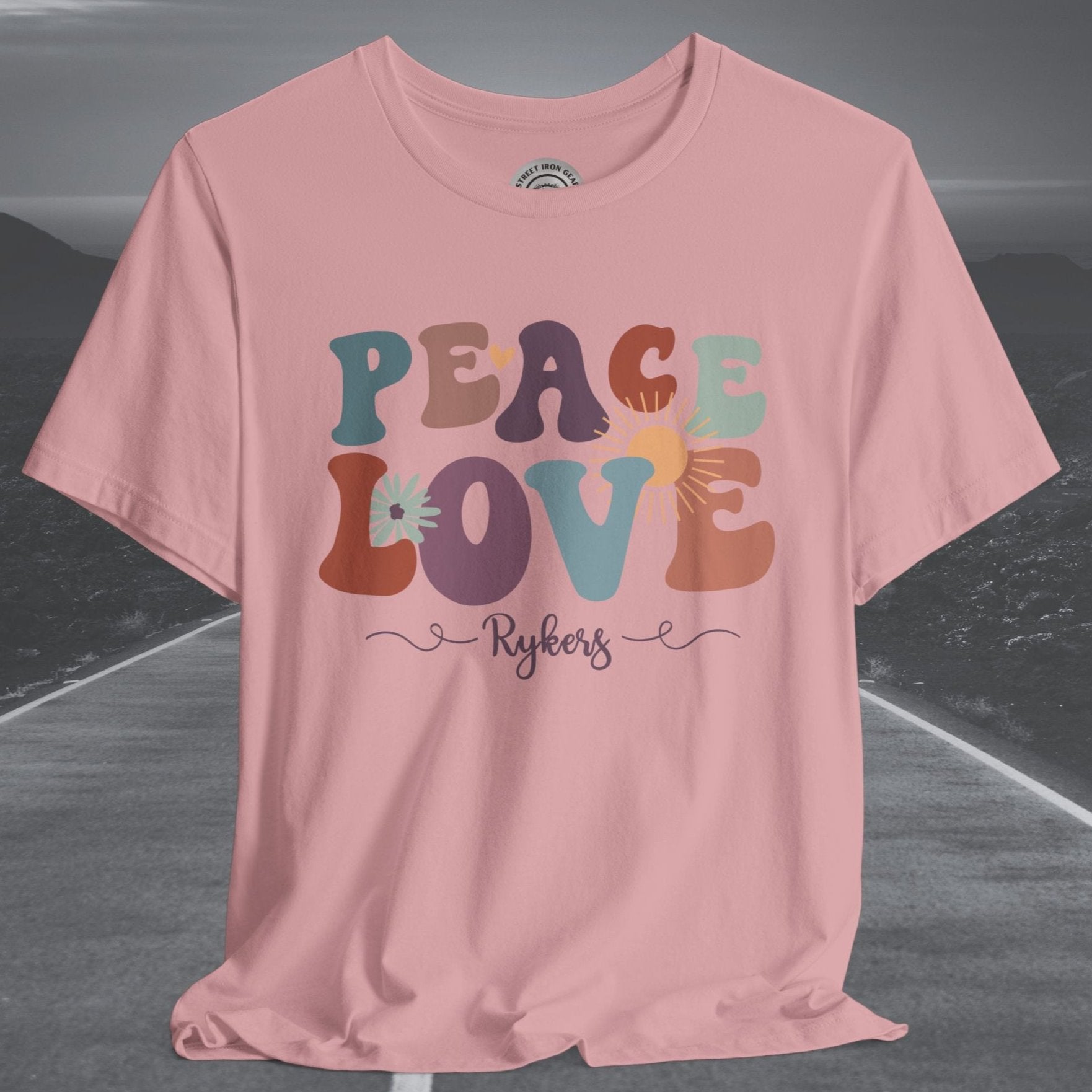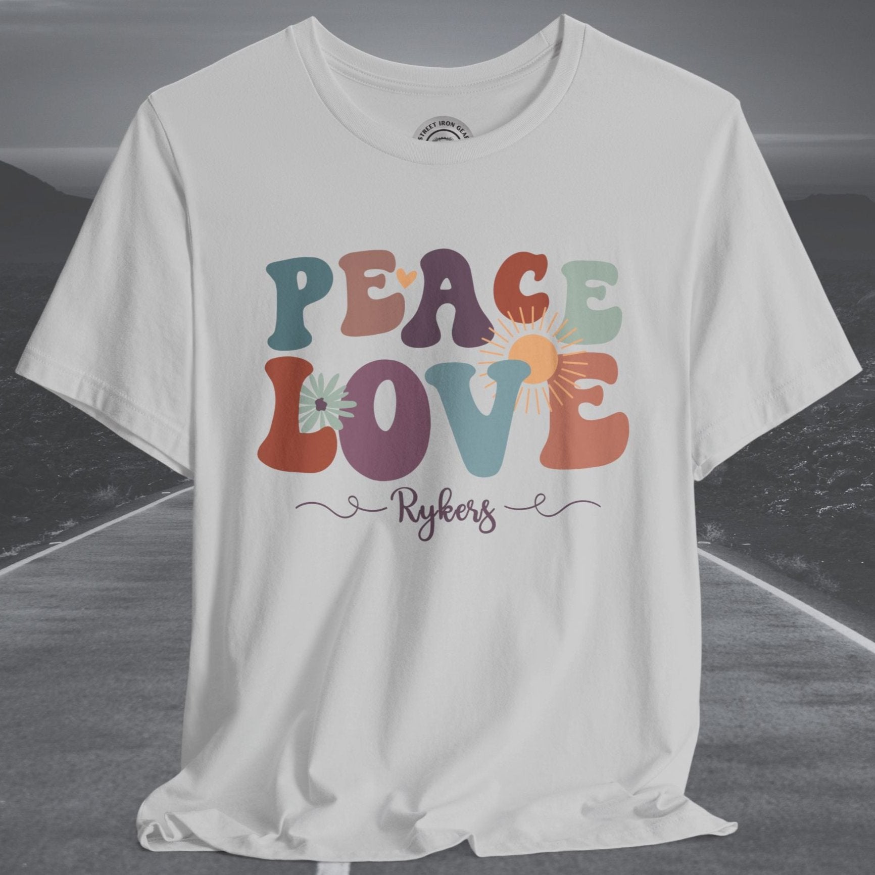 Ladies Retro Peace Love Rykers Crew Neck TShirt