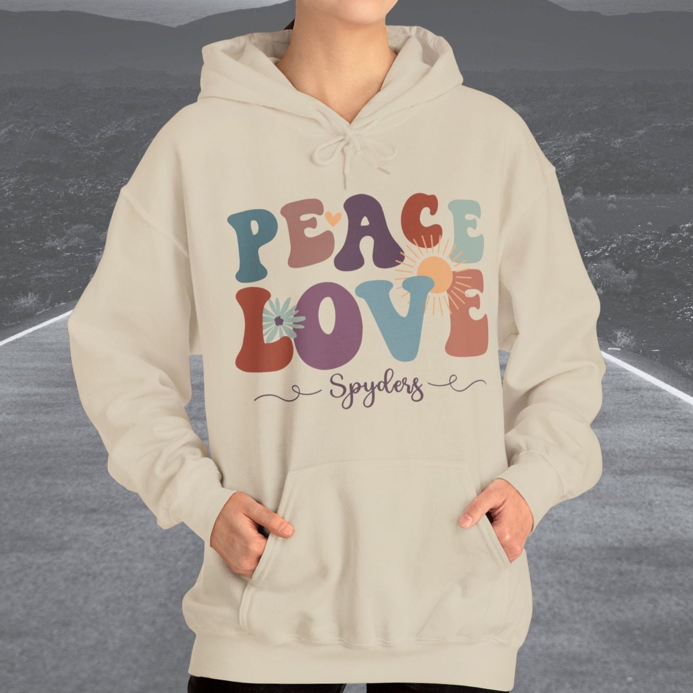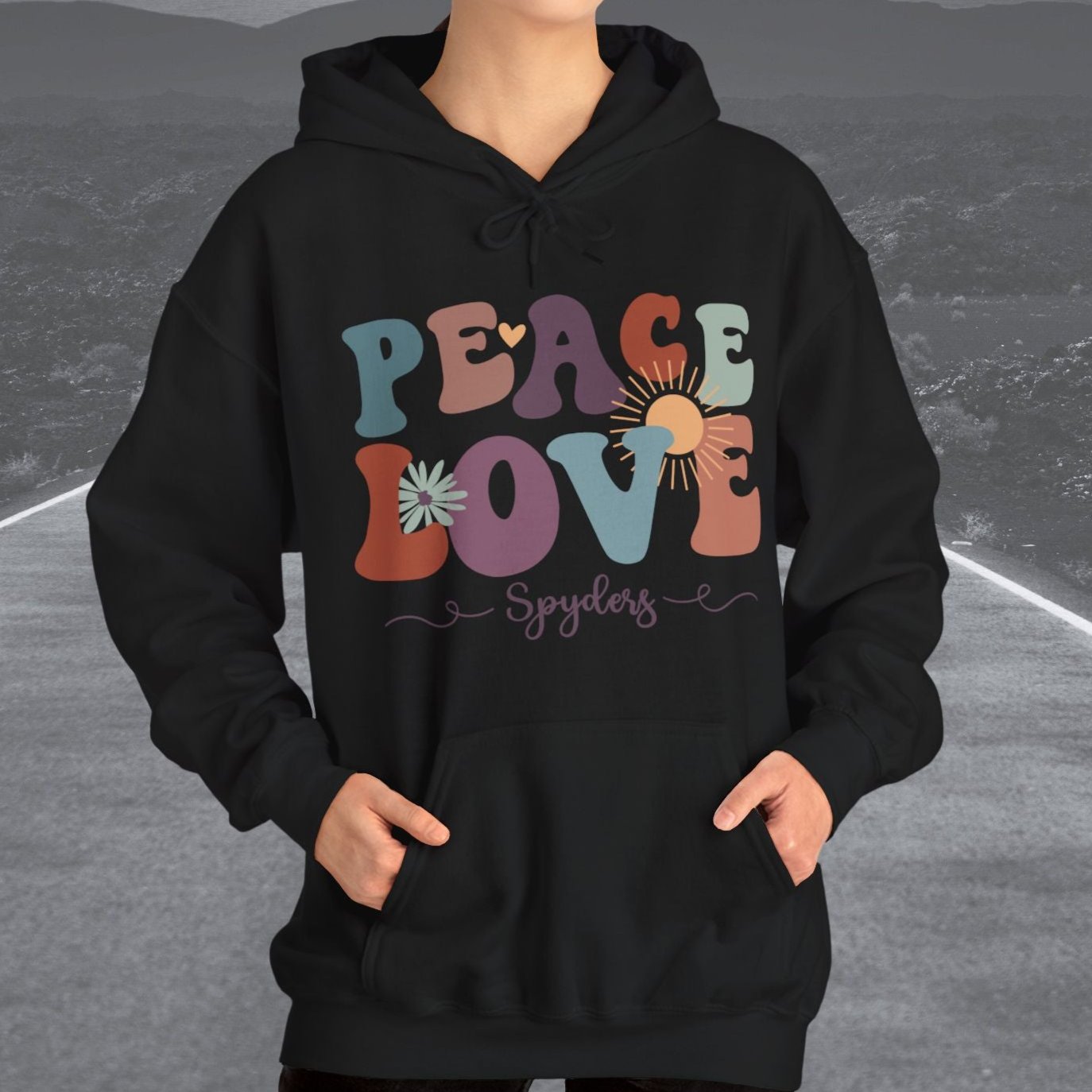 Embrace the open road in style with our Ladies Can-Am Spyder hooded sweatshirt, featuring a retro boho design that reads "Peace. Love. Spyders." in a playful mix of fonts. Complete with boho-style flowers and sun elements, this hoodie is designed in a traditional boho color scheme, perfect for those who love adventure and freedom. Soft and comfortable, this unique heavy weight shirt is a must-have for any Can-Am Spyder rider looking to combine her love for riding with chic, bohemian v