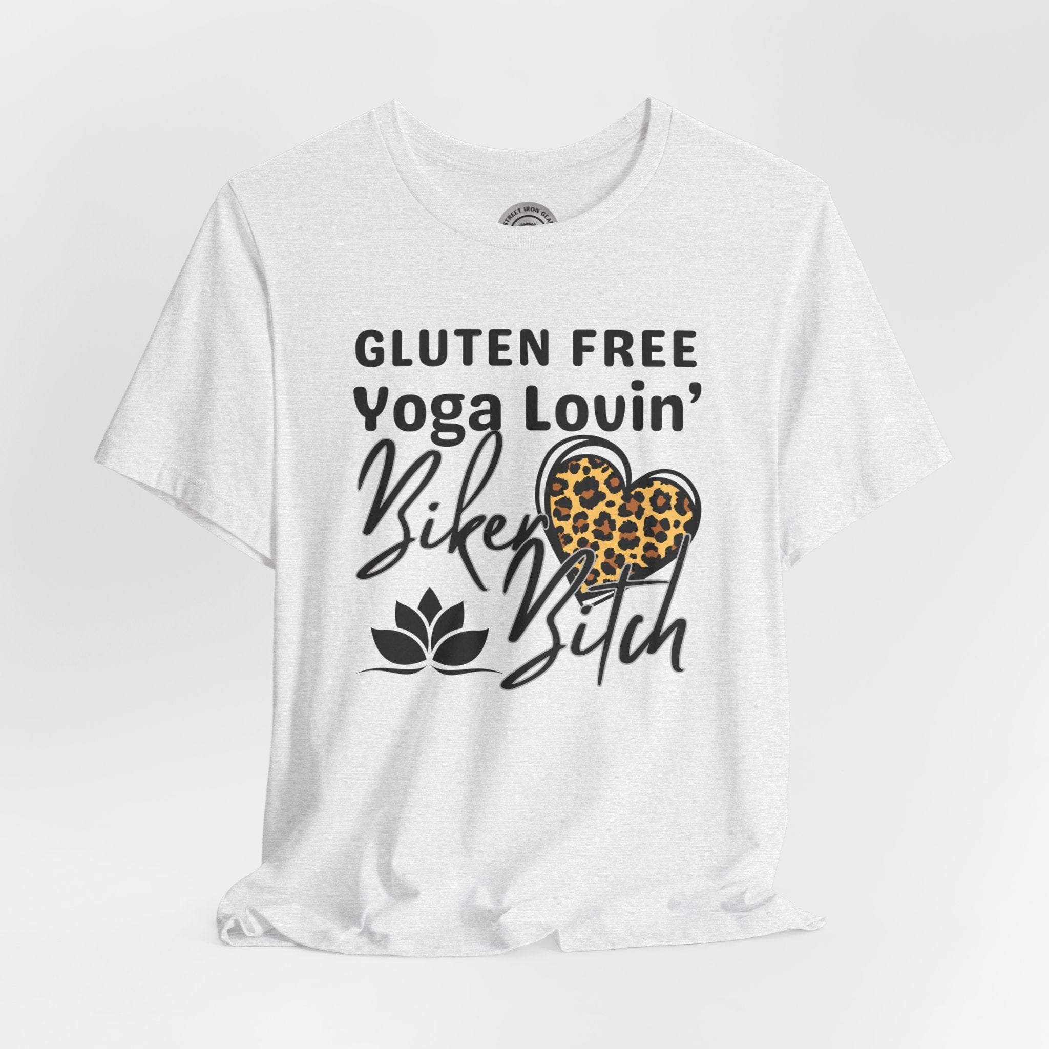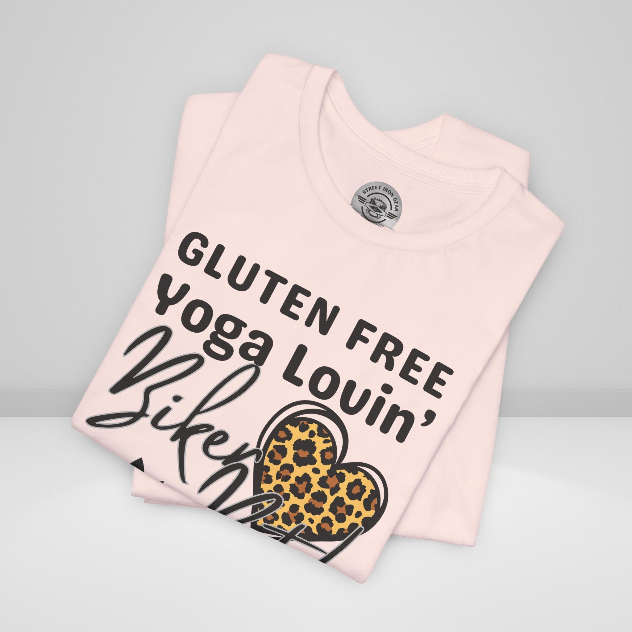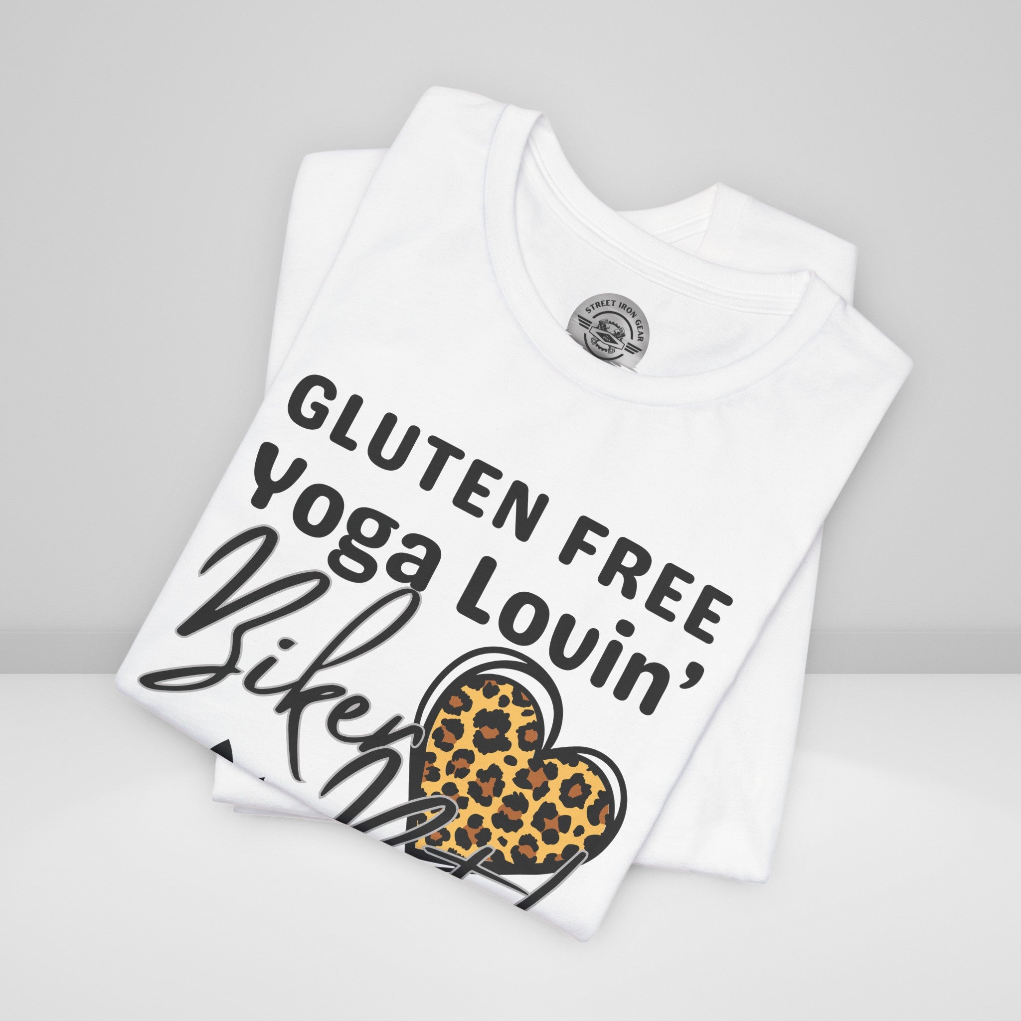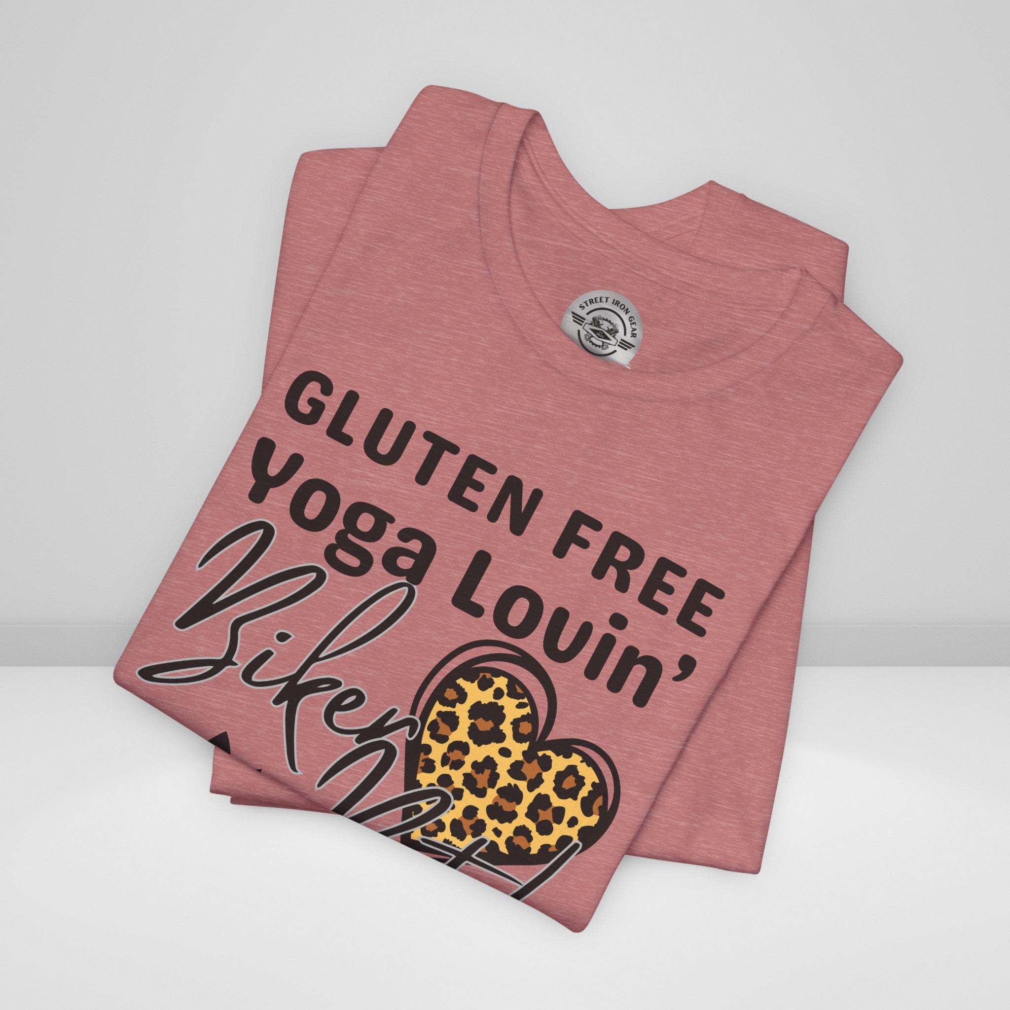 Embrace your unique blend of free-spirited vibes with our Women's Motorcycle Tee. Featuring a striking lotus flower and leopard print boho heart, this shirt celebrates the gluten-free, yoga-loving, and unapologetically adventurous biker spirit.