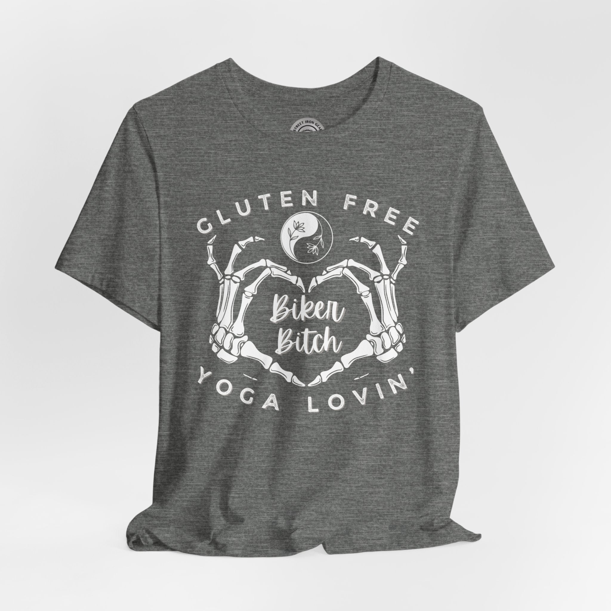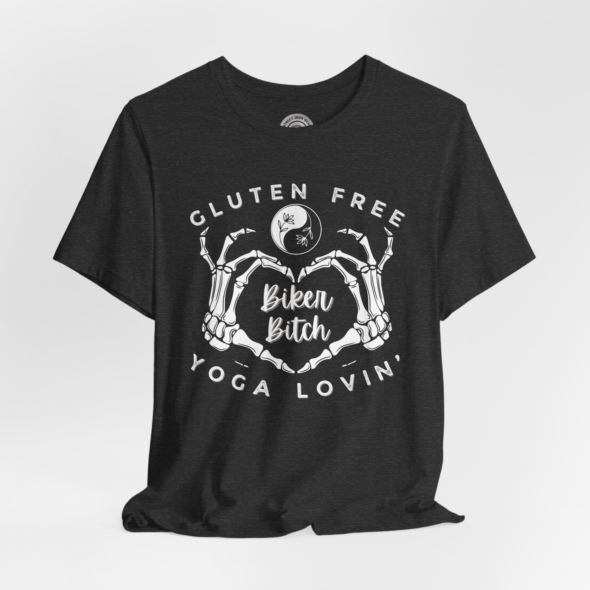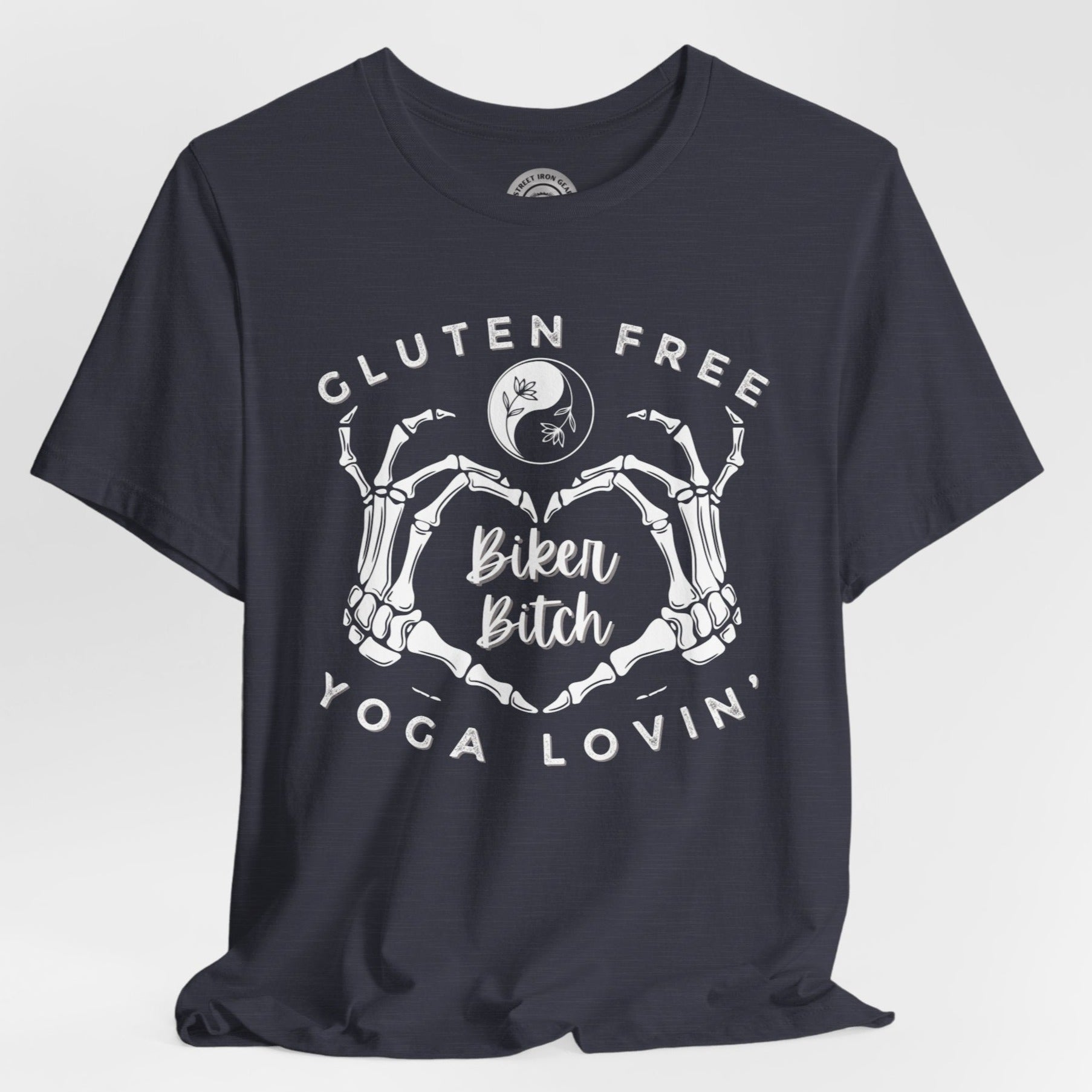 Embrace your unique blend of free-spirited vibes with our Women's Motorcycle Tee. Featuring a skeleton heart, this shirt celebrates the gluten-free, yoga-loving, and unapologetically adventurous biker spirit.