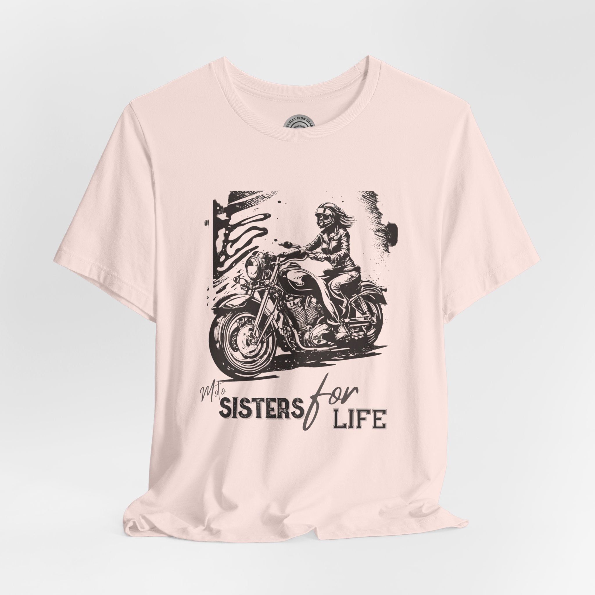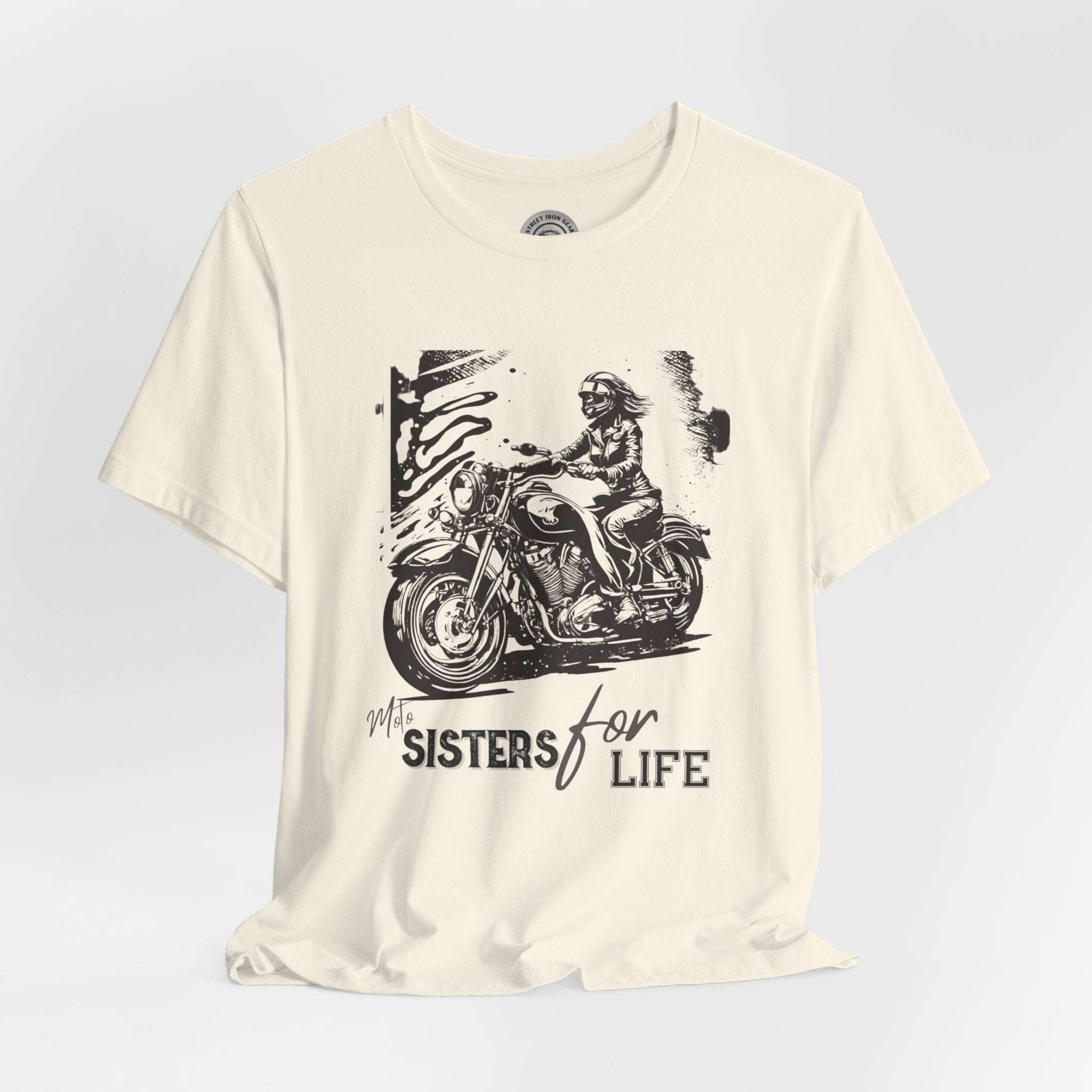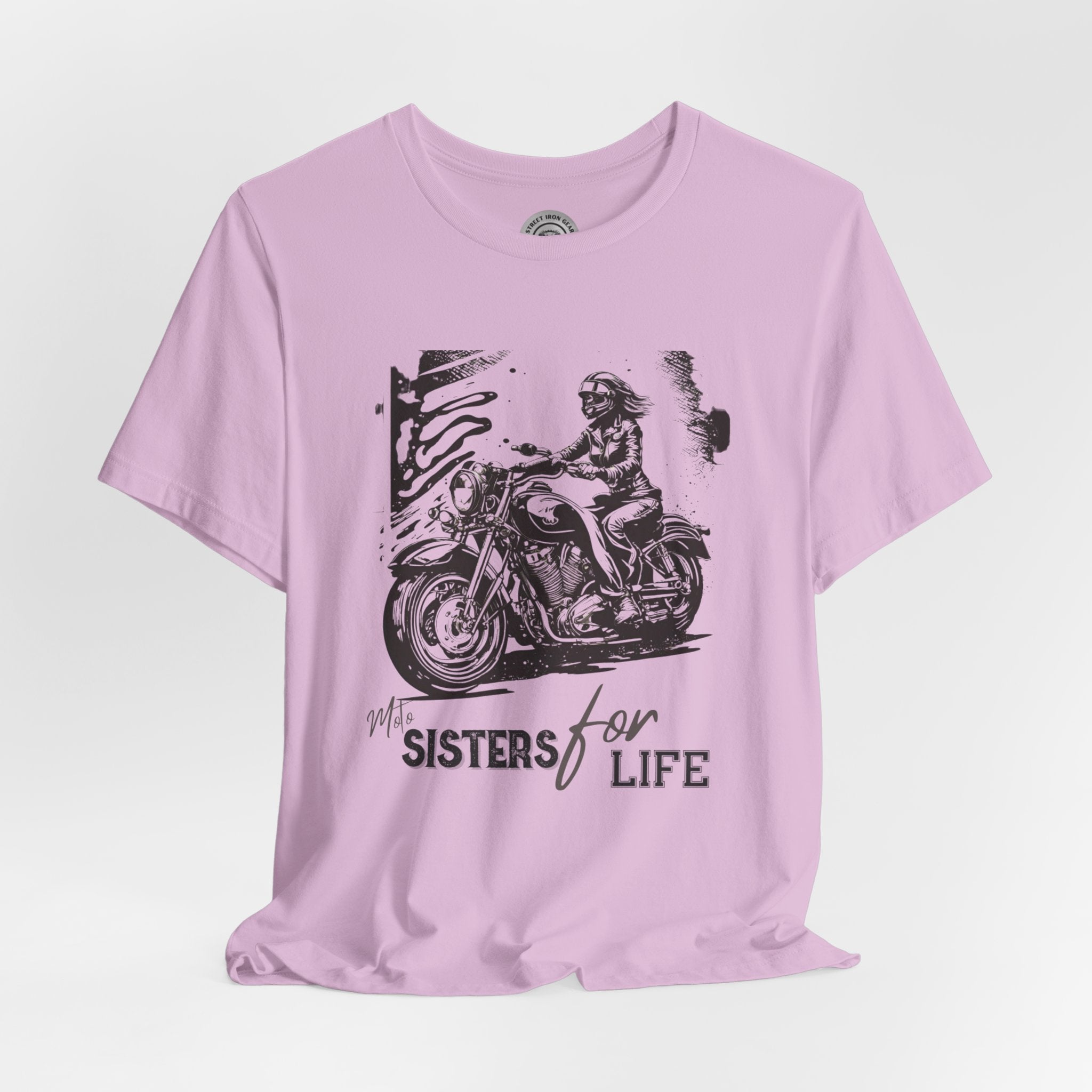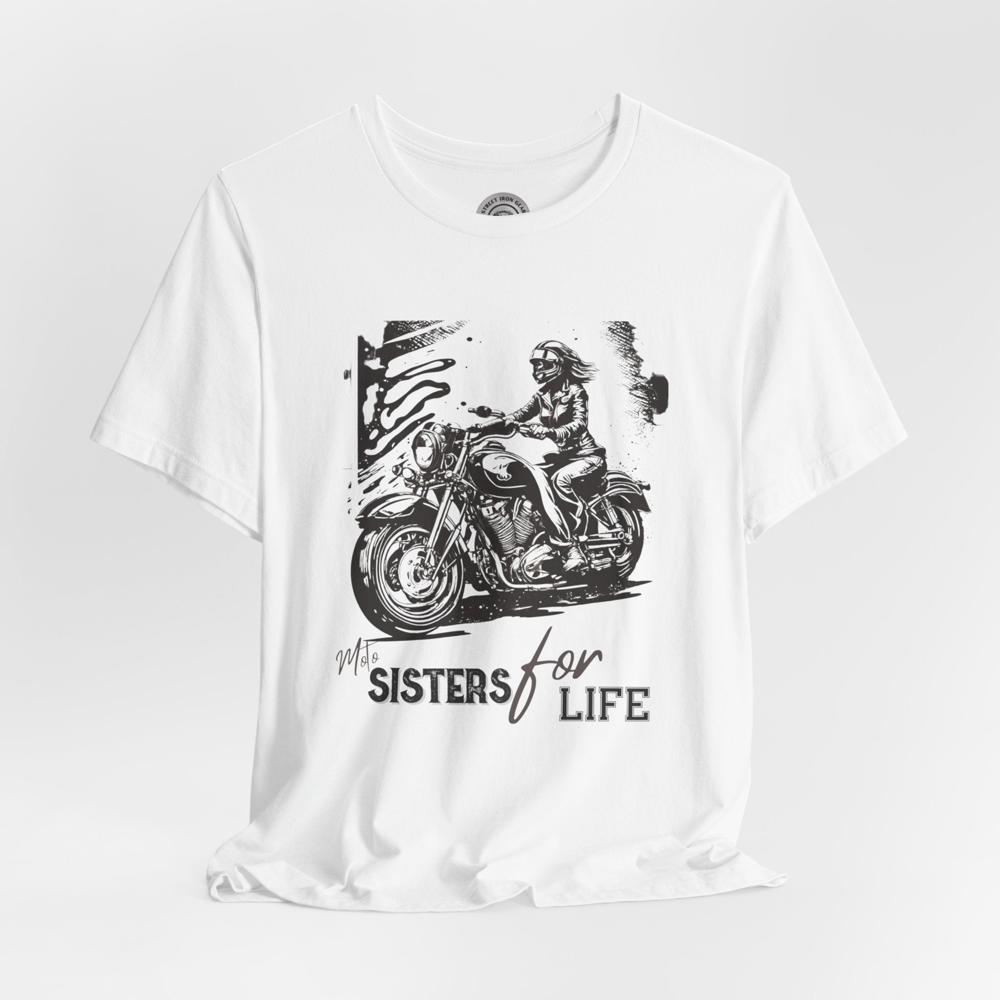 Rev up your style with our Women's Motorcycle T-shirt! It proudly reads "Moto Sisters for Life" and features a fierce woman riding a motorcycle with her hair flowing in the wind.