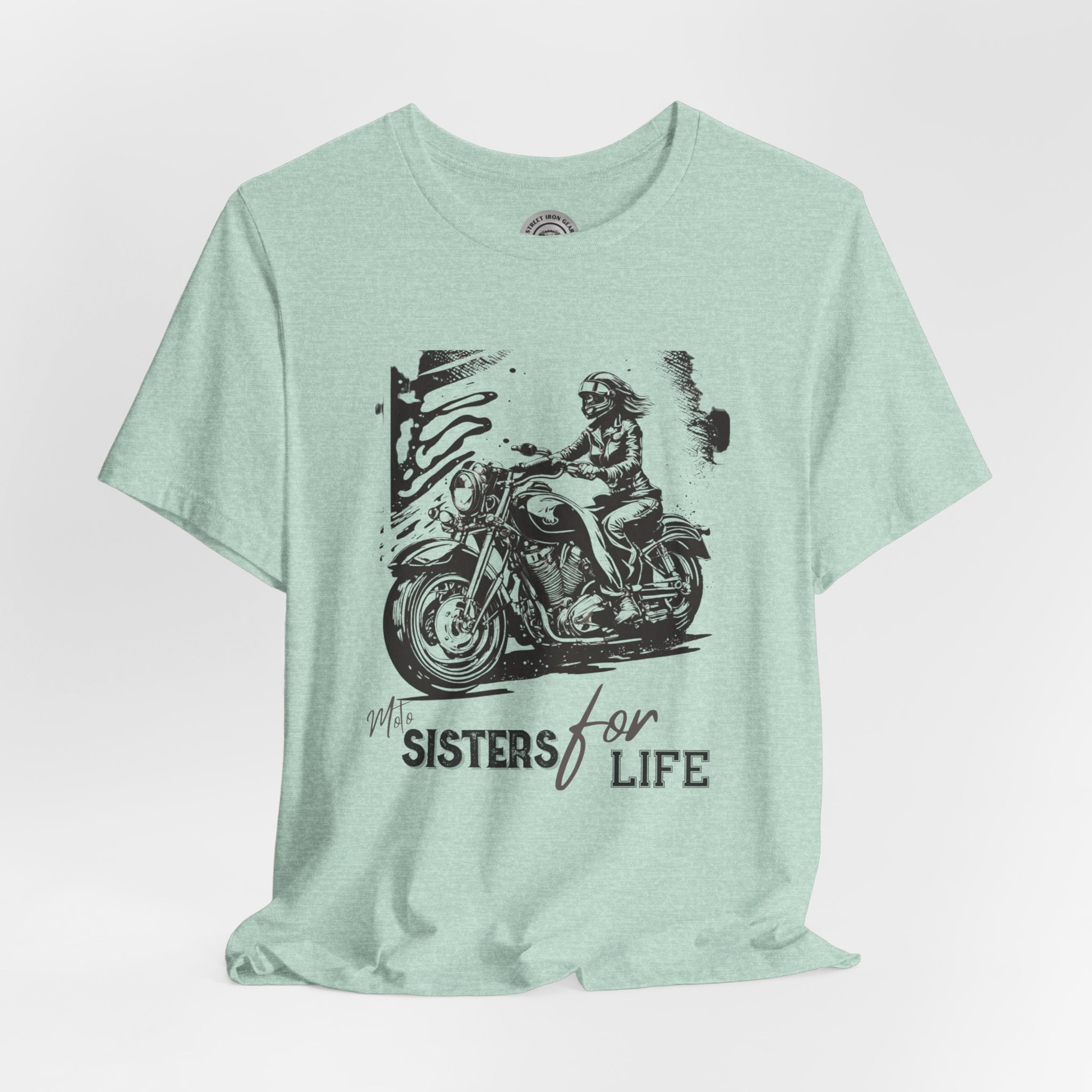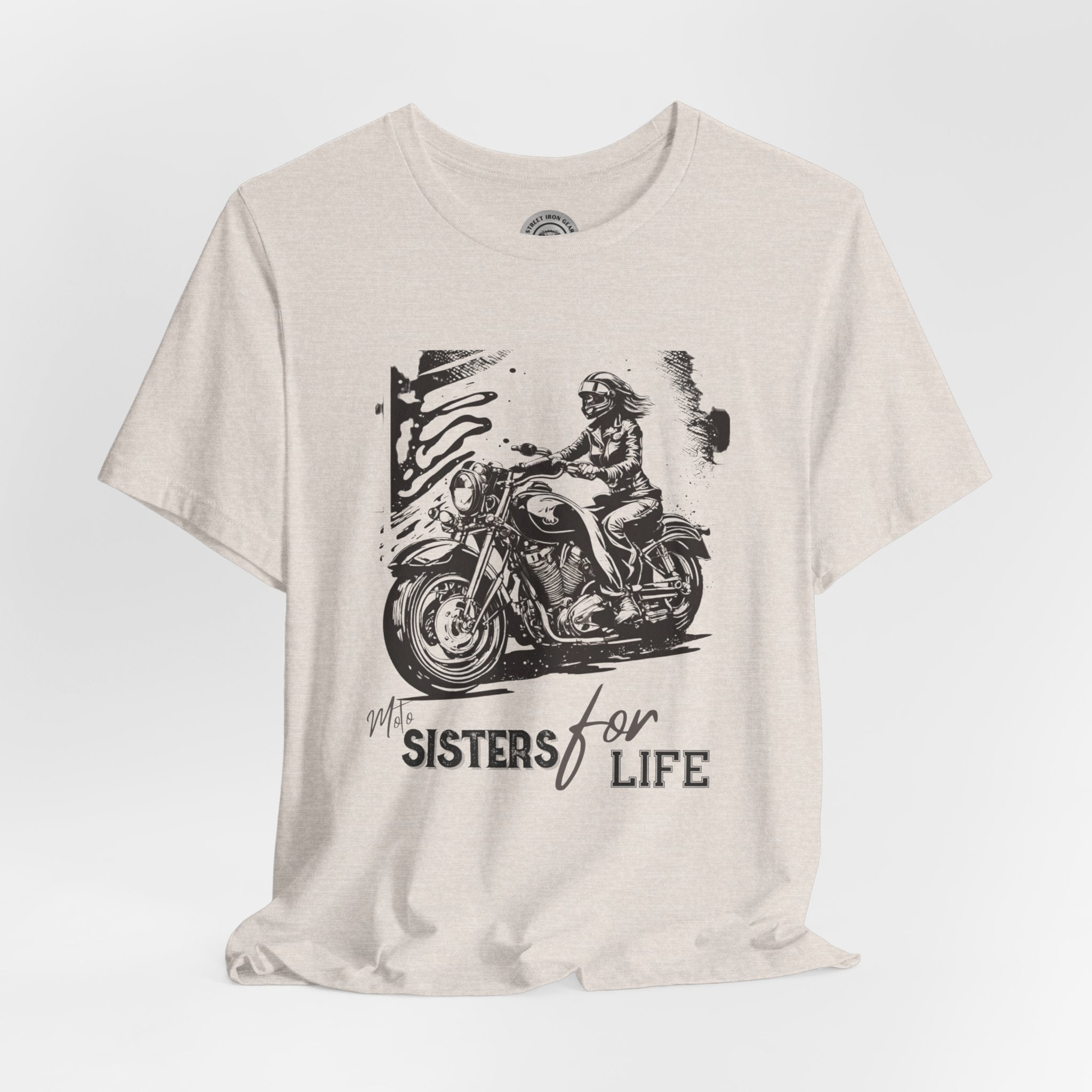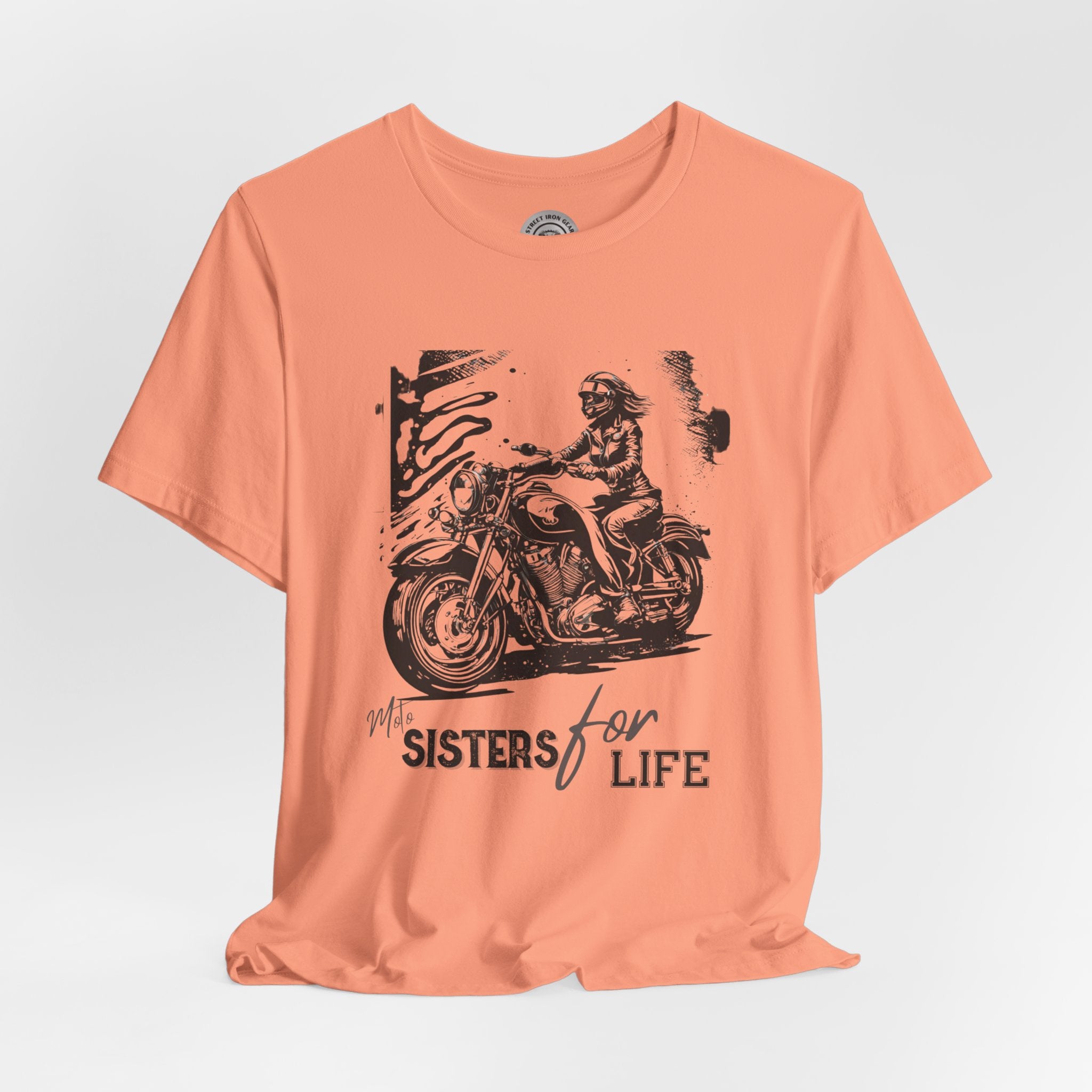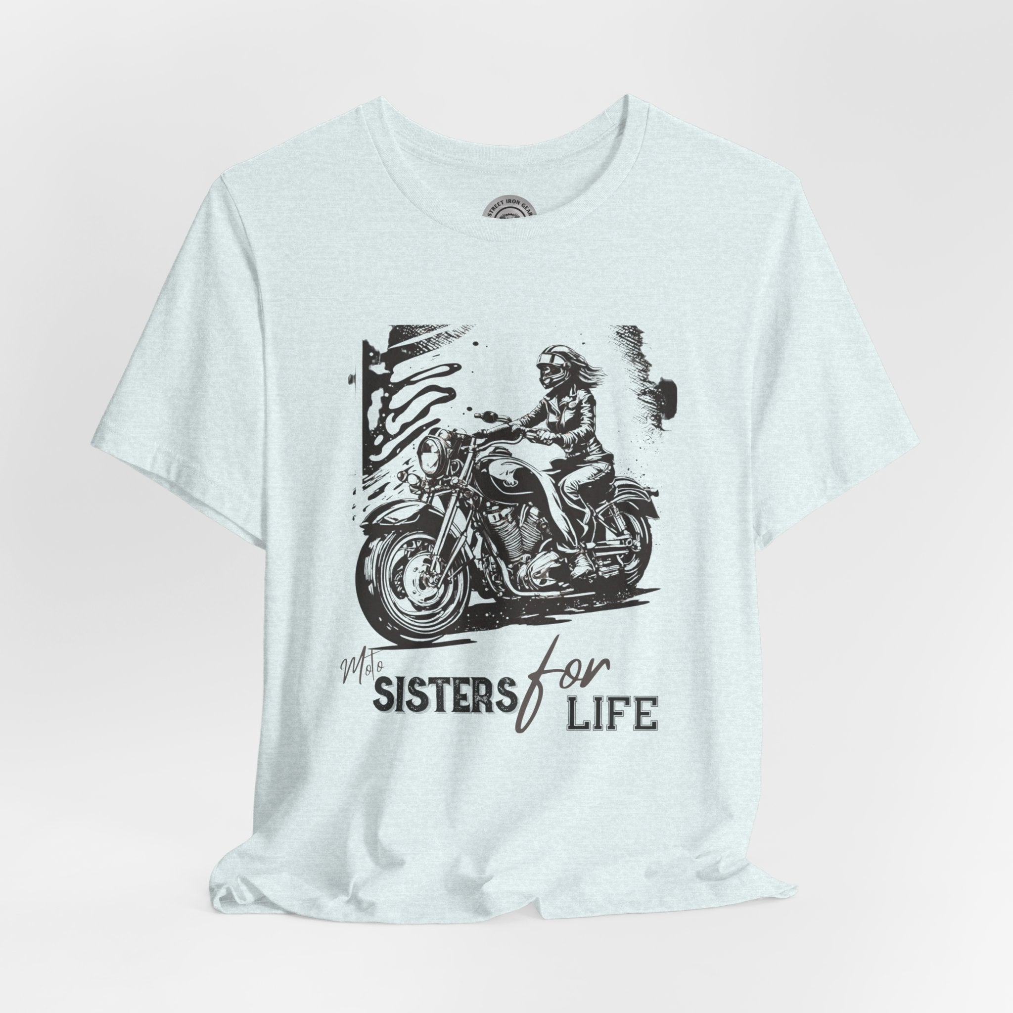 Rev up your style with our Women's Motorcycle T-shirt! It proudly reads "Moto Sisters for Life" and features a fierce woman riding a motorcycle with her hair flowing in the wind.