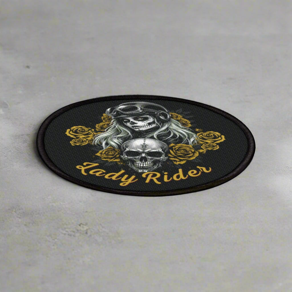 Show off your fierce side with our Lady Rider Biker Patch, designed especially for bold women who ride! This printed biker patch features a stunning biker girl design surrounded by detailed skulls and gold roses, accented in black, gray, gold, and white tones for a classic yet edgy look. Perfect for jackets, vests, or saddlebags, this high-quality motorcycle patch for women is a must-have for any lady who lives for the open road. Whether you're customizing your gear or searching for the perfect gift for a lady rider, this patch makes a powerful statement of strength, freedom, and biker pride.