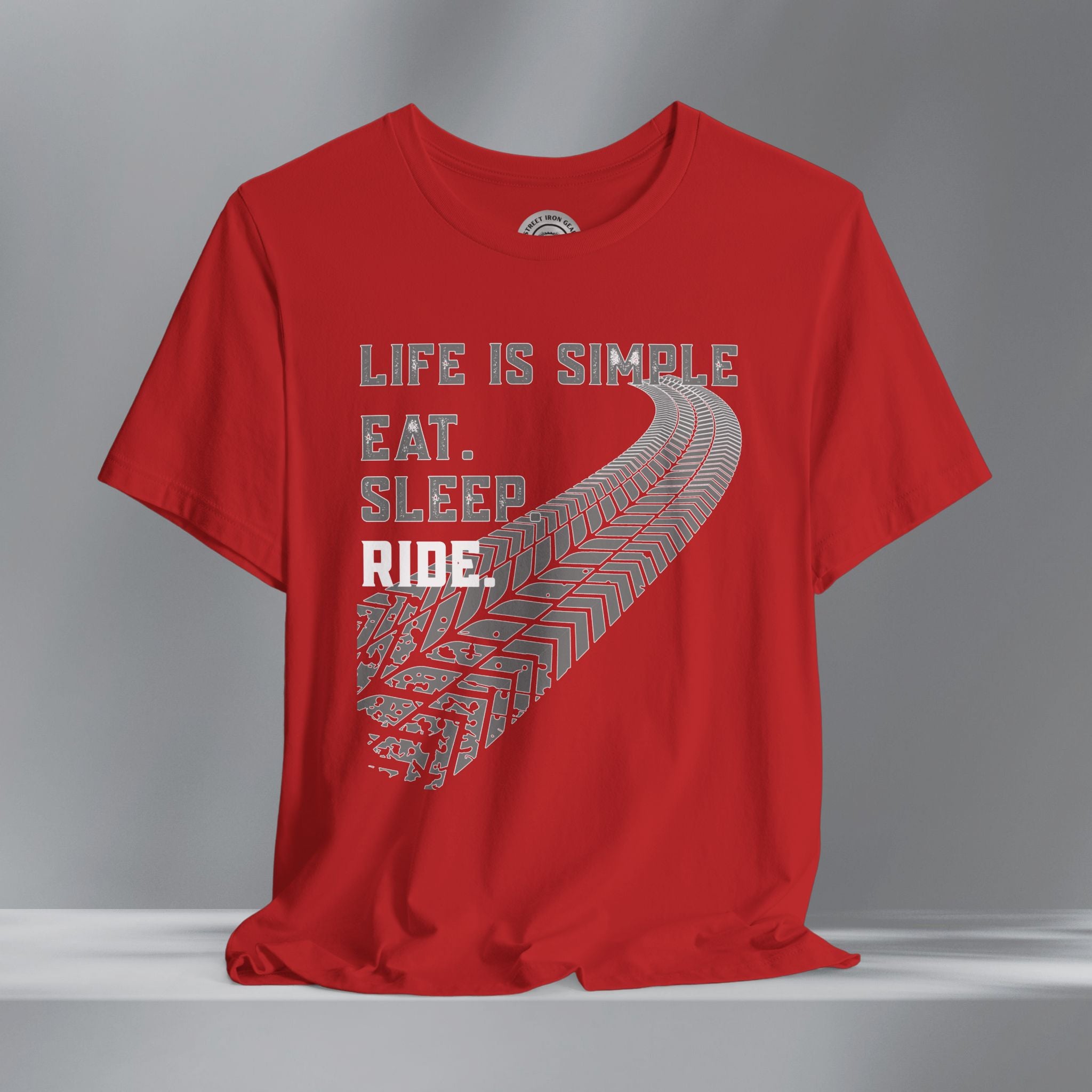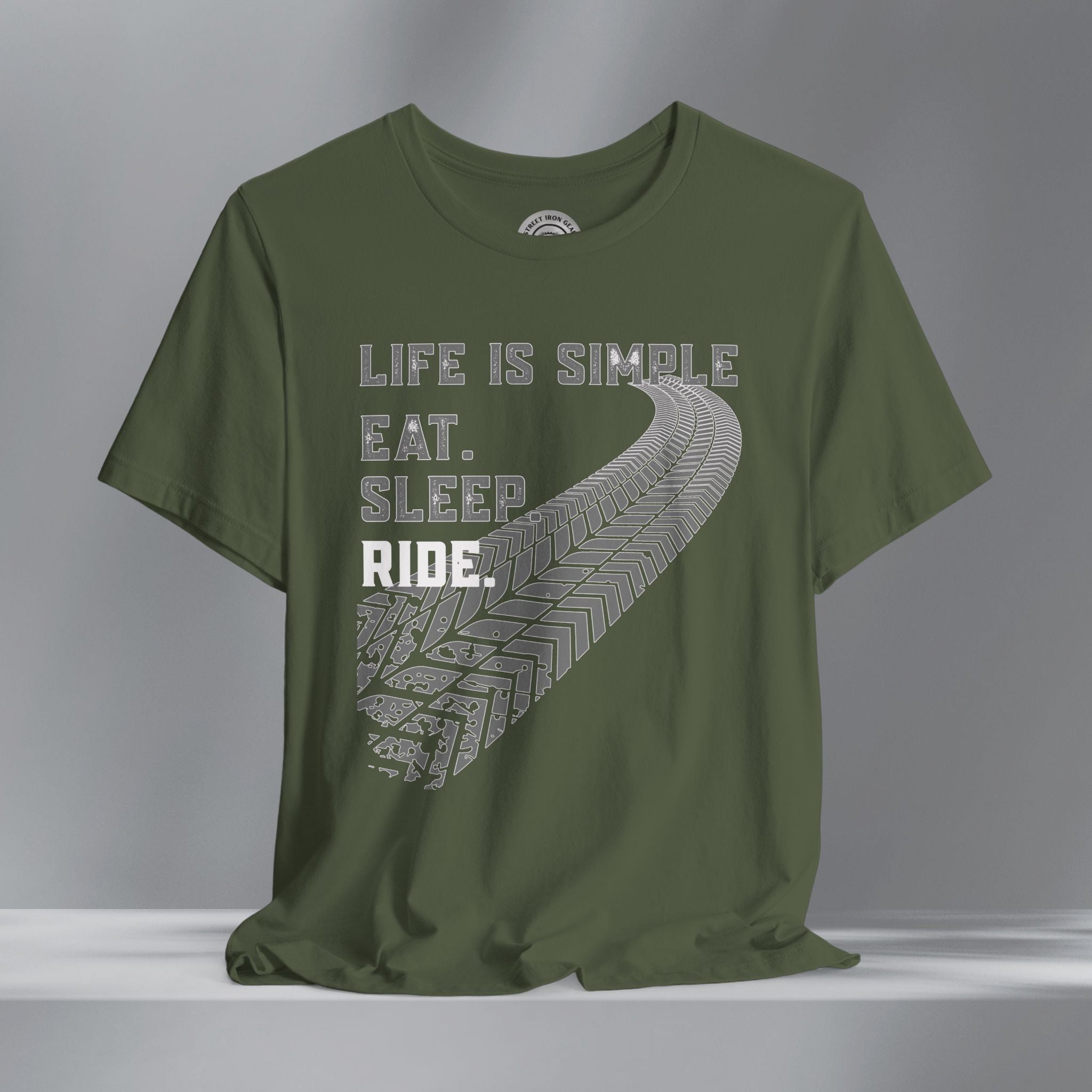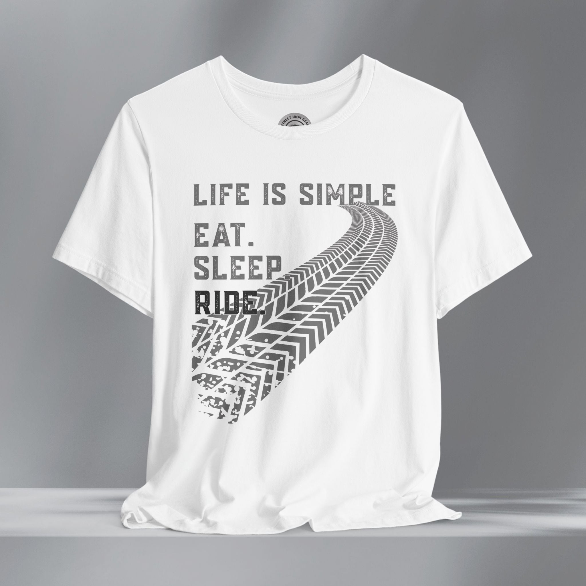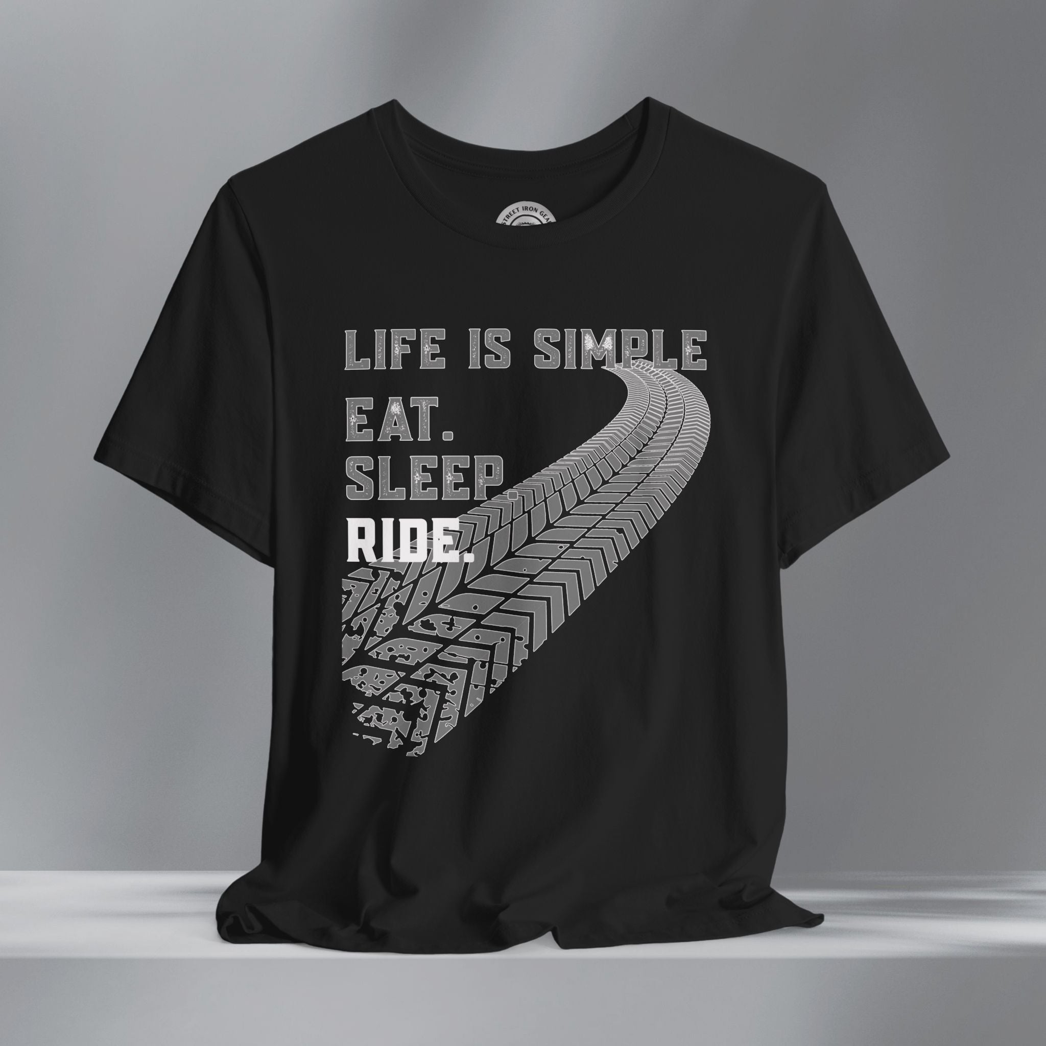 Keep your mindset on the road with our motorcycle-themed t-shirt that says it all—Life is Simple: Eat, Sleep, Ride. This bold, grunge-style design features distressed grey and white lettering paired with a massive, curved tire track across the front for a raw, rugged look riders love. Made for those who live for two wheels and open roads, this shirt is perfect for everyday wear, rallies, or weekends in the garage. Whether you're a seasoned biker or just starting your journey, this shirt makes a great gift for any motorcycle enthusiast who keeps life centered around the ride.